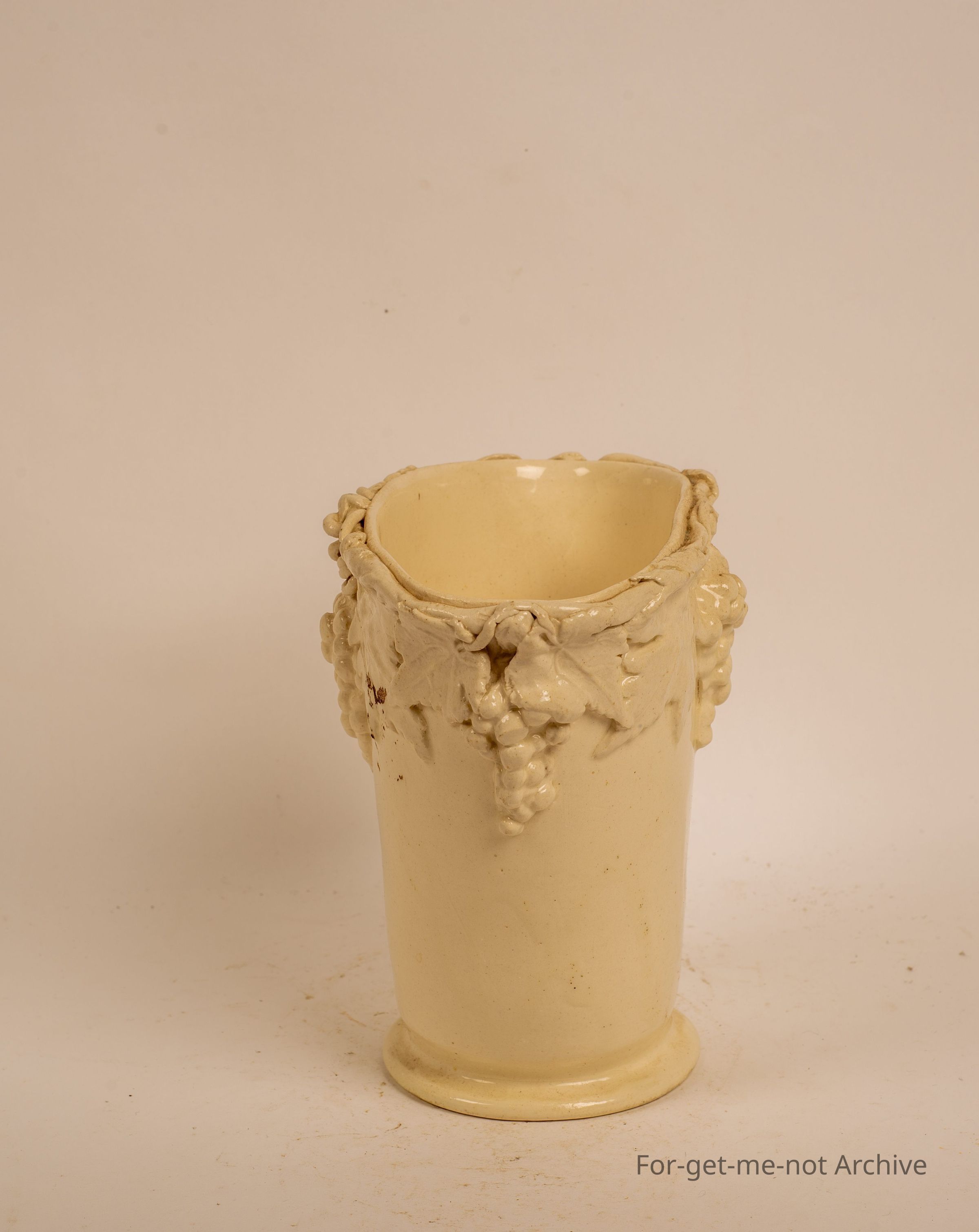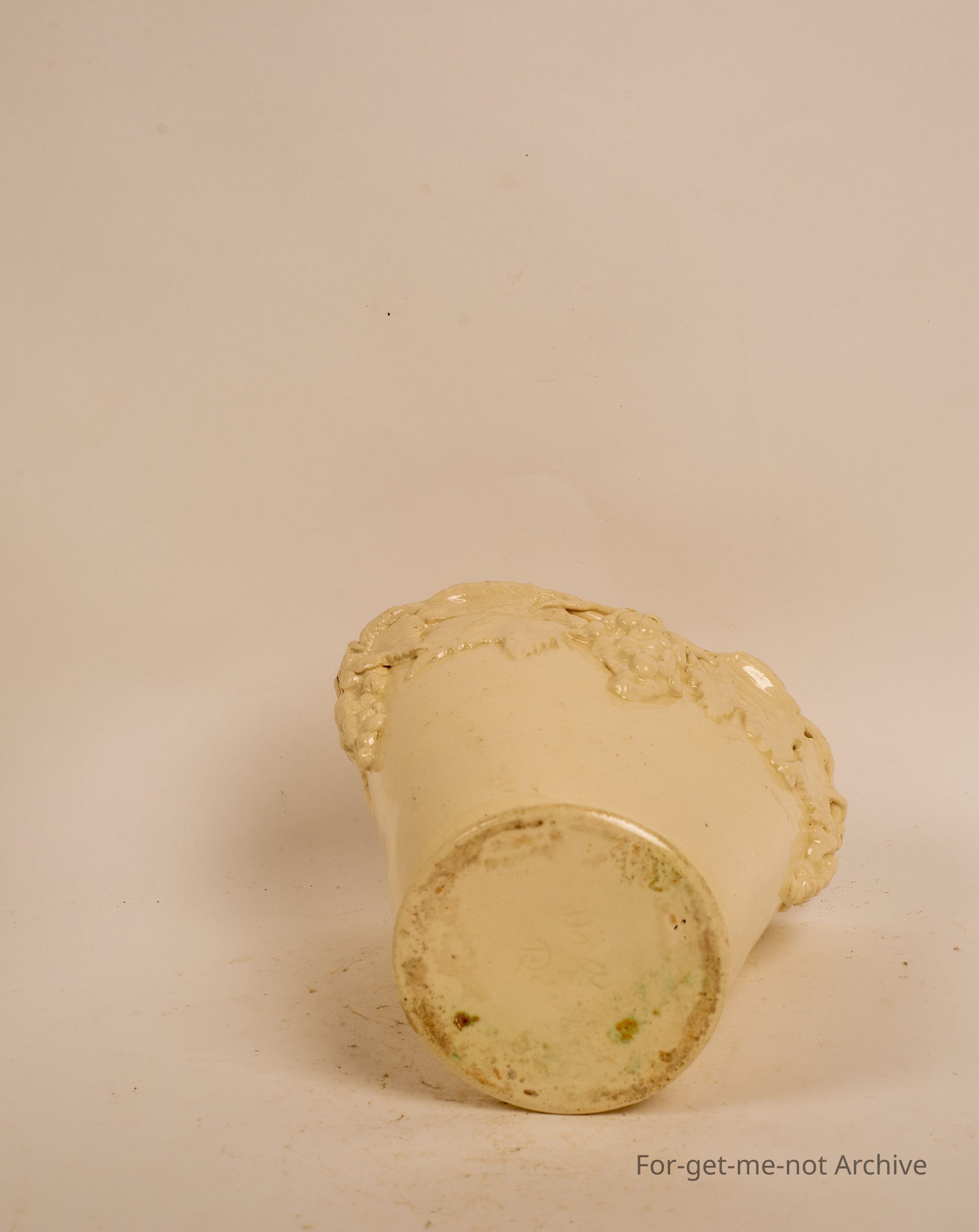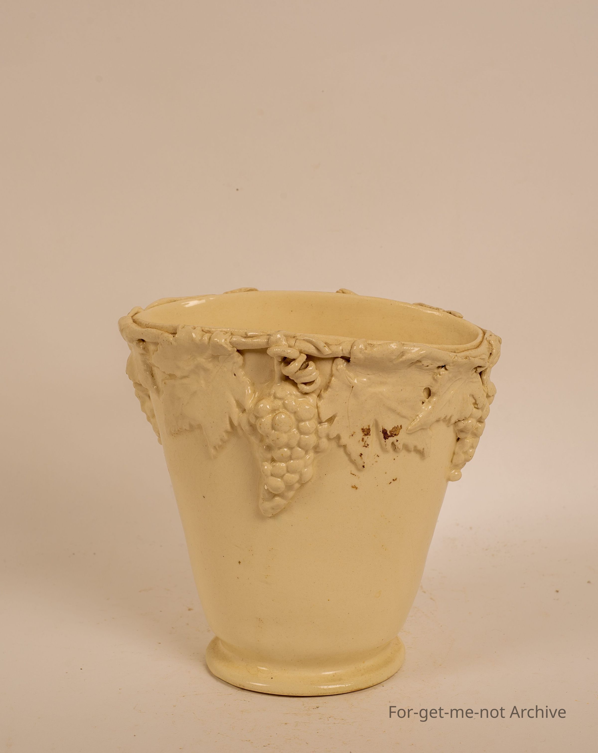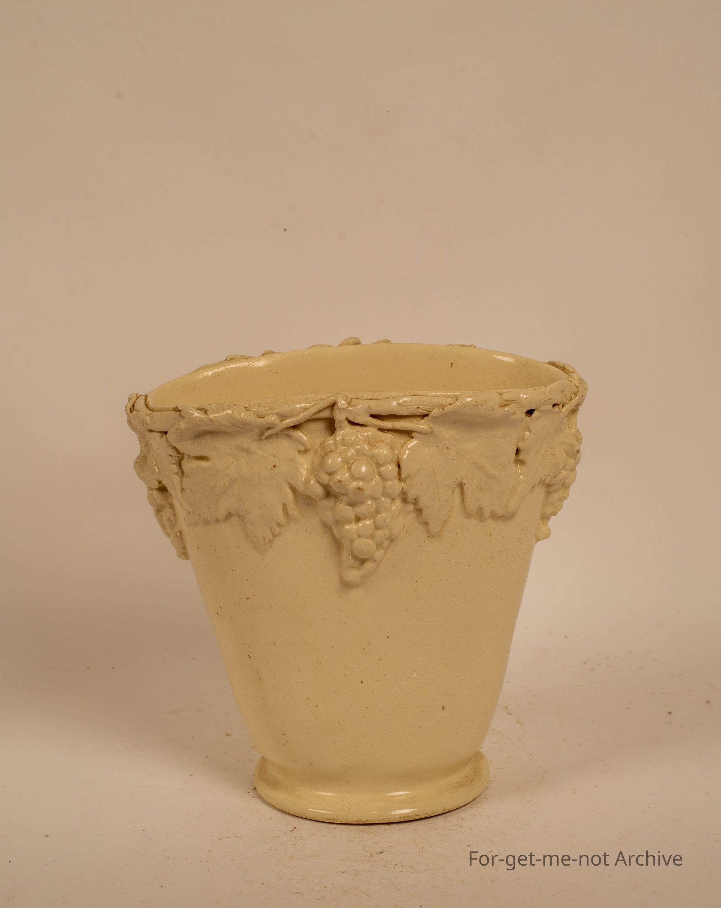 Una Deerbon inscribed on the base. Most unusual, completely in white glaze but still decorated with grapes and grape leaves. No colour other than white.