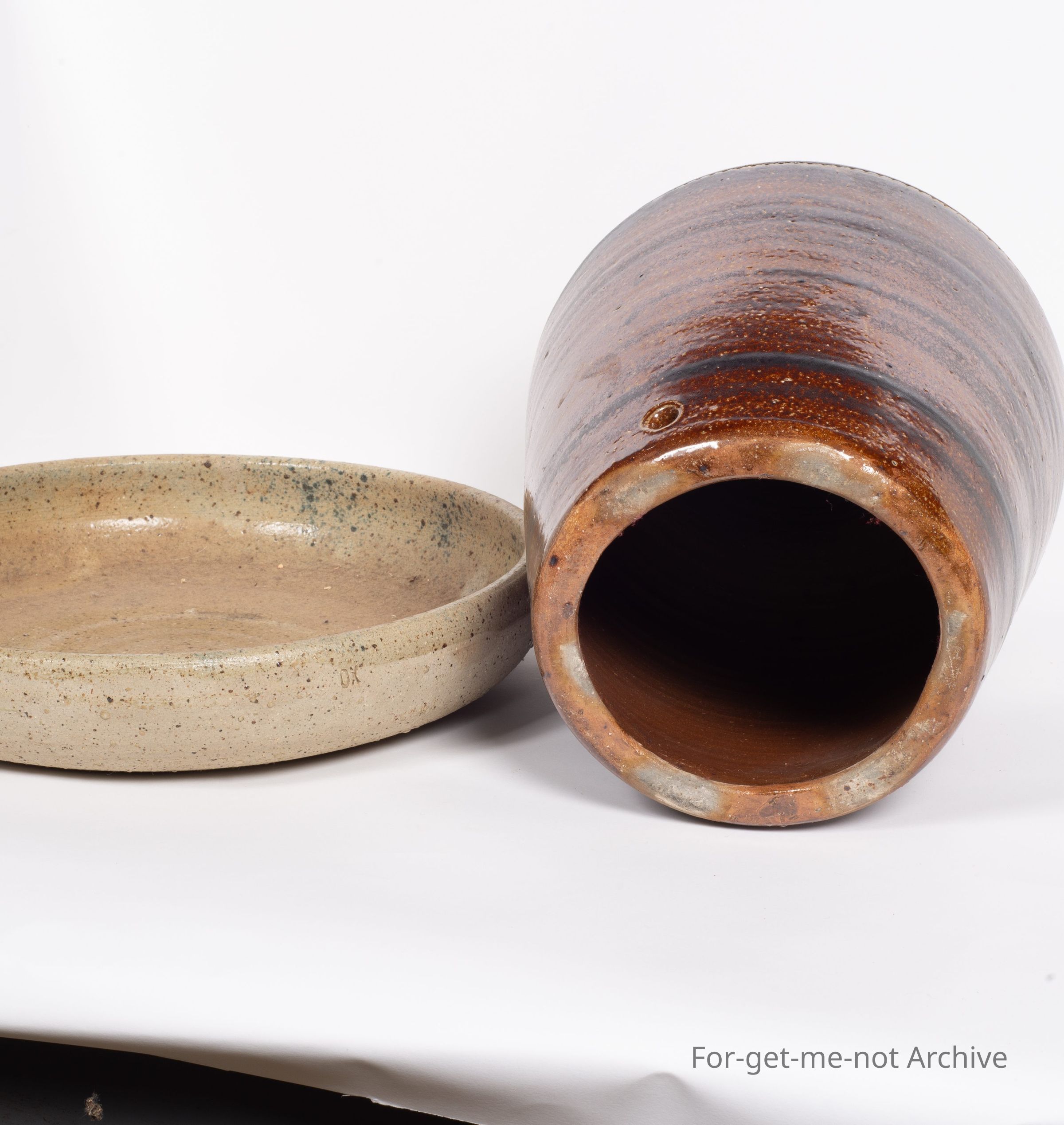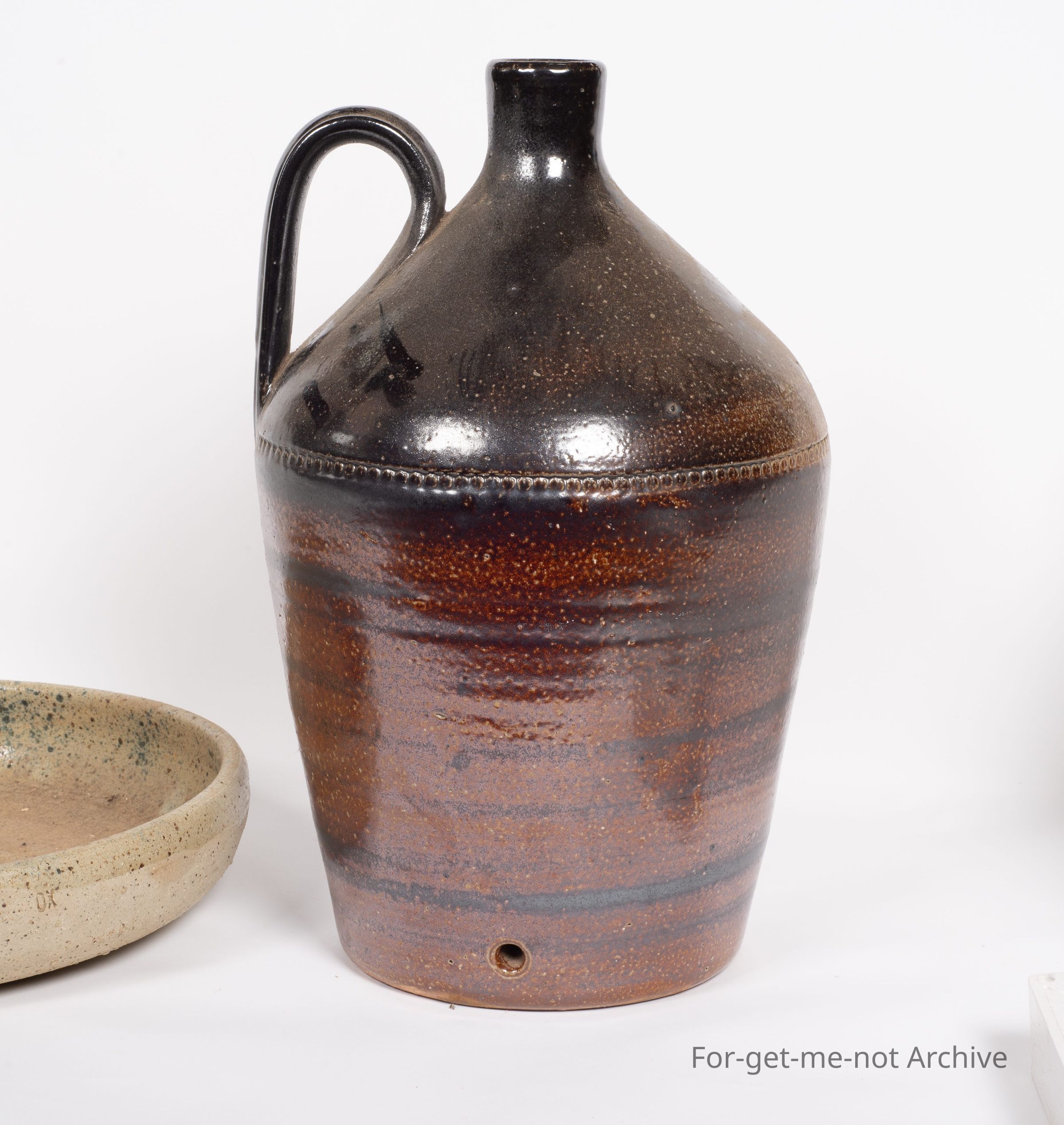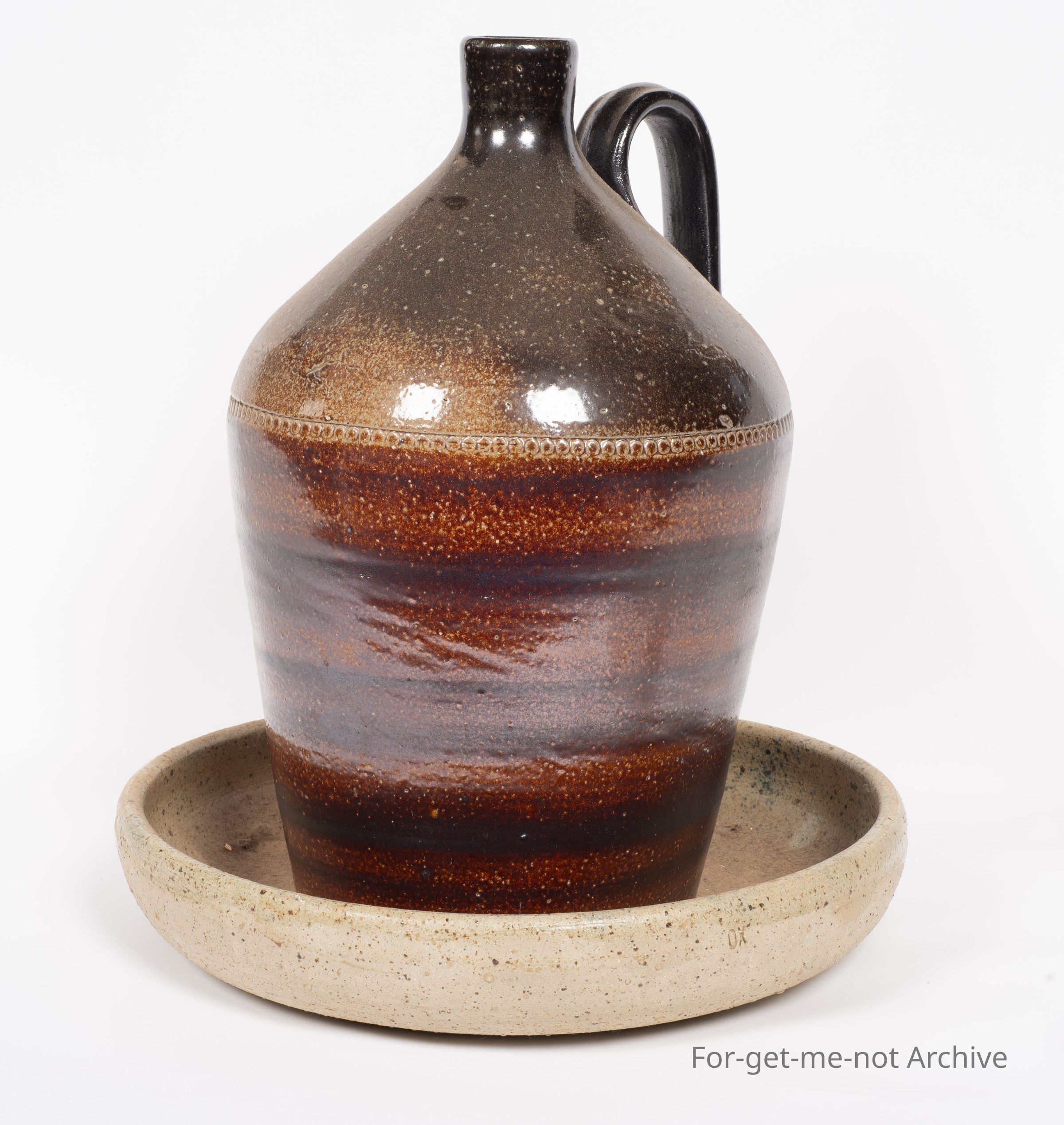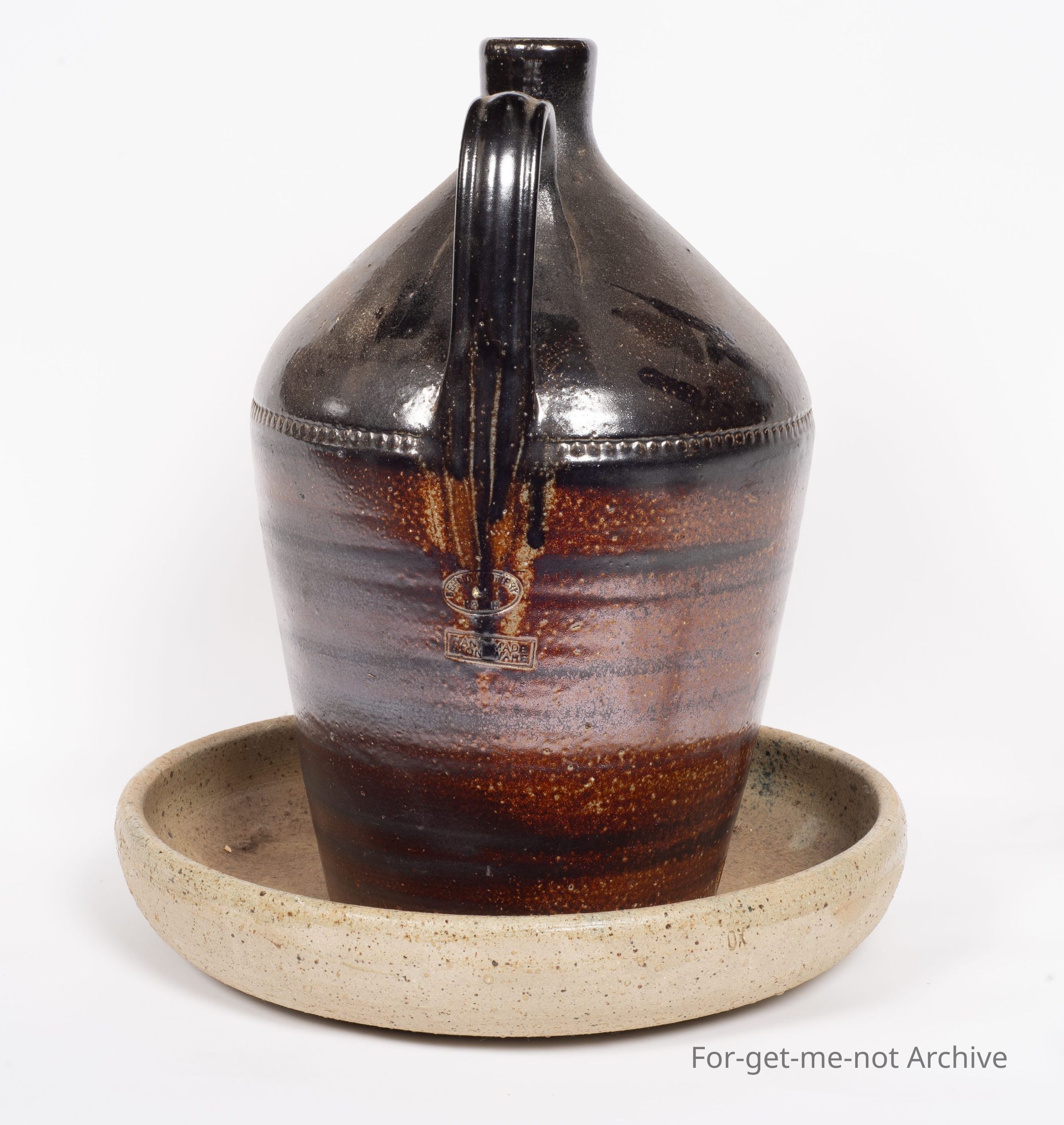This is part of the stoneware ceramic collection. This item is a poultry water feeder from Bendigo Pottery with a stone ware, saucer underneath. This is from the 1970's, so not very old.Collection
