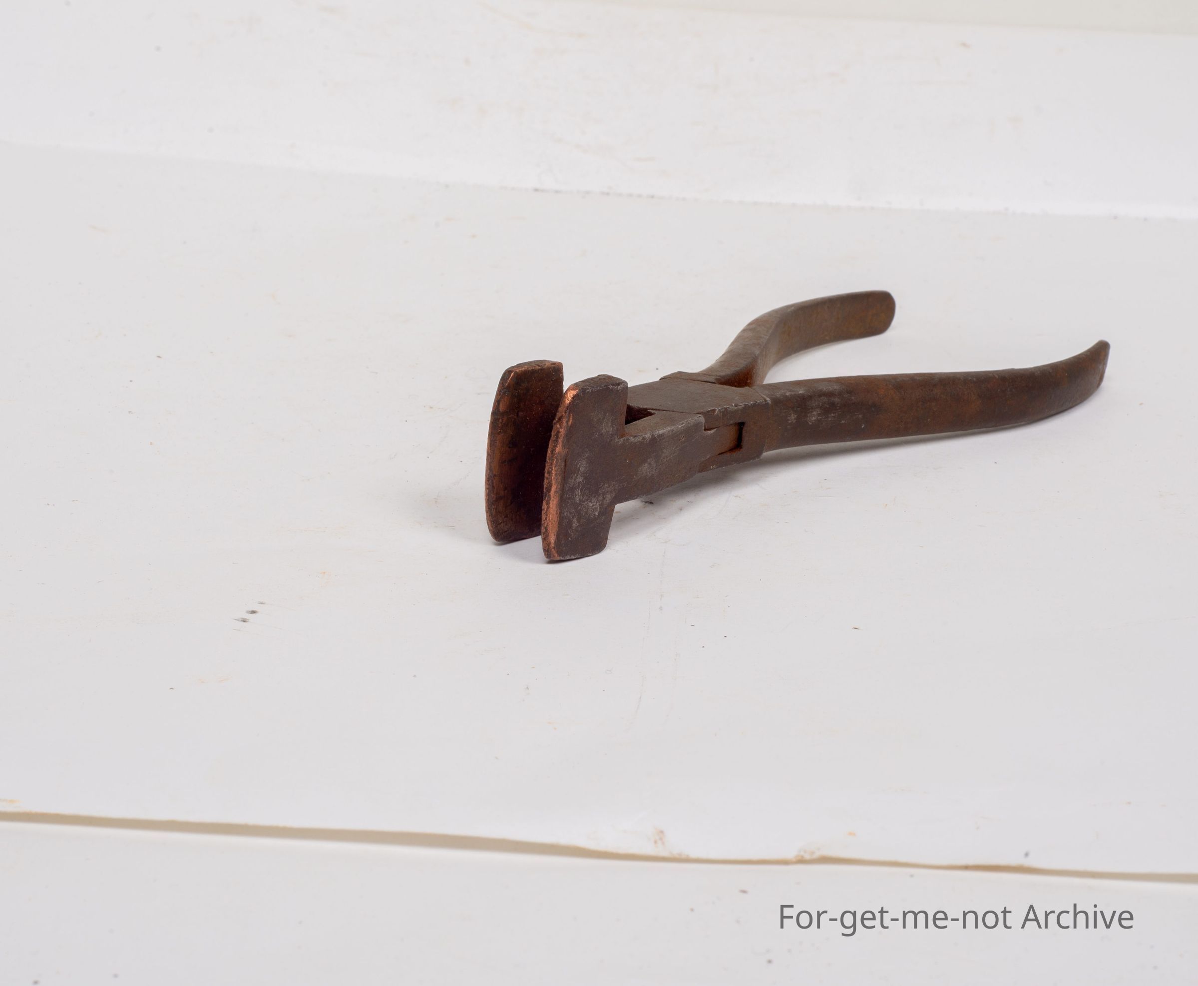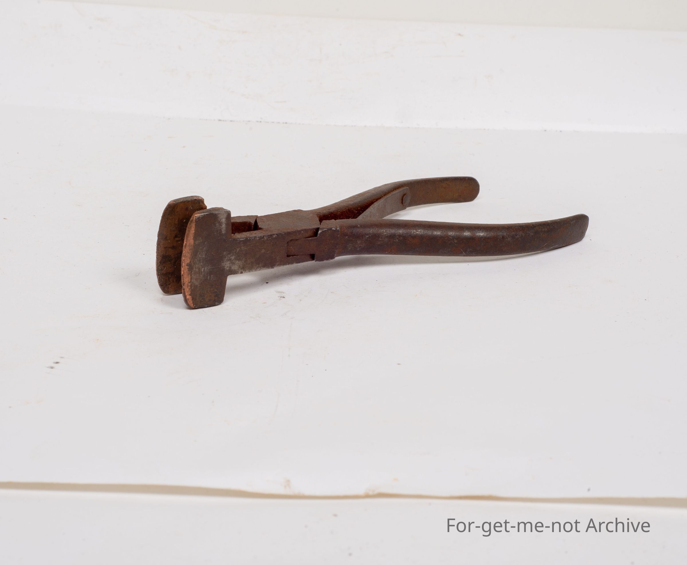 This is another unusual tool, similar to pliers with flat ends which are, embedded with copper and these are powder monkeys pliers for squashing the lead into the fuse so there will be no sparks with the copper end. Quite a hard tool to find. Not easily recognized.Collection