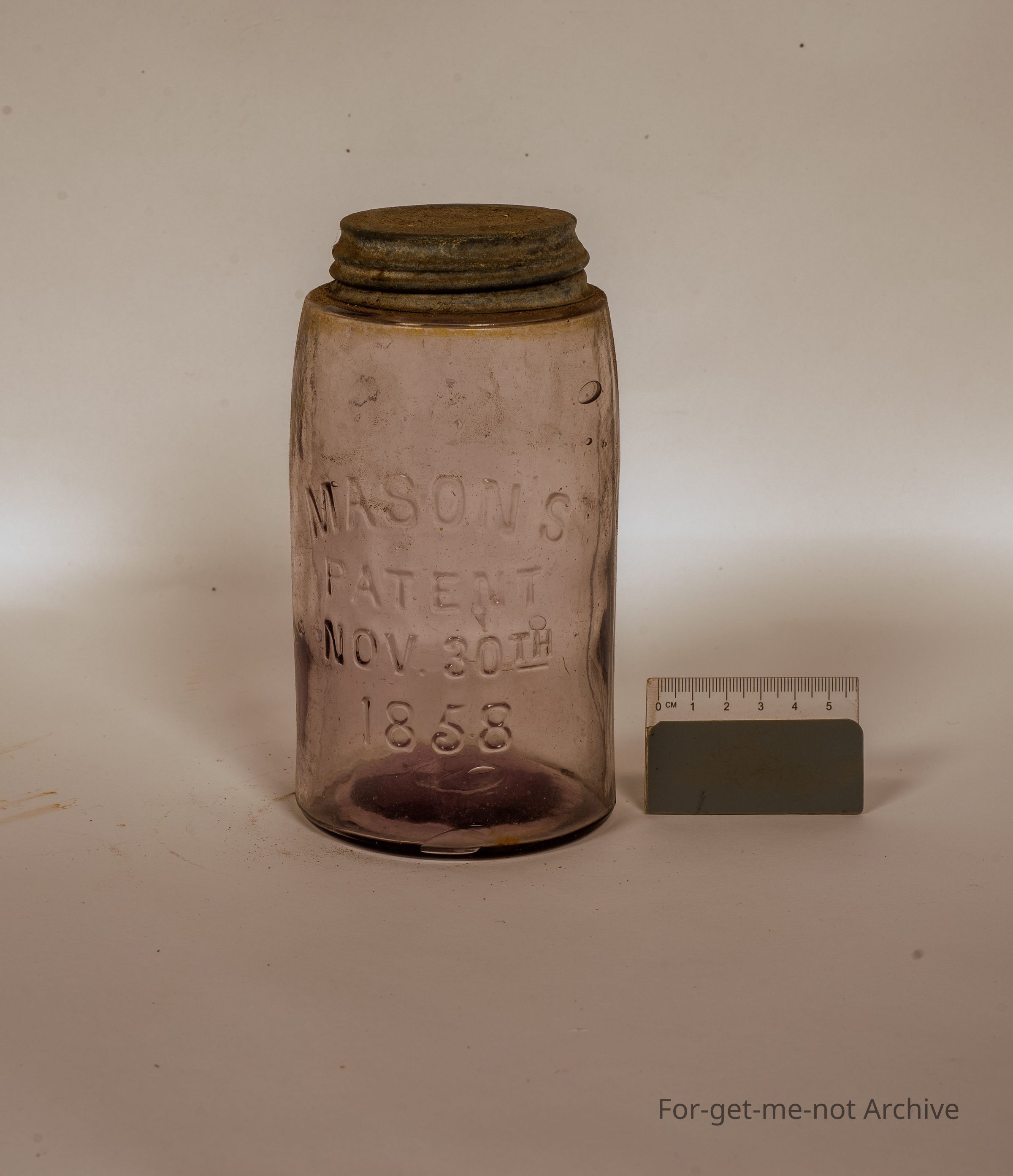 Glass preserving jar. this is a Mason's Patent, November 30, 1858, in good neck with its lid,