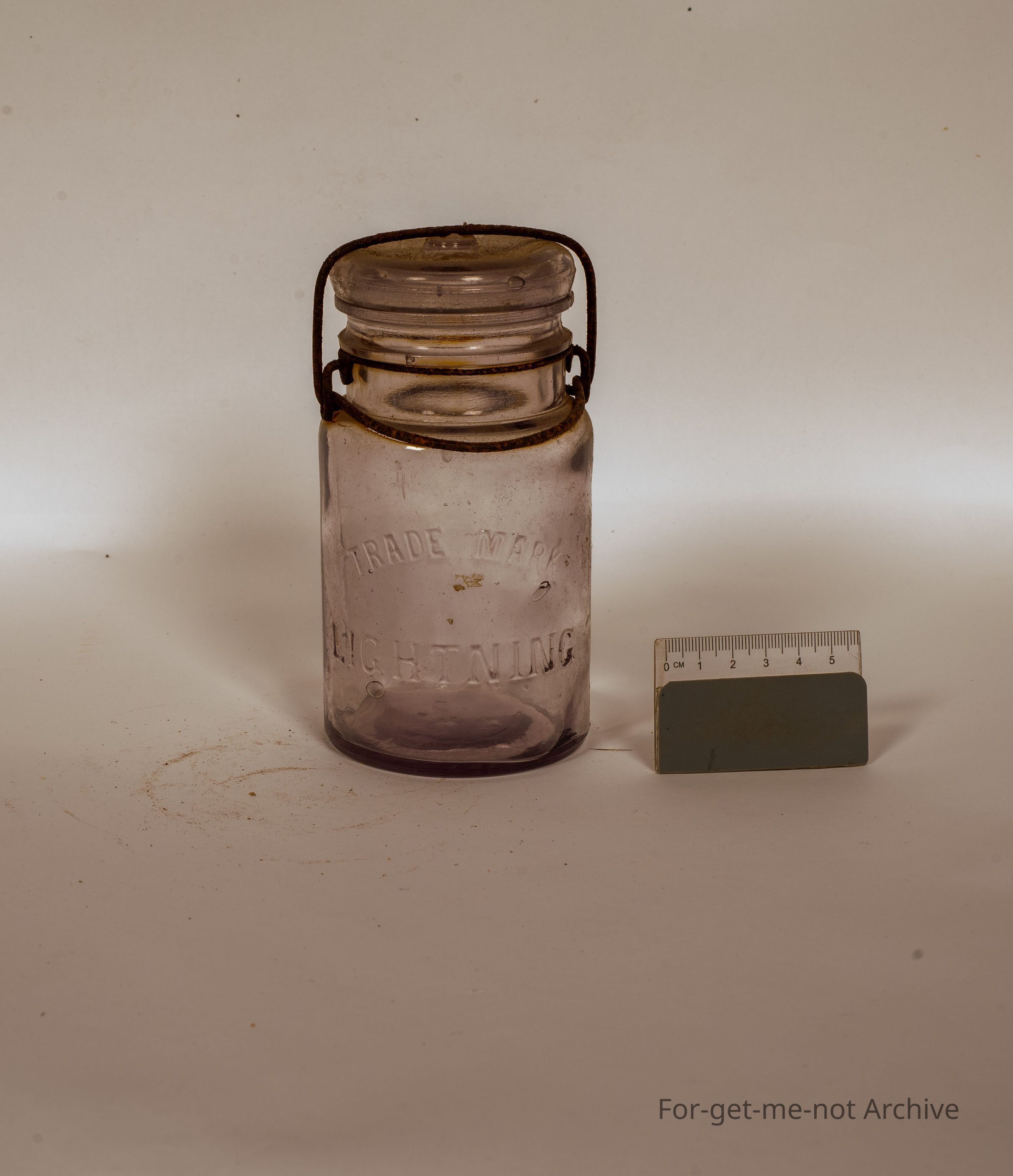 Glass preserving jar. this is a lightning, a smaller size one. Original glass lid and bale in very good nick,