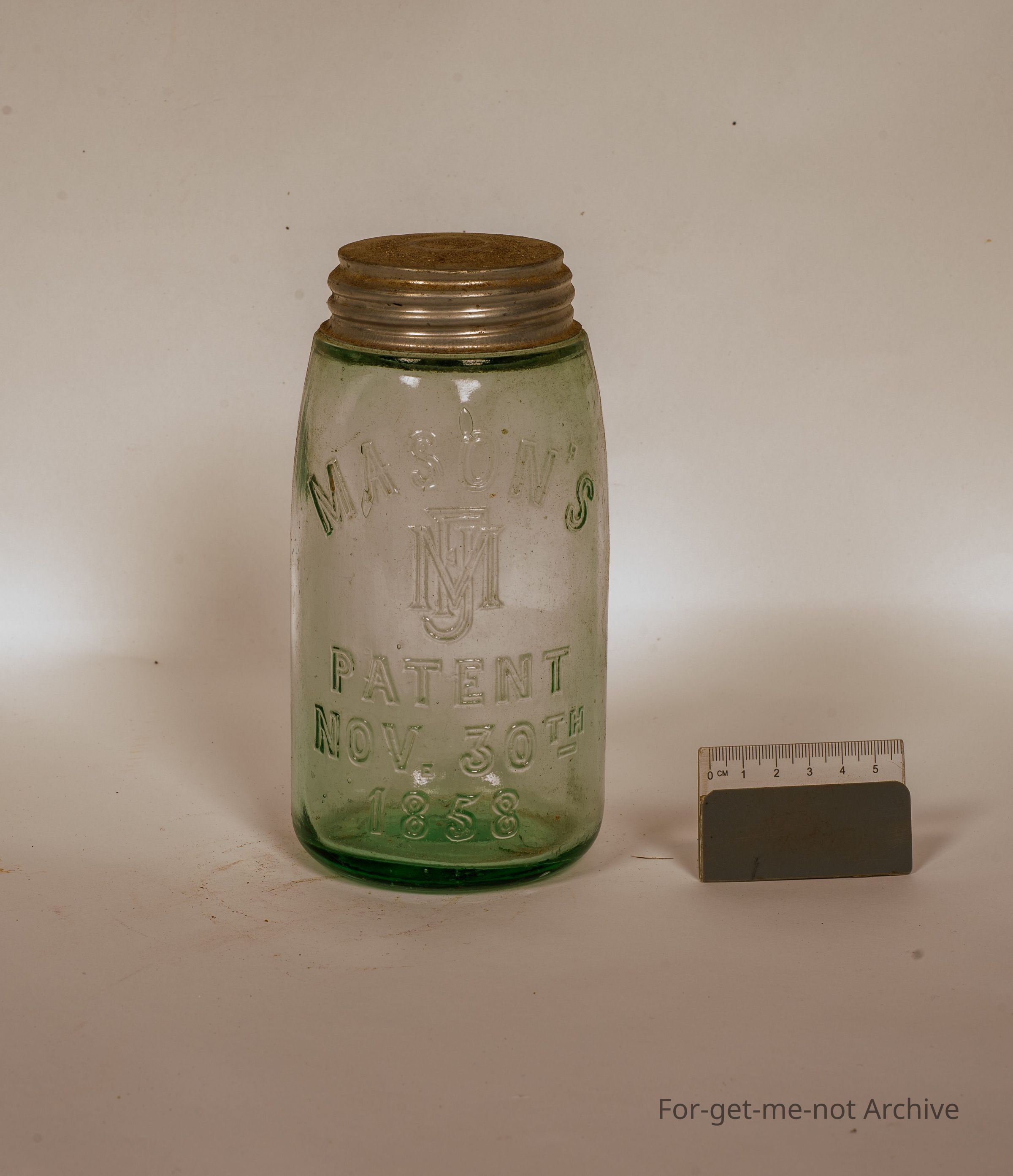 Glass Preserving Jar. This one , this is a Mason's with a monogram for Mason, Patent November 18/85 with original lid,