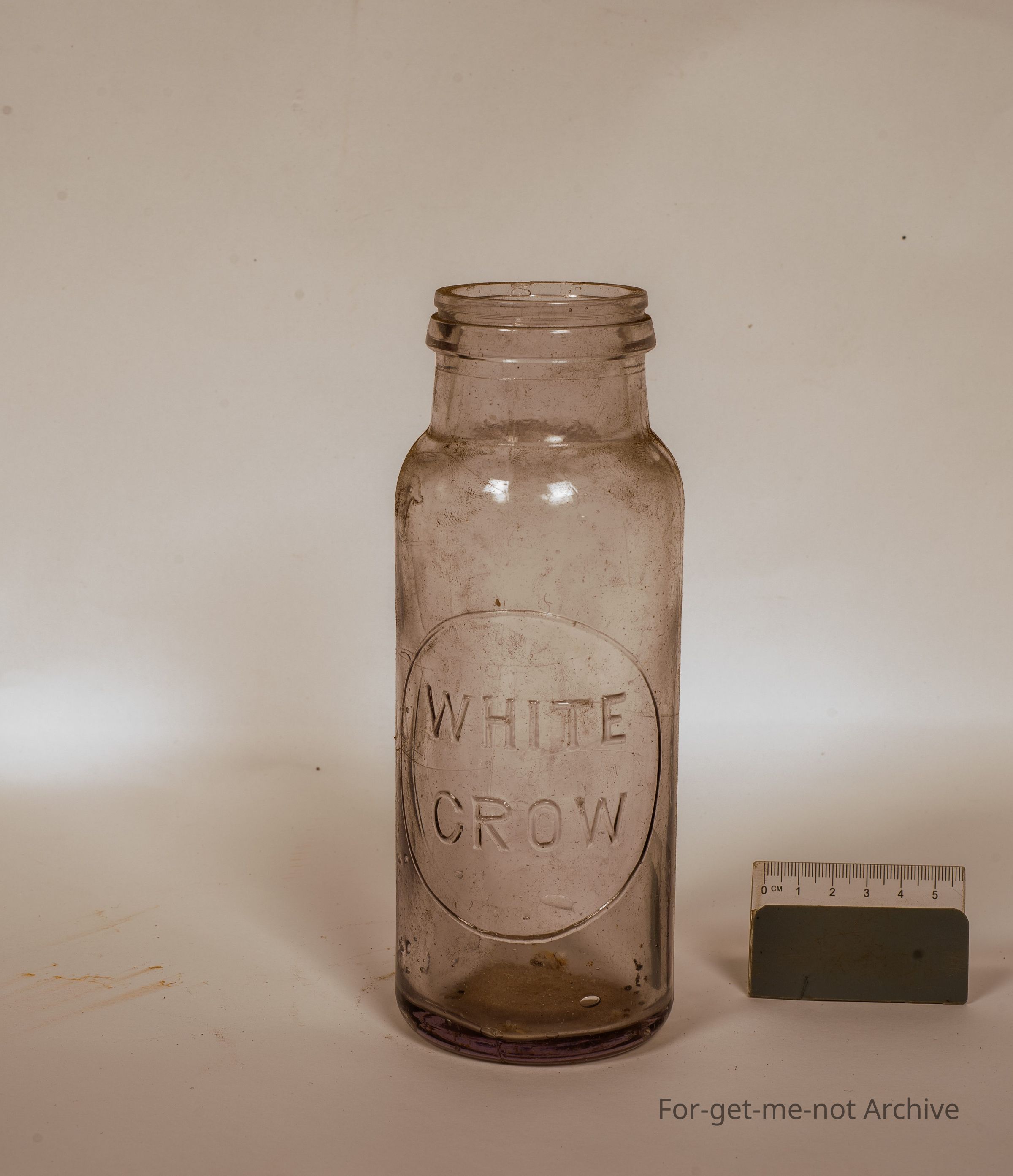 Glass Preserving Jar, medium size. This one titled White Crow, no lid, no bail,
