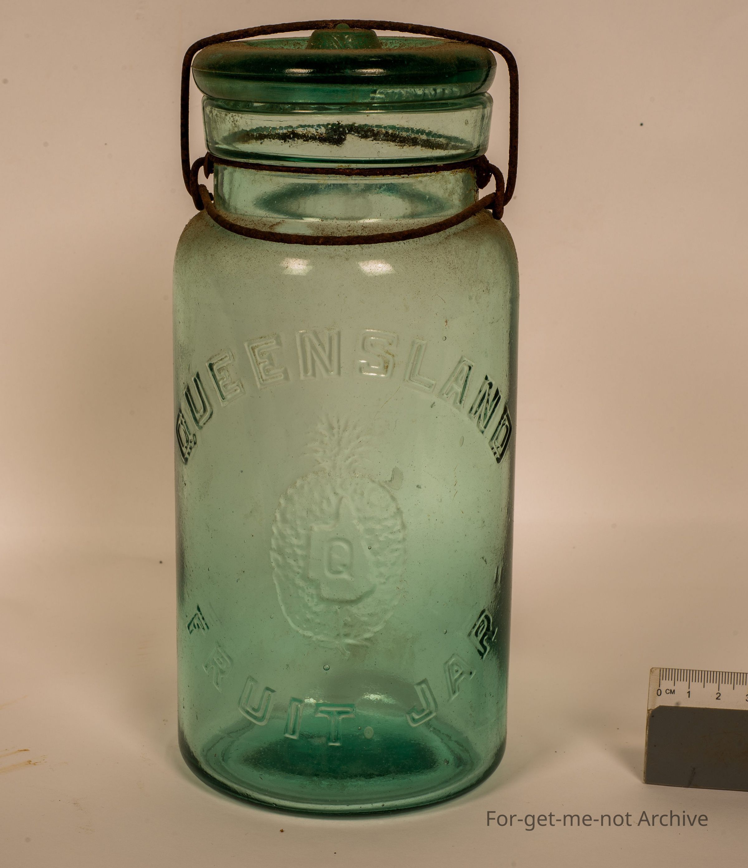 Glass preserving jar. , this one has its original lid and bale titled Queensland Fruit Jar with a pineapple image and a map of Australia in the middle.