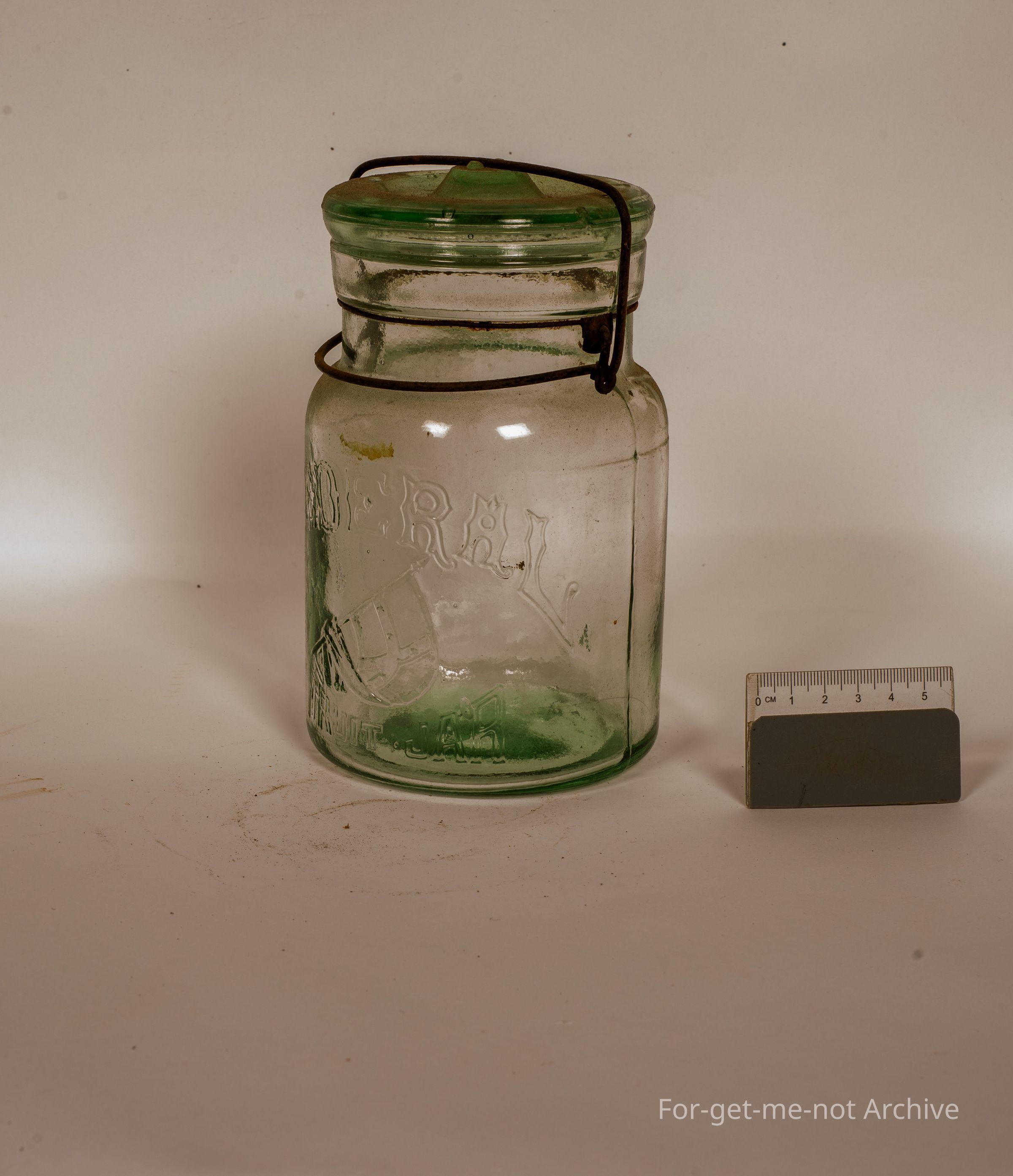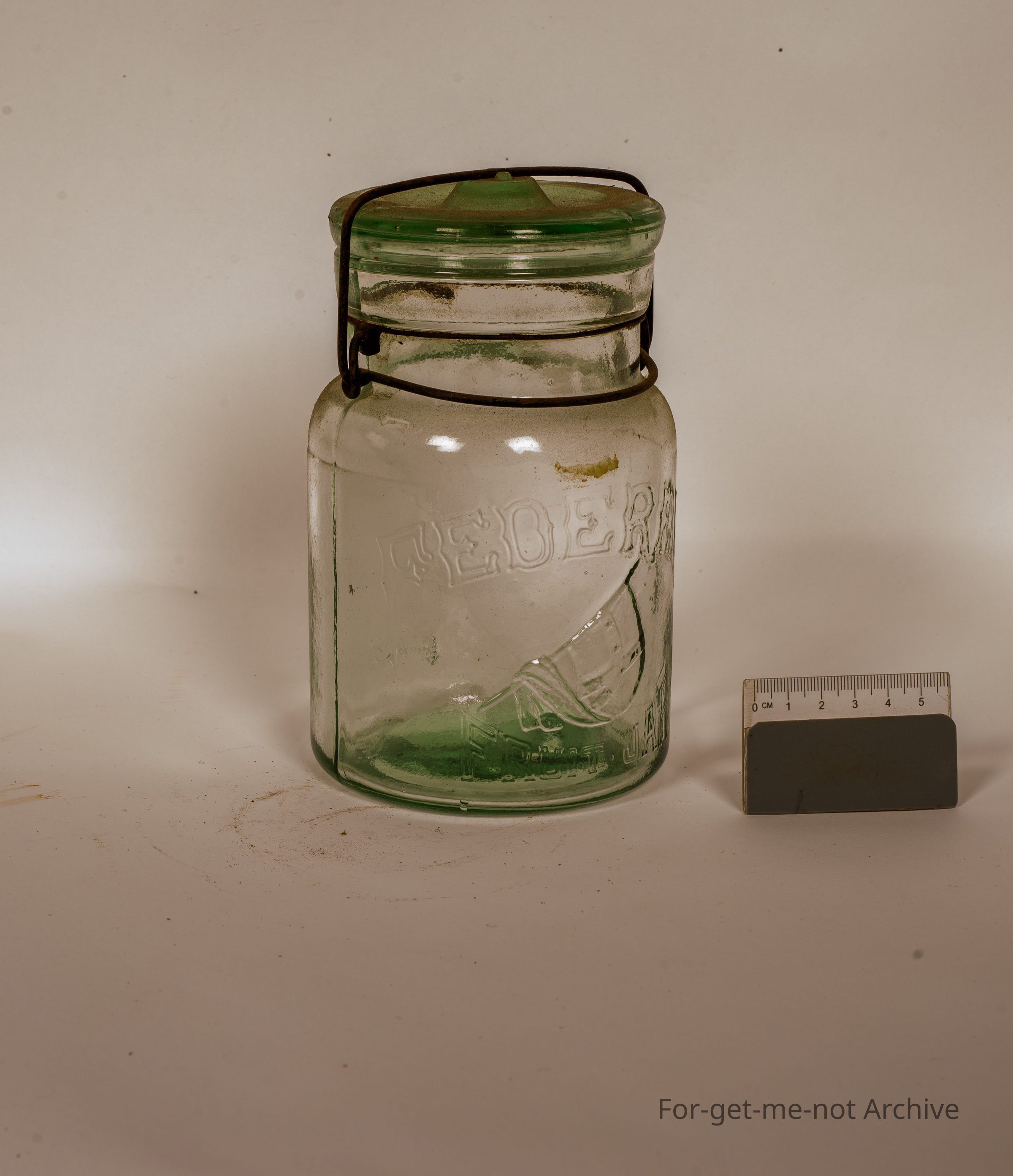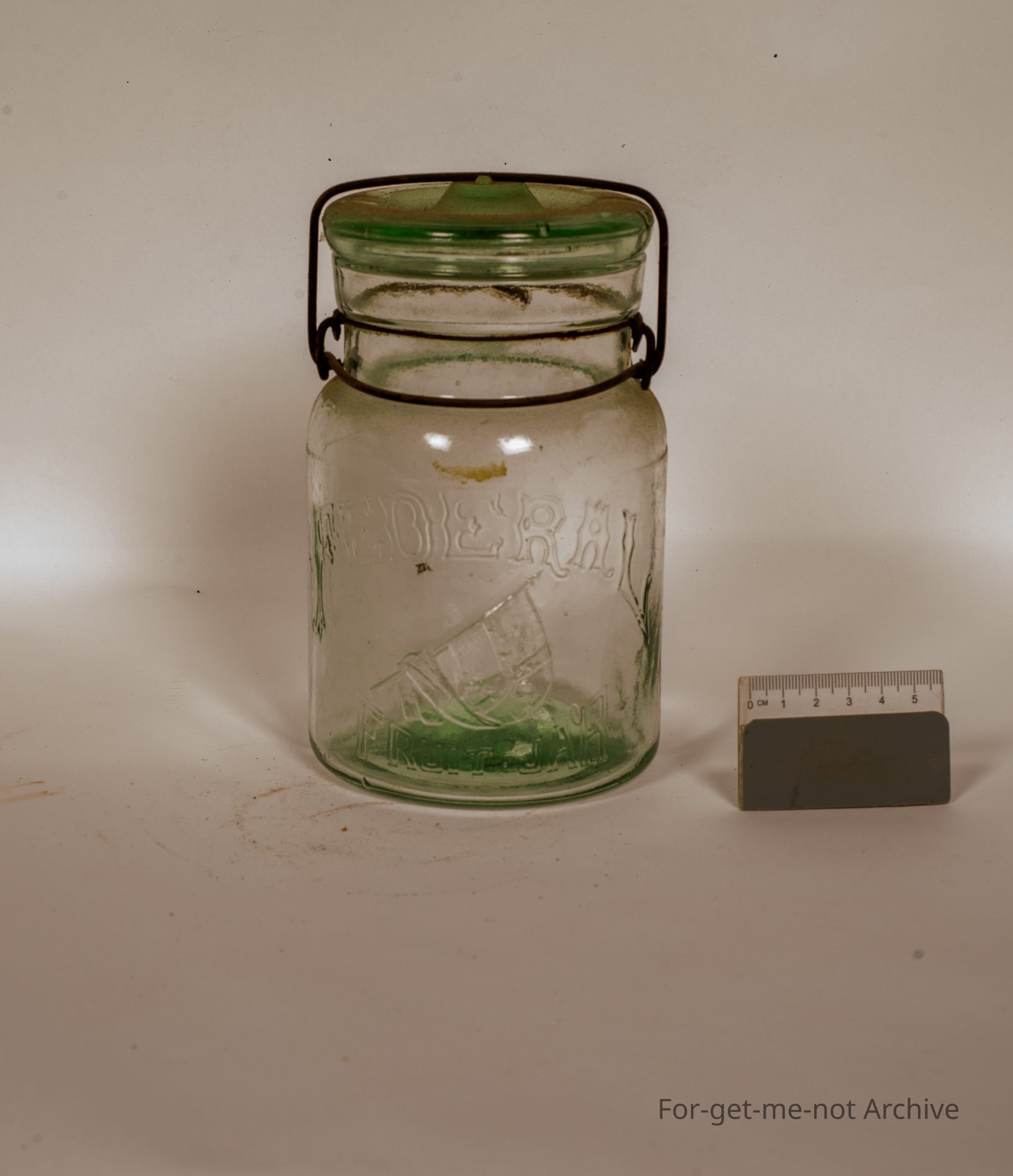 Glass preserving jar. this one is a Federal with the drooping flag. Fruit jar, written under the flag. This has its original lid and bale,