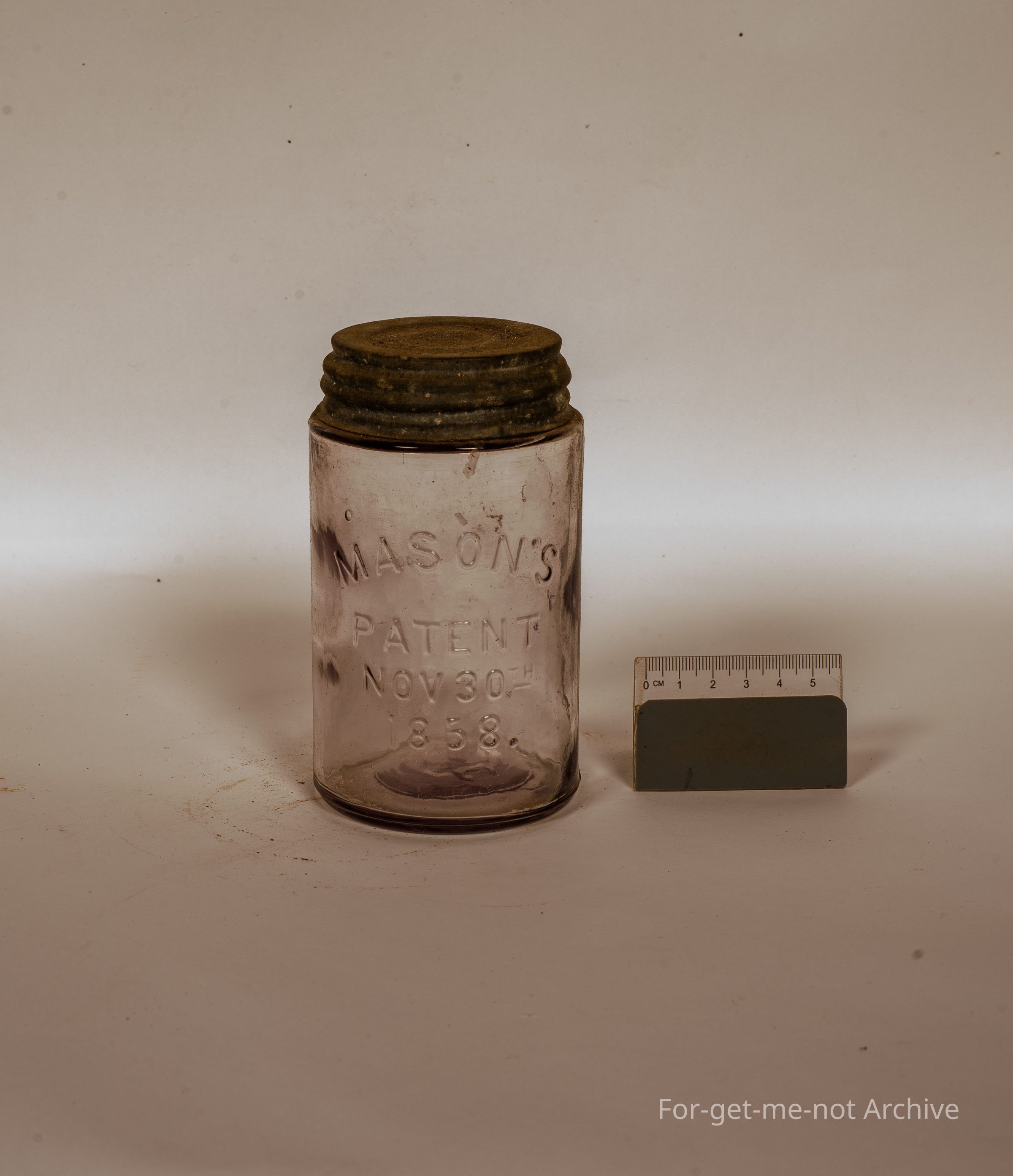 Glass preserving jar. Mason's Patent. Nov 30th 1858. This one is a small size. Has original, screw top lid.