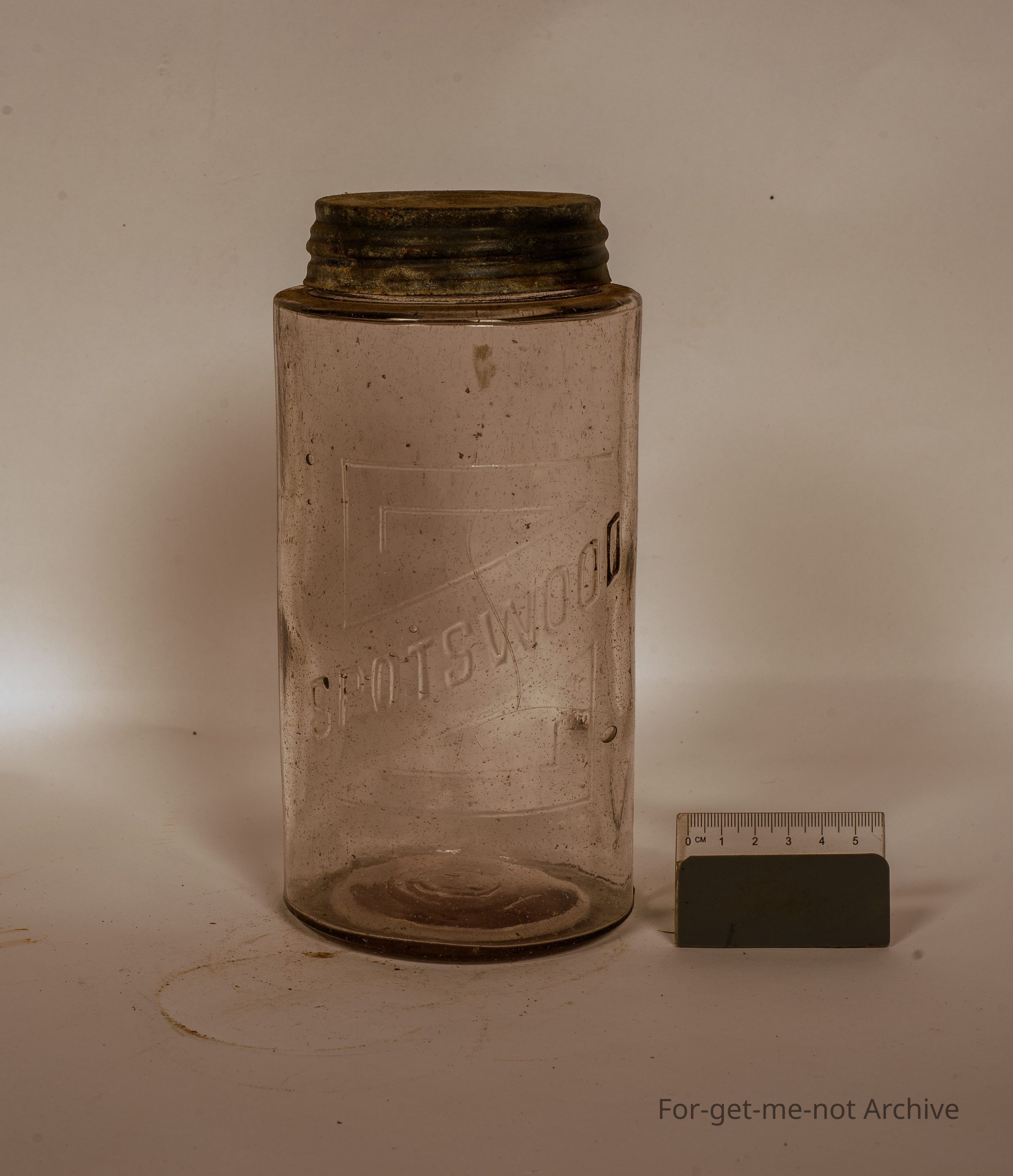 Glass Preserving Jar. This one, a larger size titled 'Spotswood' with lid, in good condition.