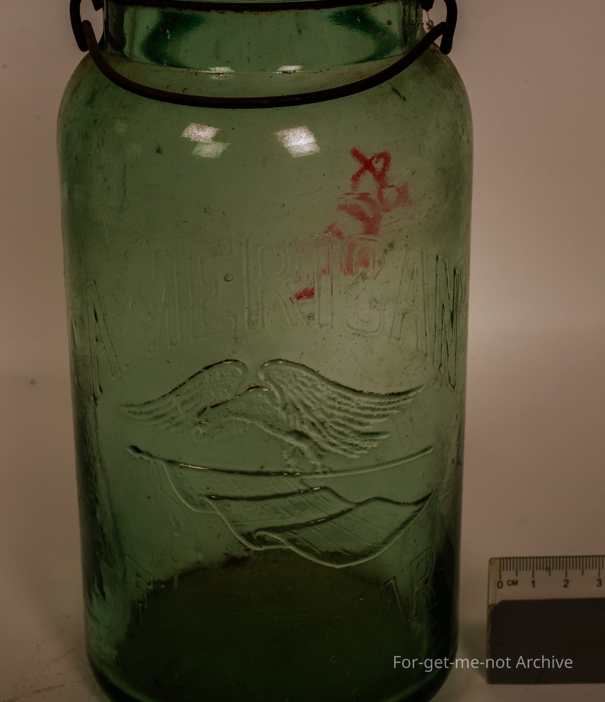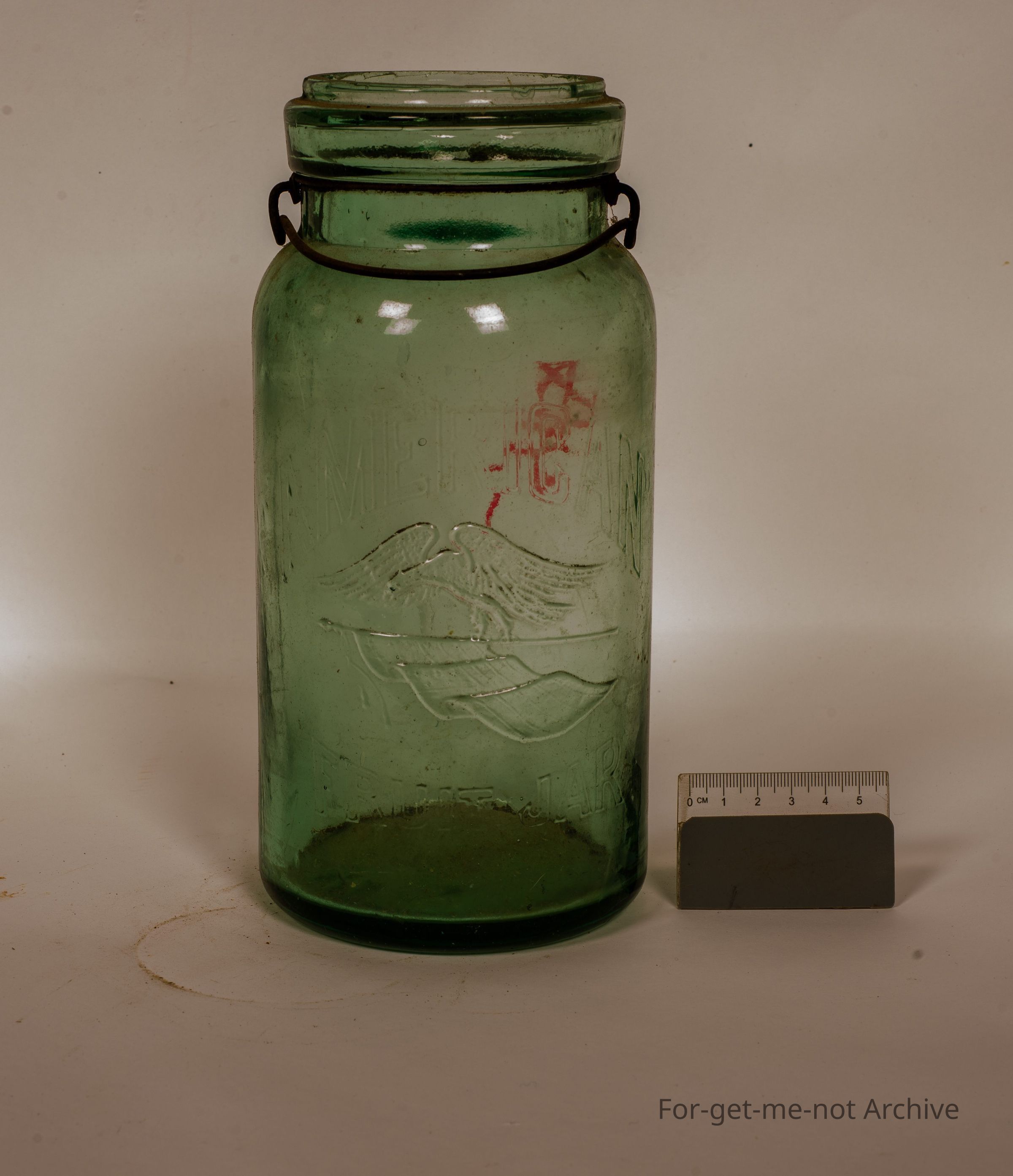 Glass preserving jar in larger size, indicates age with a beautiful dark green tinged to the glass. No lid, but it has the bale. This one is titled American with the image of a bald eagle flying over the flag with fruit jar on the base. Quite an unusual one,Collection
