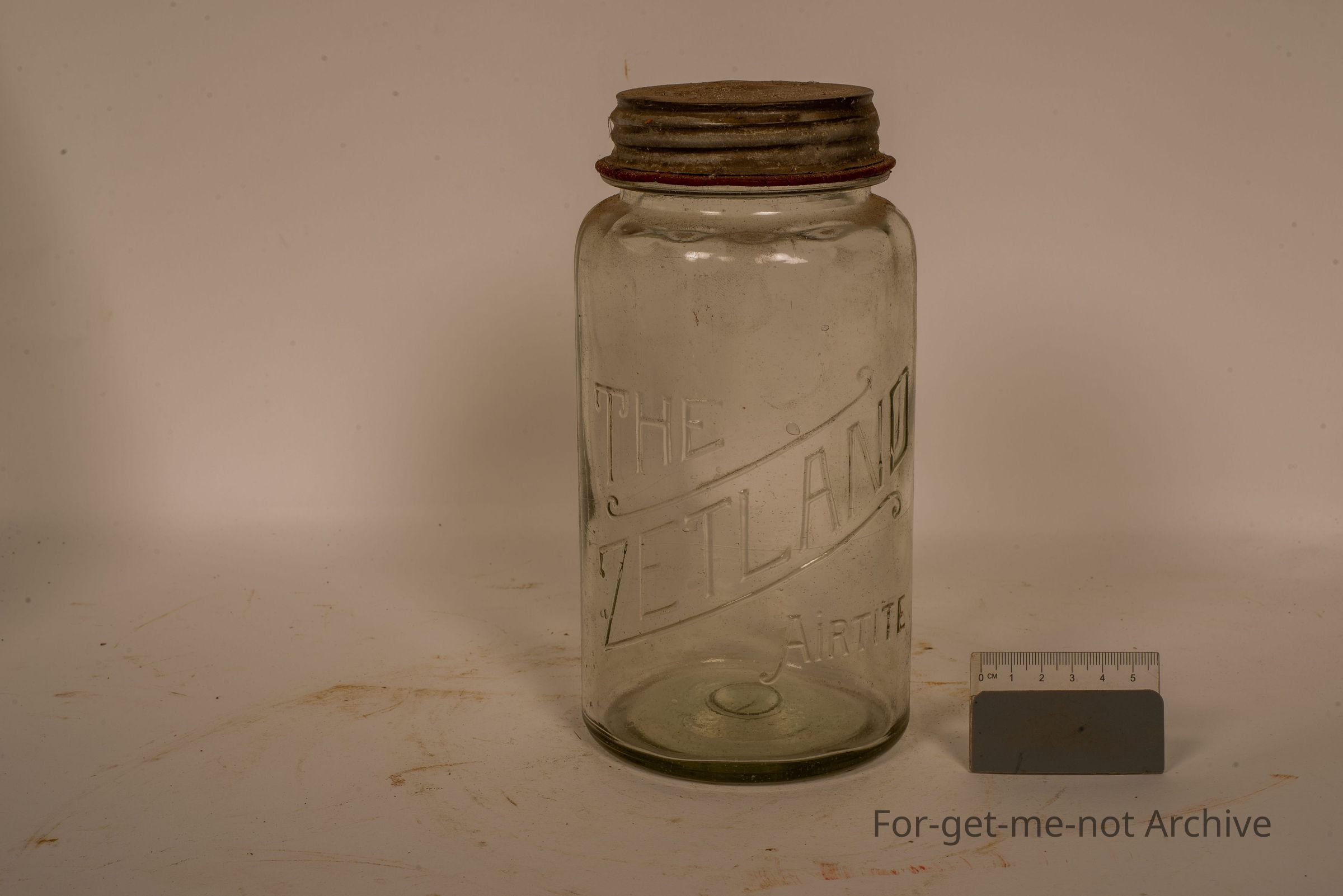Glass preserving jar, larger size called the Zetland Airtight, with the large lid with a sealing rubber sealing ring.