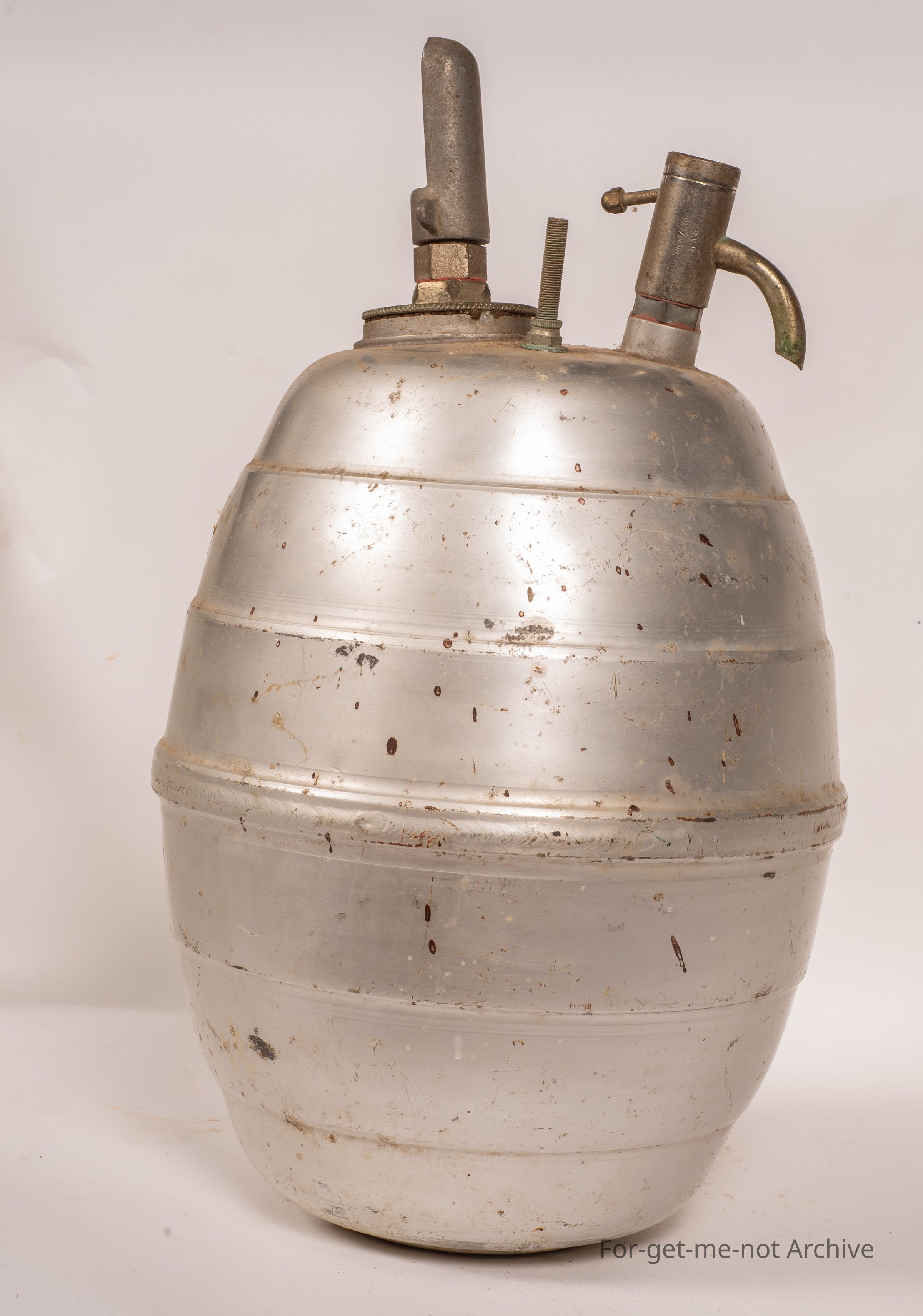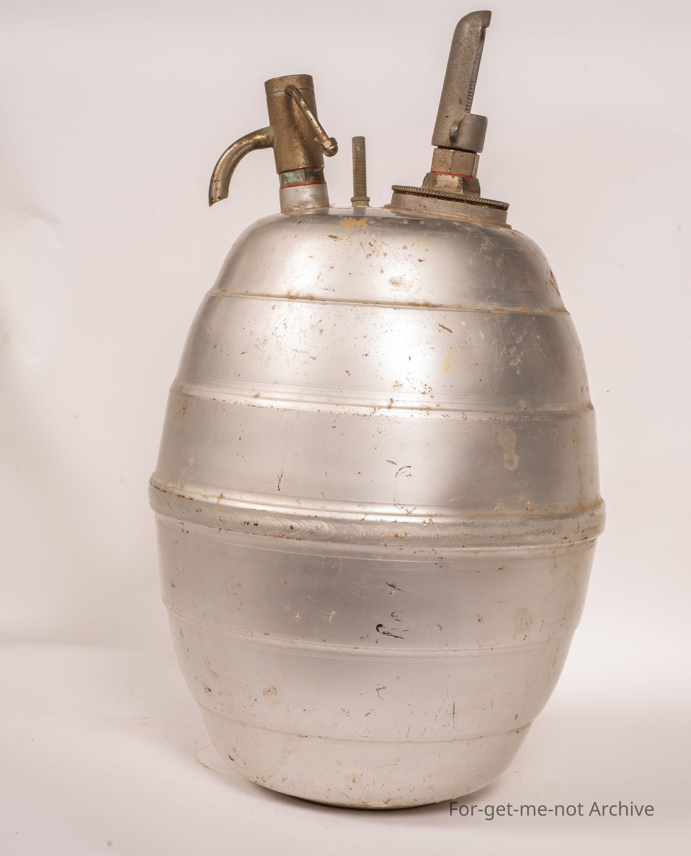 This is made of aluminium in the shape of a barrel. It has all the necessary working parts to create pressure. It has a valve like a bicycle valve built into the top in which you pump it up with a bike pump. It's it is stamped RVH patent pending. Other than that, there's no information on it. It has a spout as if it hay have been for soda drinks etcCollection