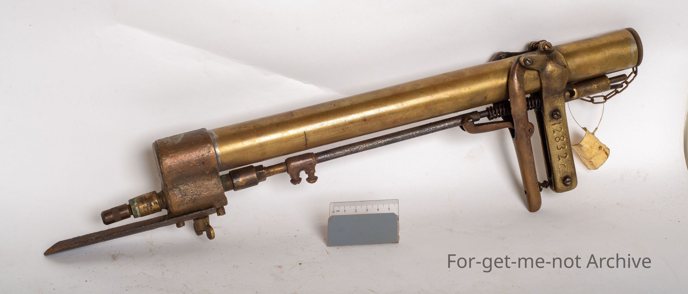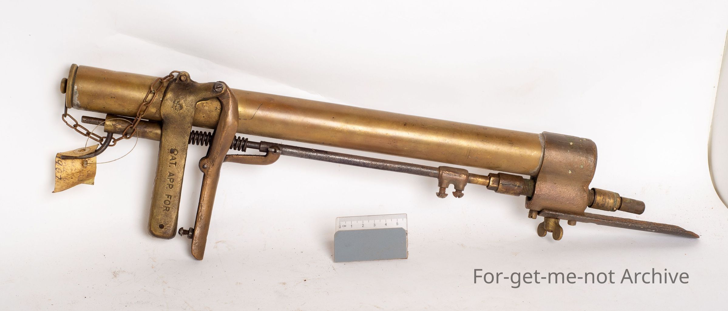 This is the small size prickly pear gun that was, kept in a pouch on a saddle. The whole idea of it was that the rider didn't have to dismount the horse in order to, inject a shot of poison into the prickly pear.. As good as the prickly pear gun. These are far scarcer than the large sawyers one. Quite collectible, all made of brassCollection