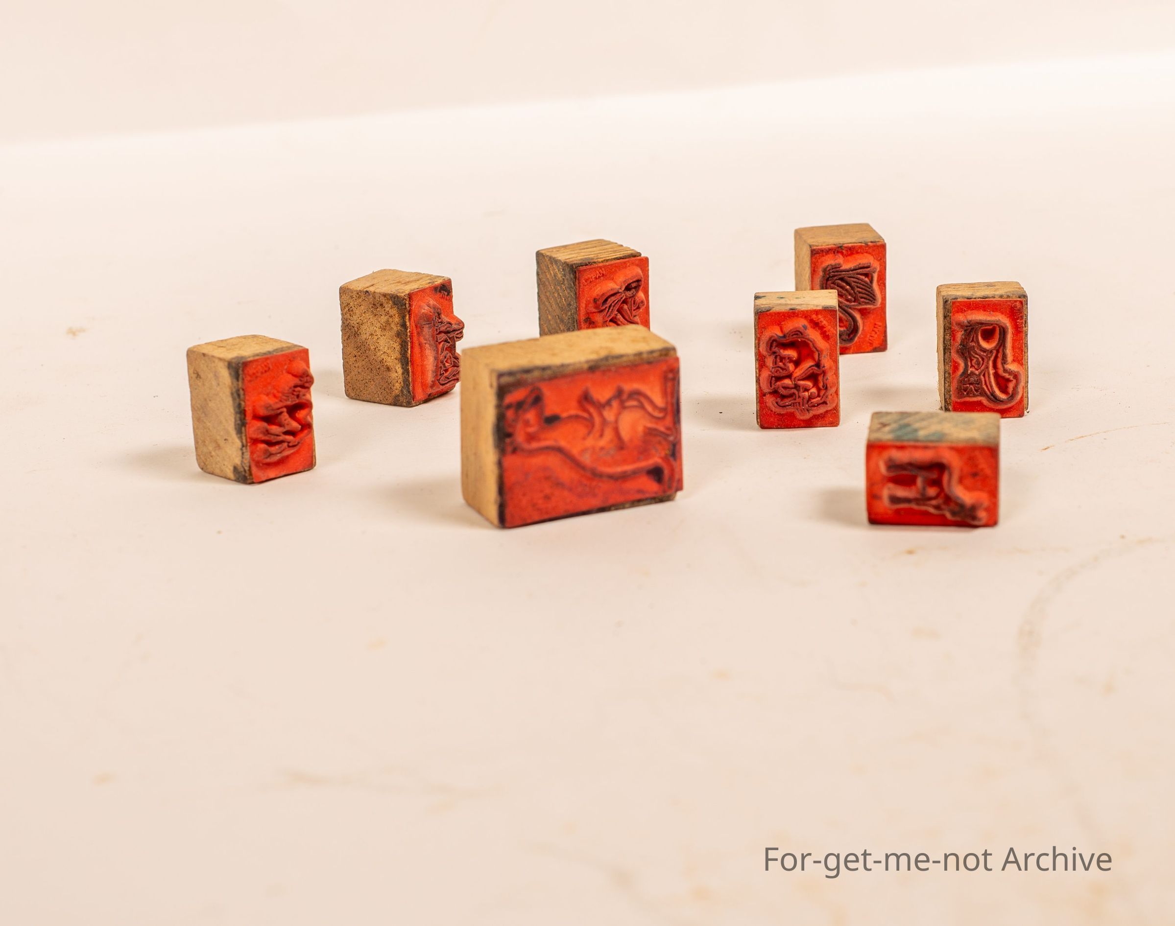 Another group of 8 print boxes a print box wooden backing rubber face for using ink, all with various animals for kids ,the group
