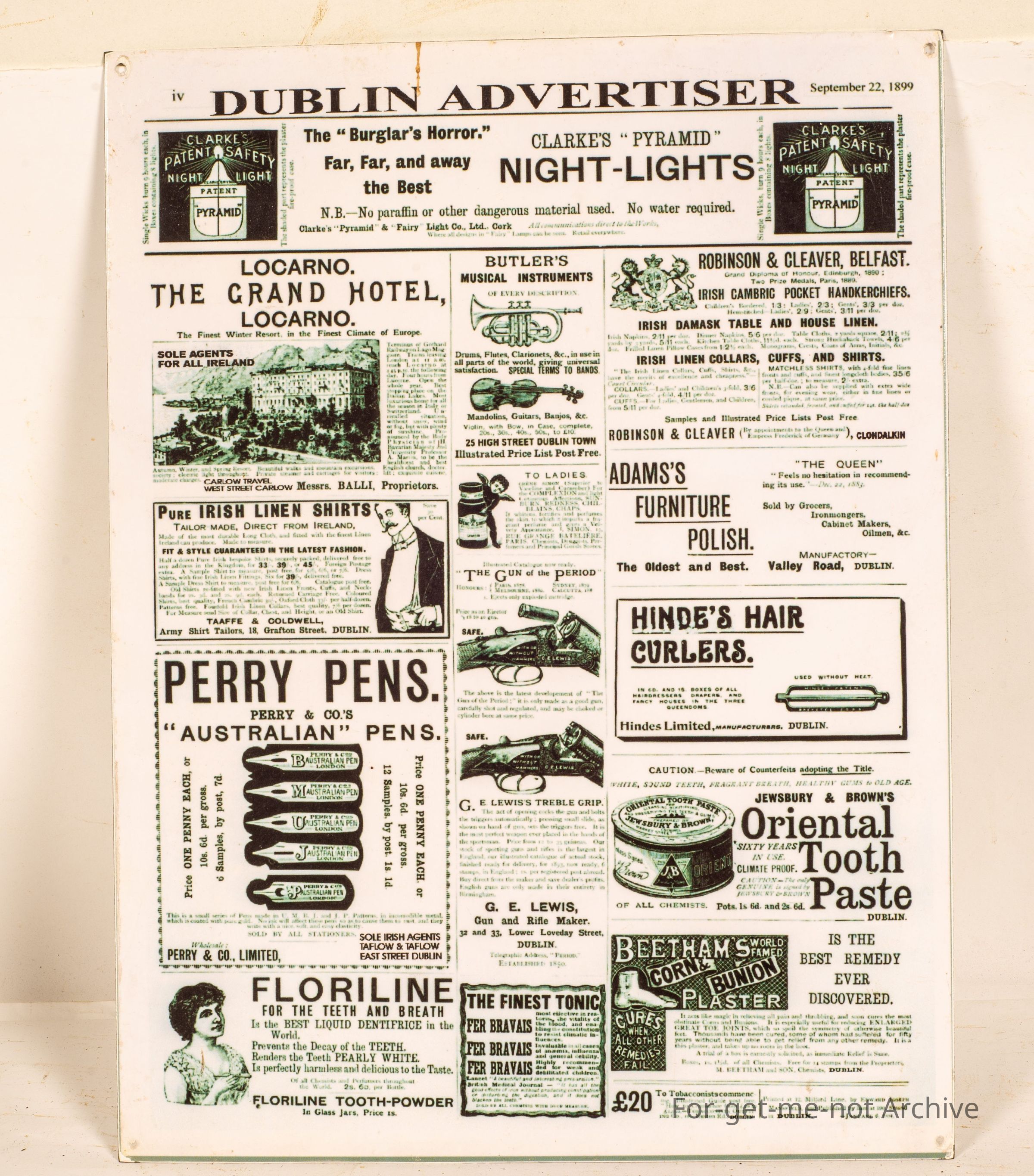 Sangeet Collection. This is a printed copy of a page from the Dublin Advertiser, September 22, 18 99. This has images of various, products from musical instruments to shotguns, the pens from nibs, pens from the nibs from writing pens. Very interesting.Collection