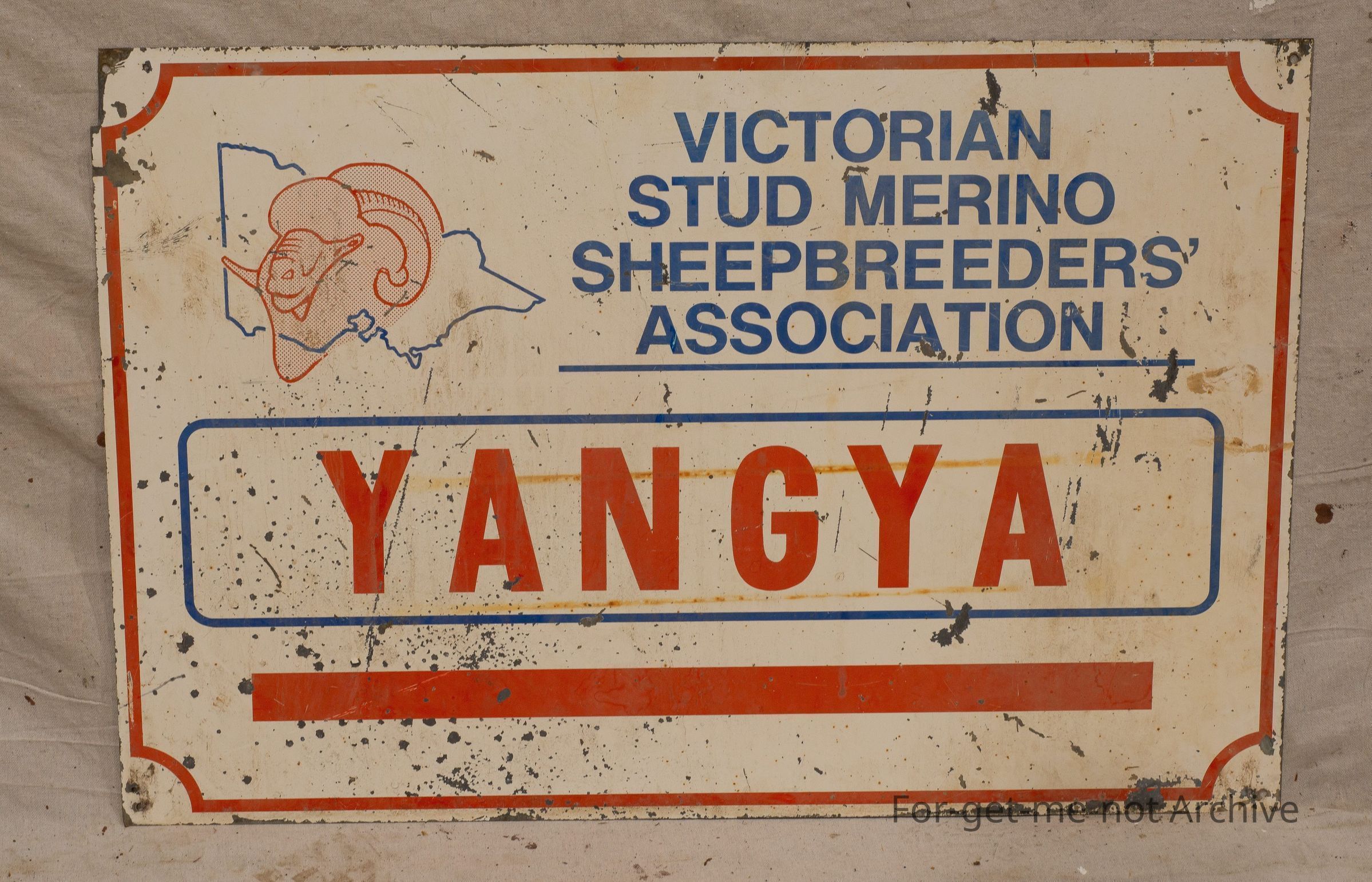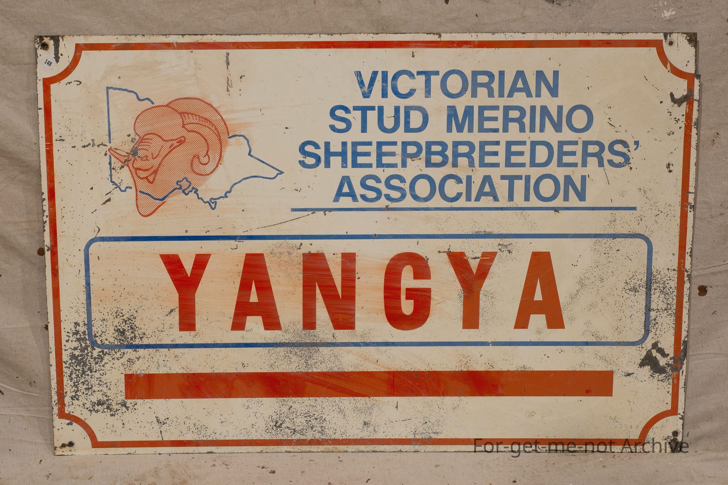 Printed tin sign advertising the Victorian Stud Mariner's Sheep Breeders Association. Advertising the propery name Yangya- it's a double sided sign