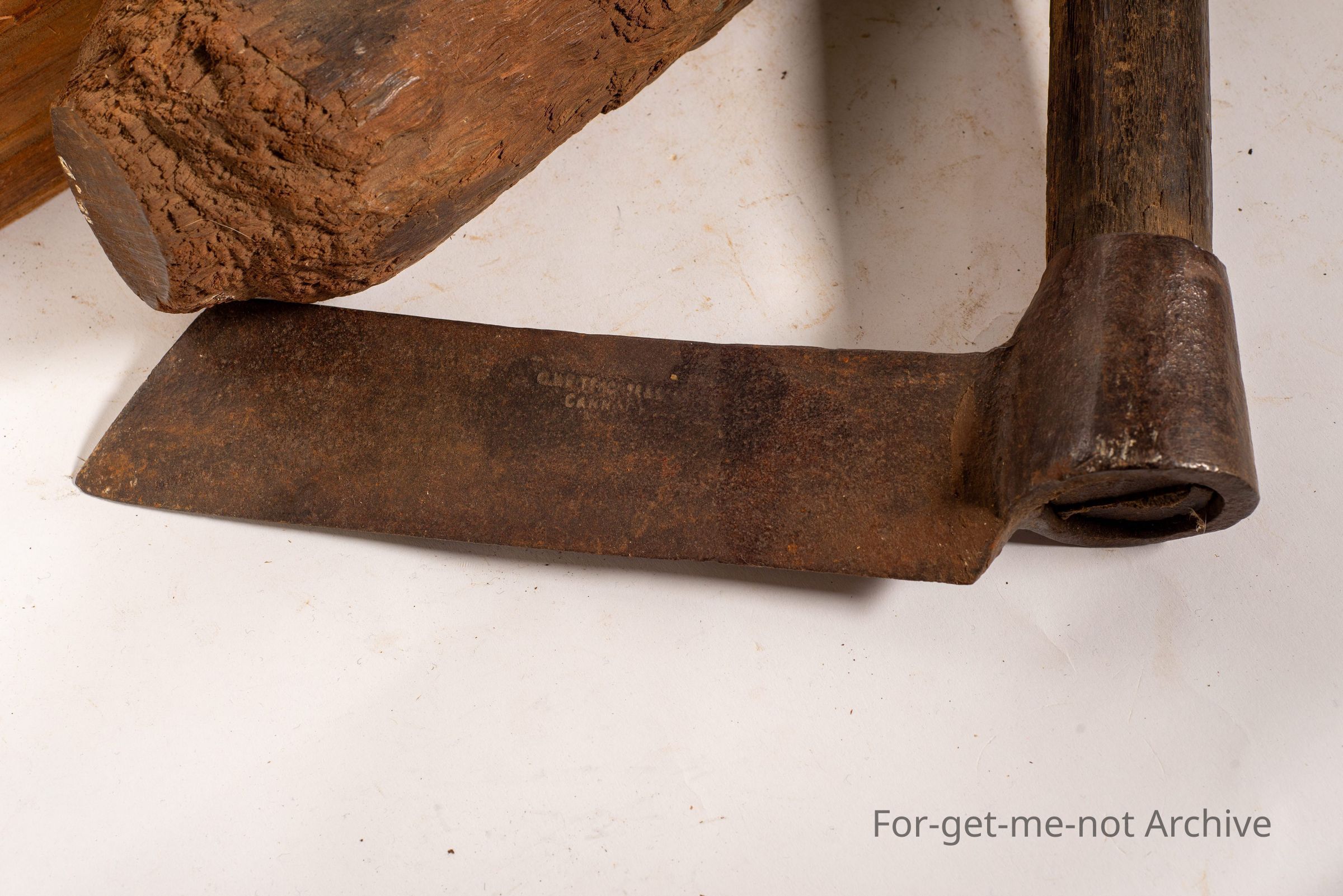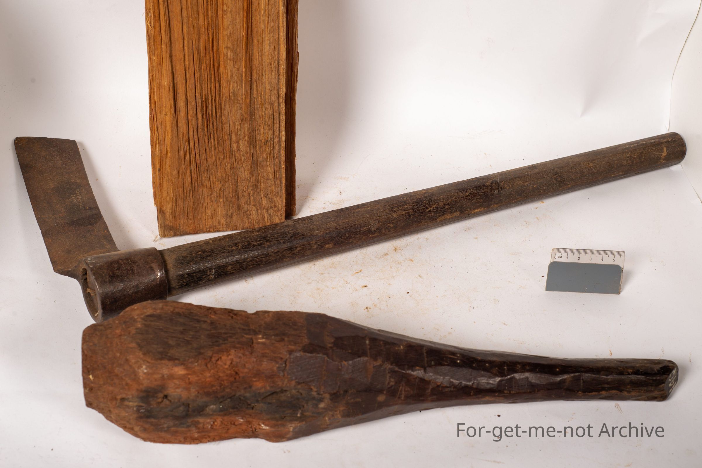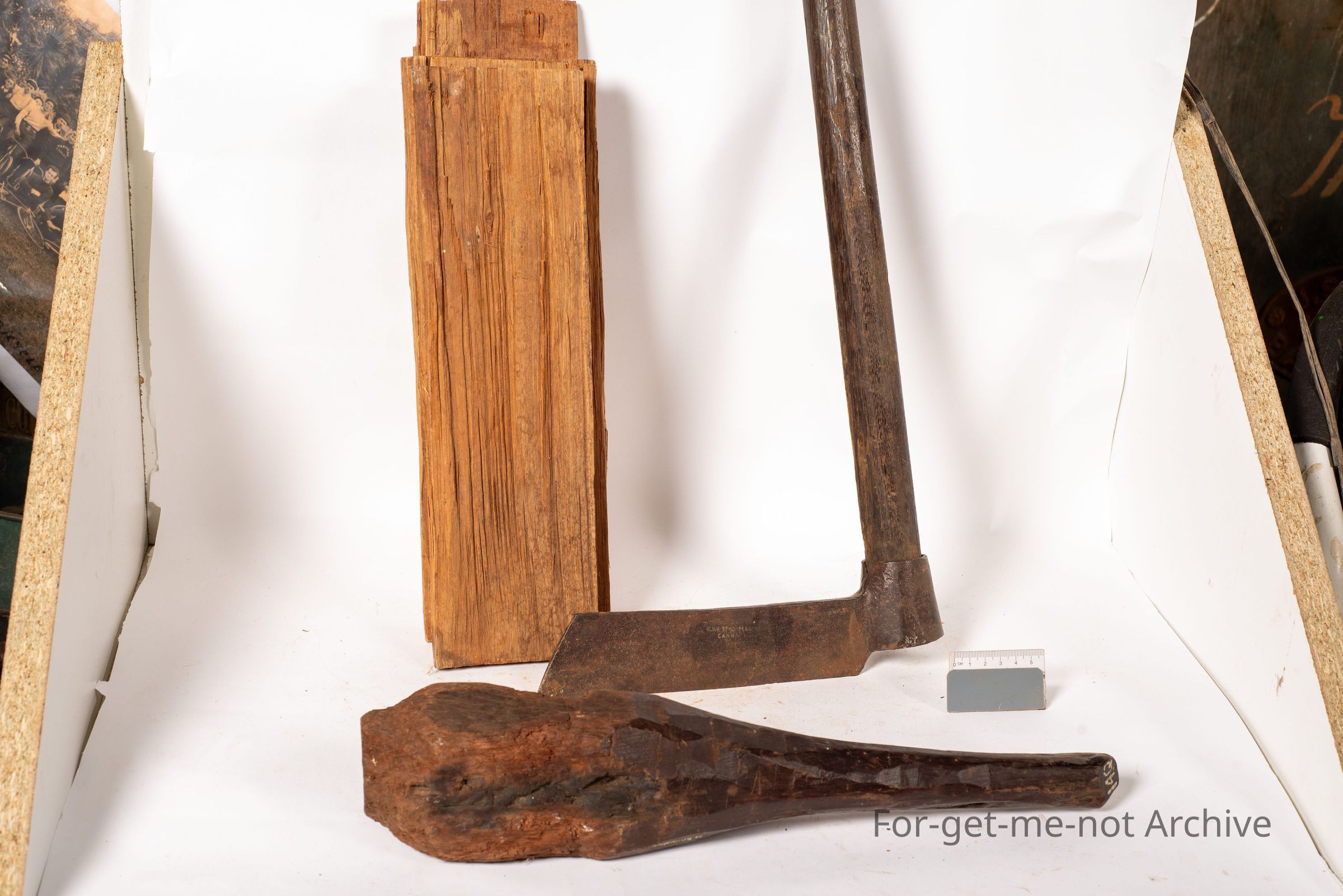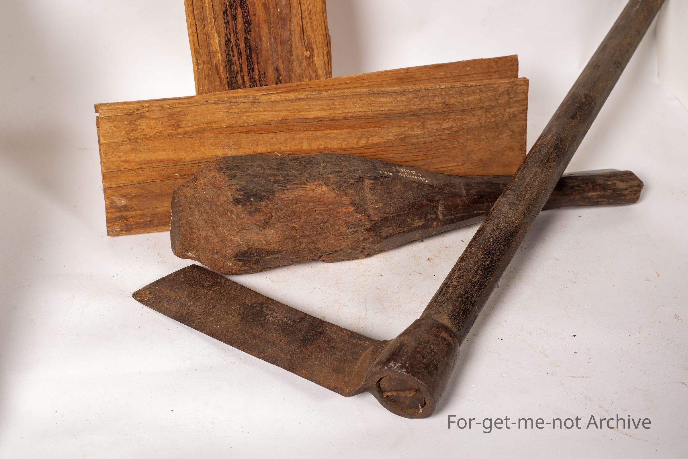 This is the equipment used for making shingles. The cutter, known as a Pro Wooden Handled, cuts segments out of blocks of Casuarina as a rule. The dolly is to hammer the for through the piece of wood with the result of the shingles on display with this scoop. Covers a bit of history of how shingles were made.Collection