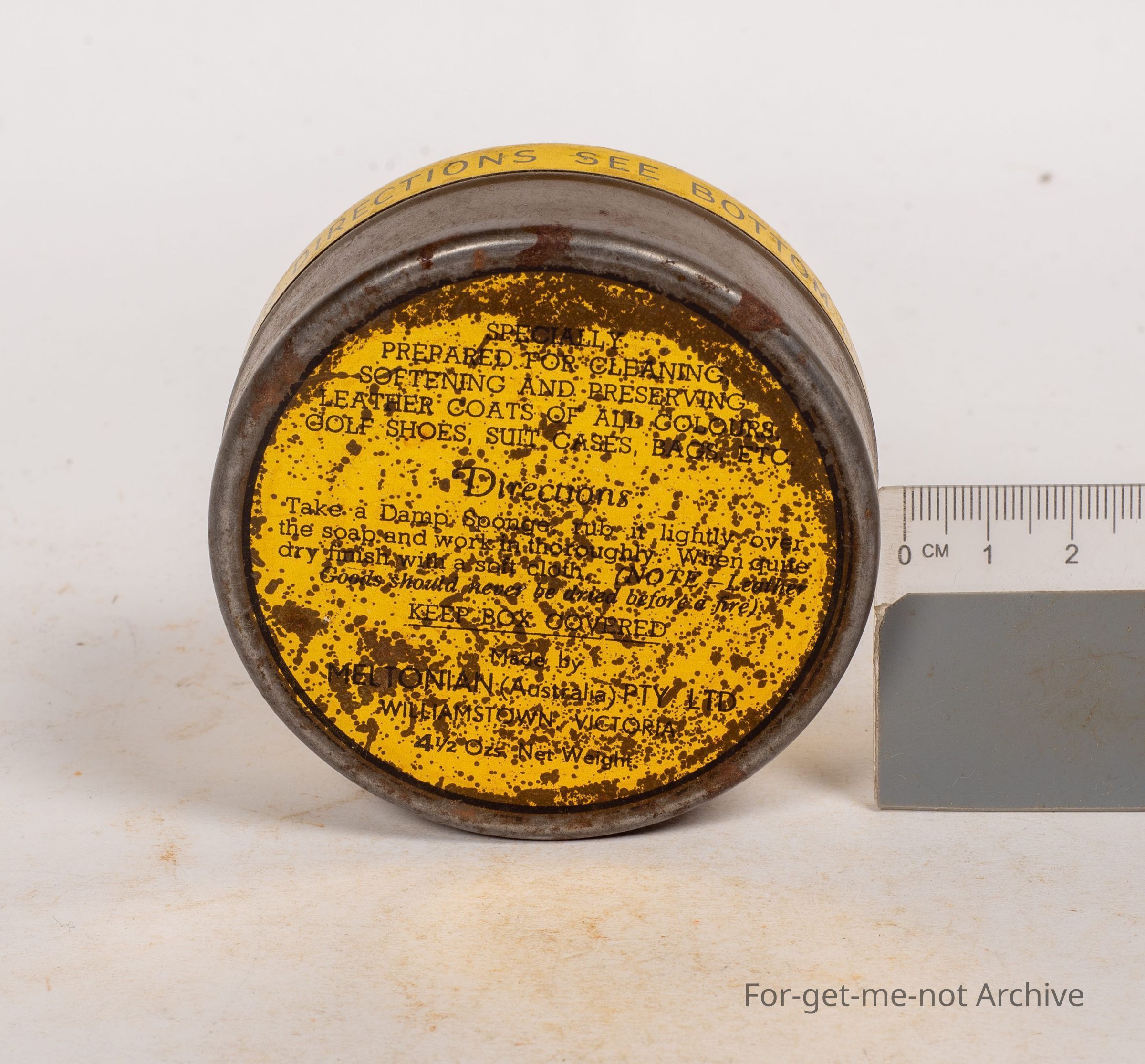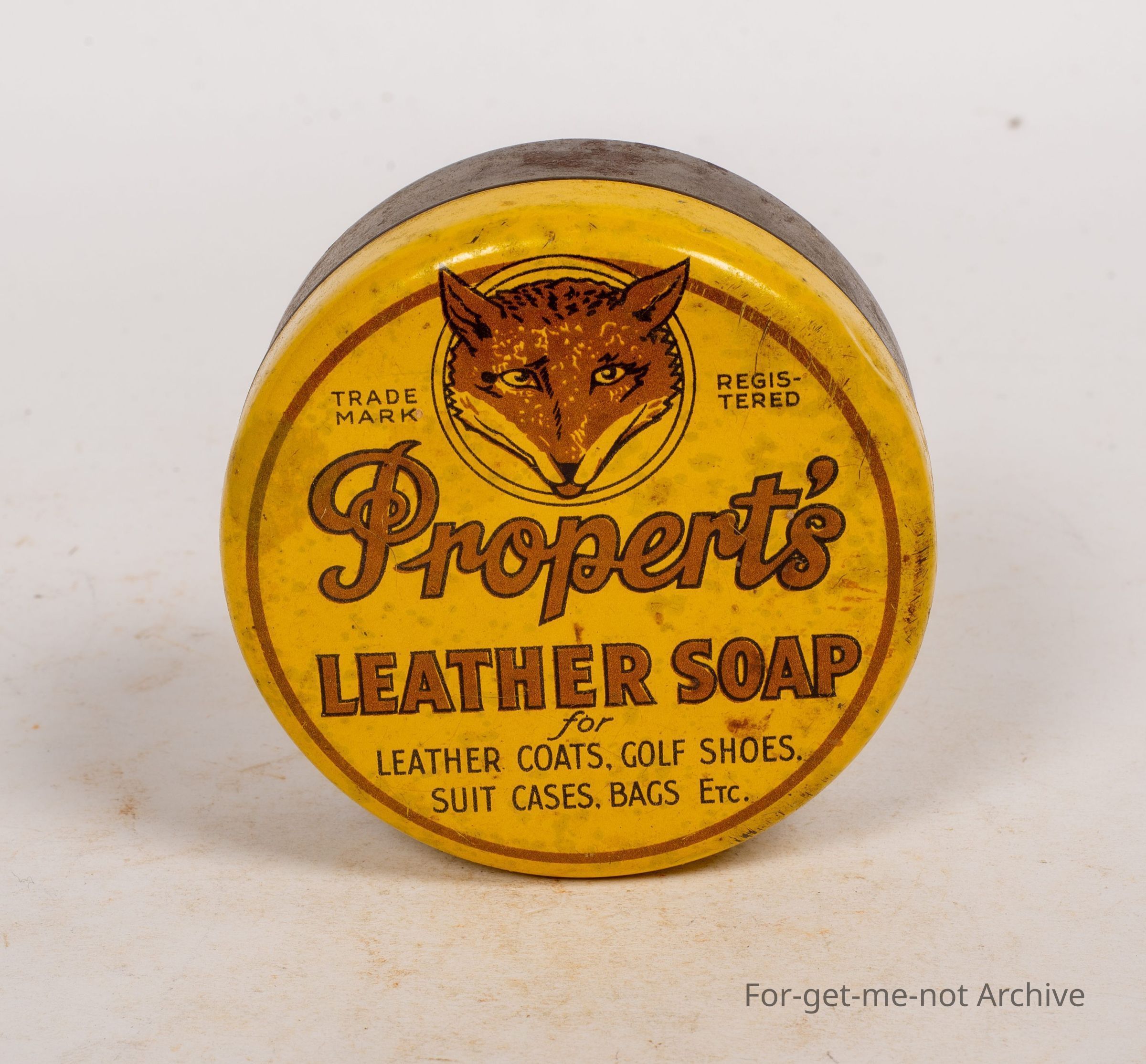 Tin of Properts, leather soap, Lovely order. , Properts leather soap for leather coats, shoes, suitcases, bags, image of fox on the front, packed by Meltonian, Williamstown, Victoria, 4 and a half ouncesCollection