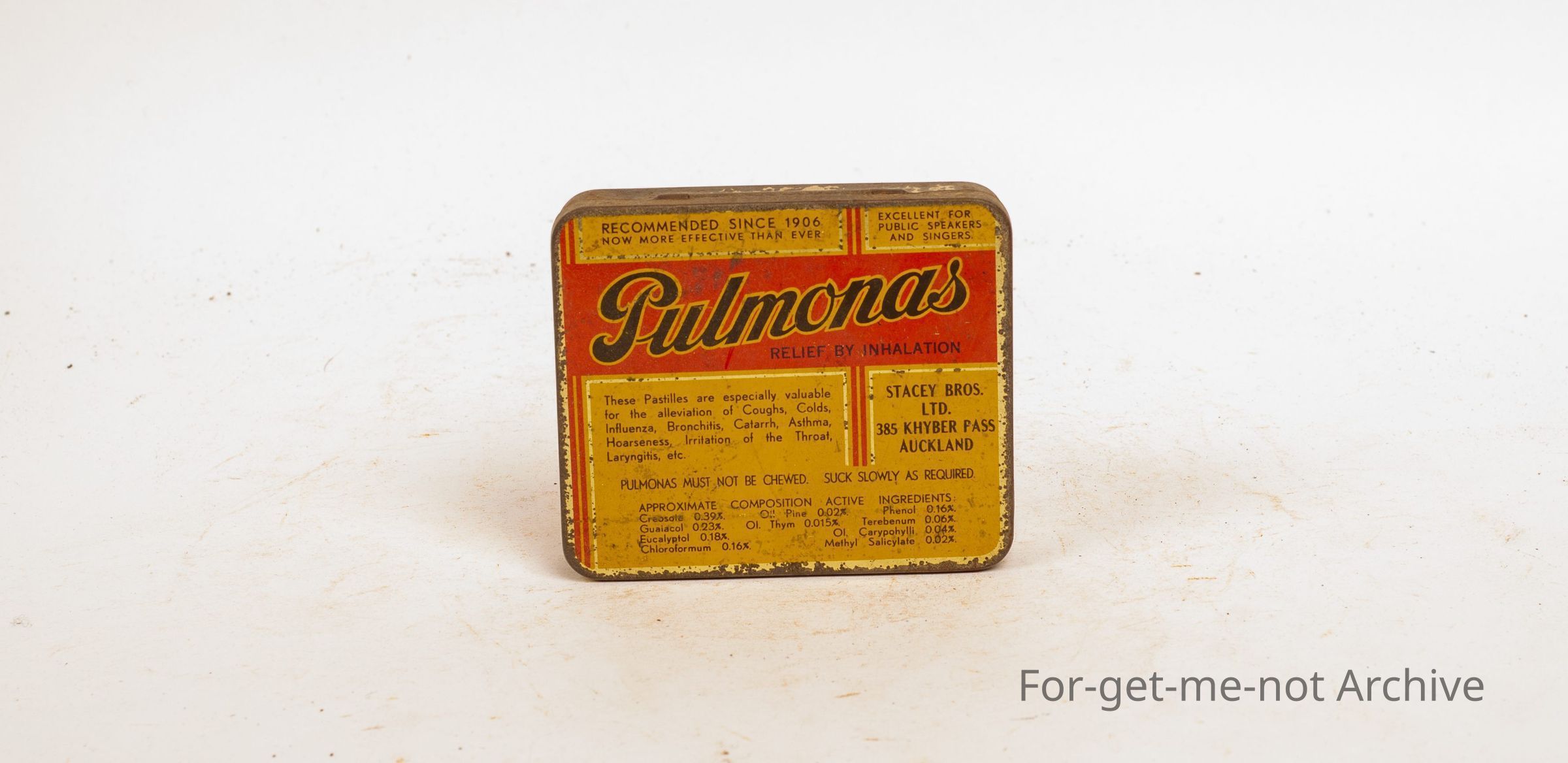 Pulmonas, for releif from Coughs colds, catarrh, asthma, horsness, etc greta for singers and public speakers. Made by Stacy Bros, Aukland
