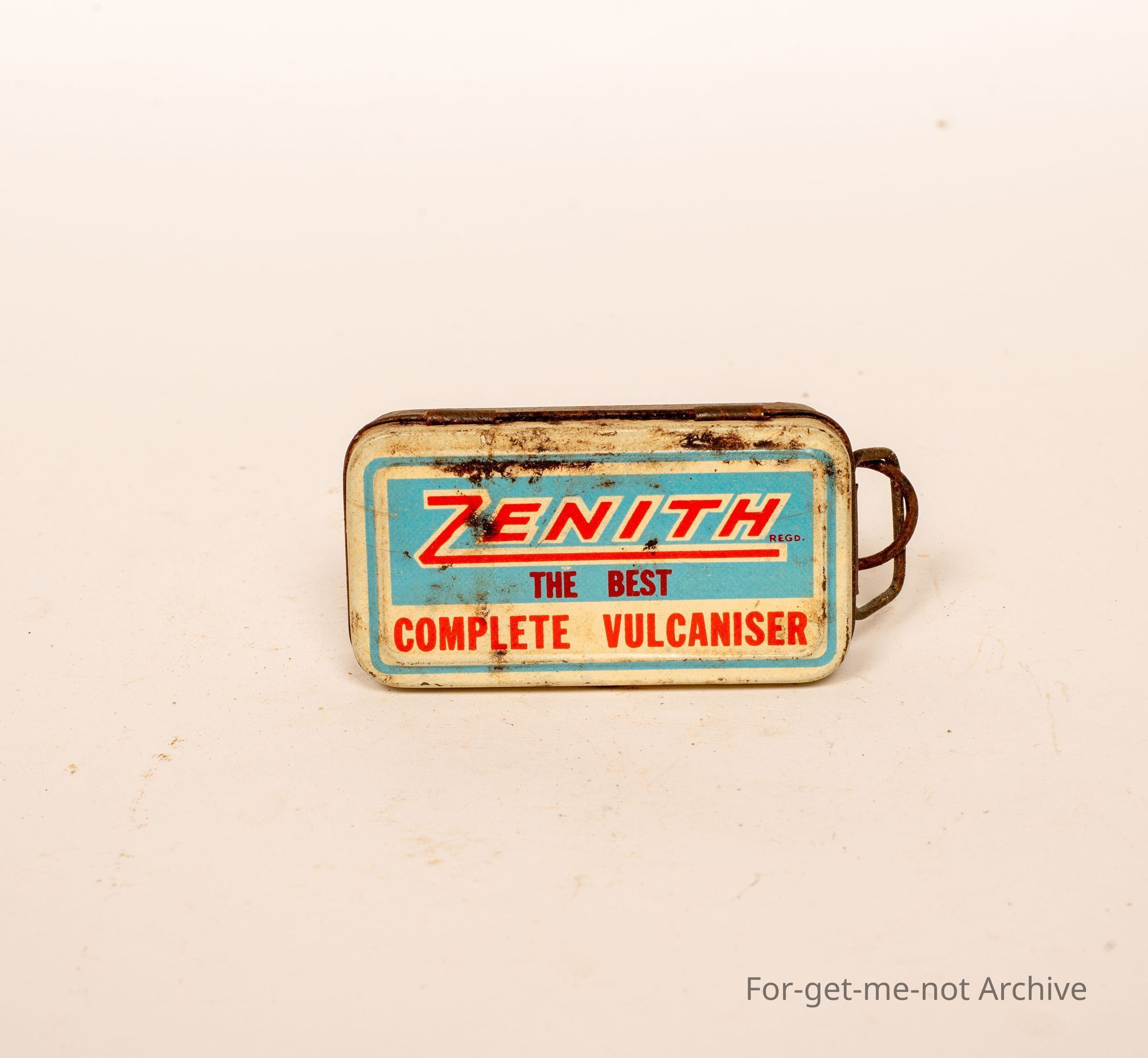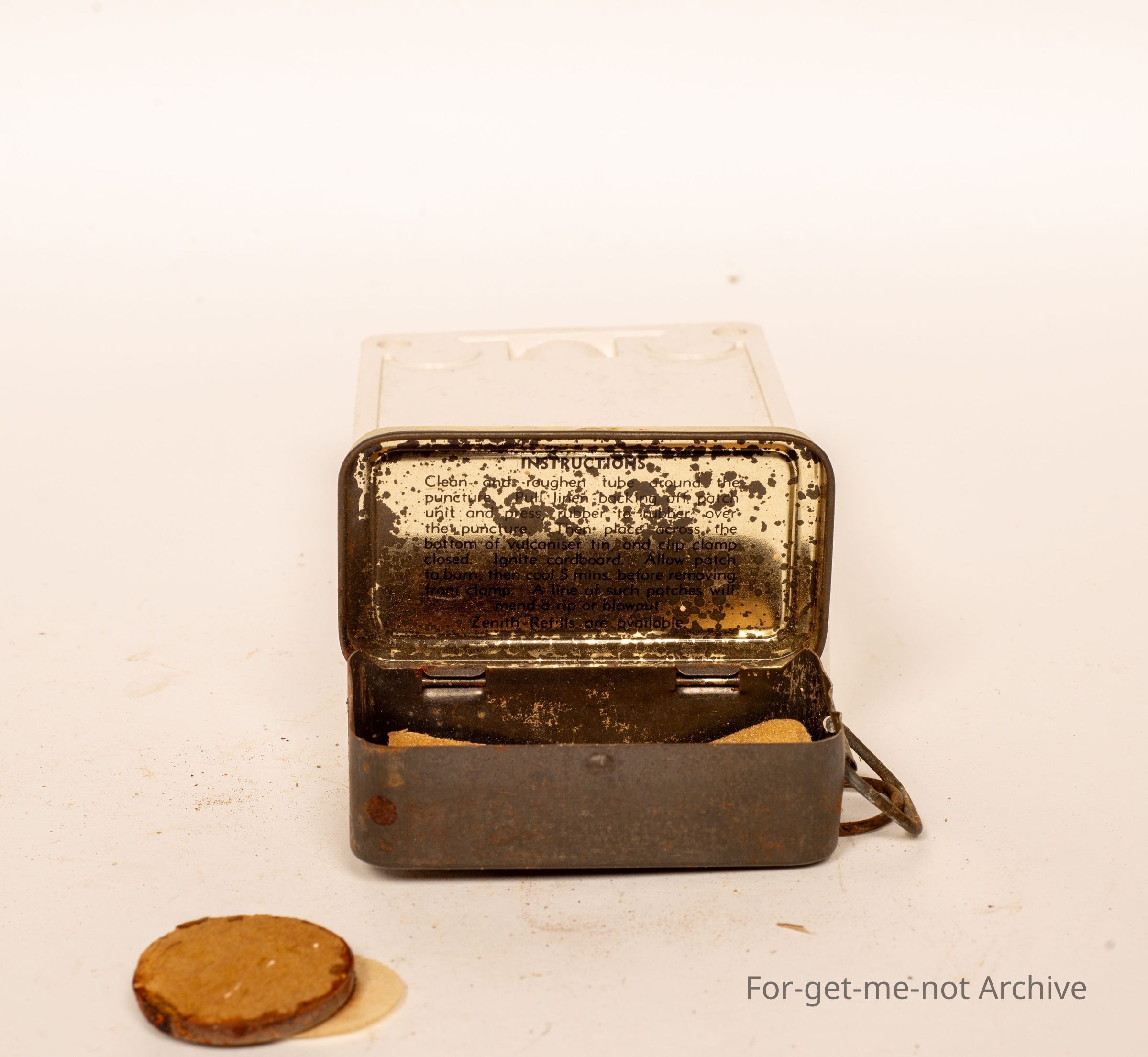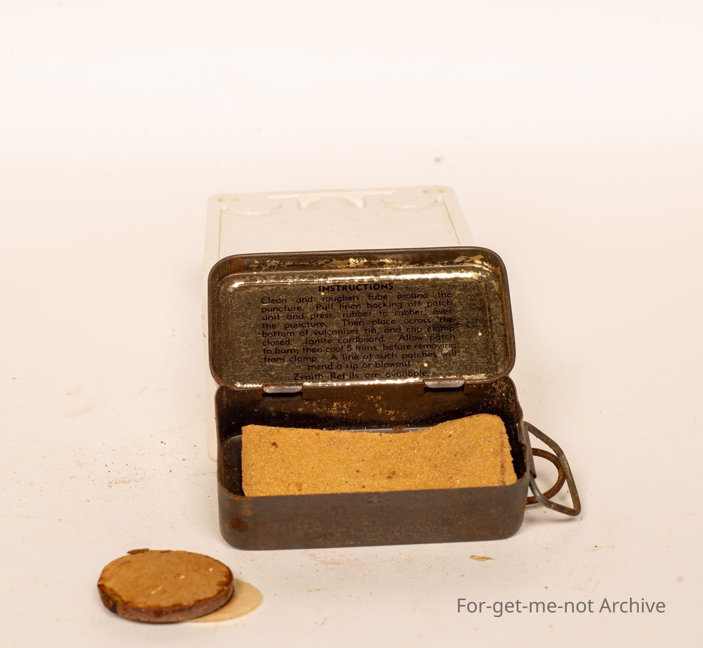 Another Puncher Repair Outfit Tin, this one is from Zenith, the best complete Organizer. The little abrasive part on the back, with contents, in quite good order.