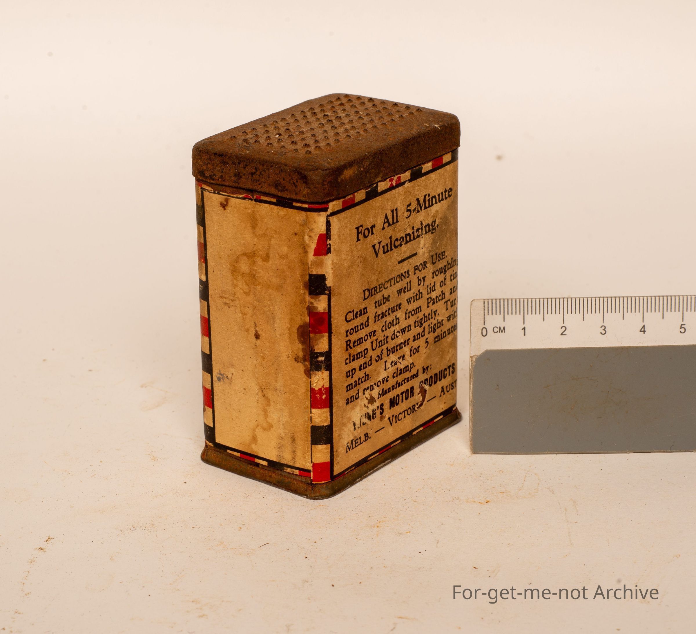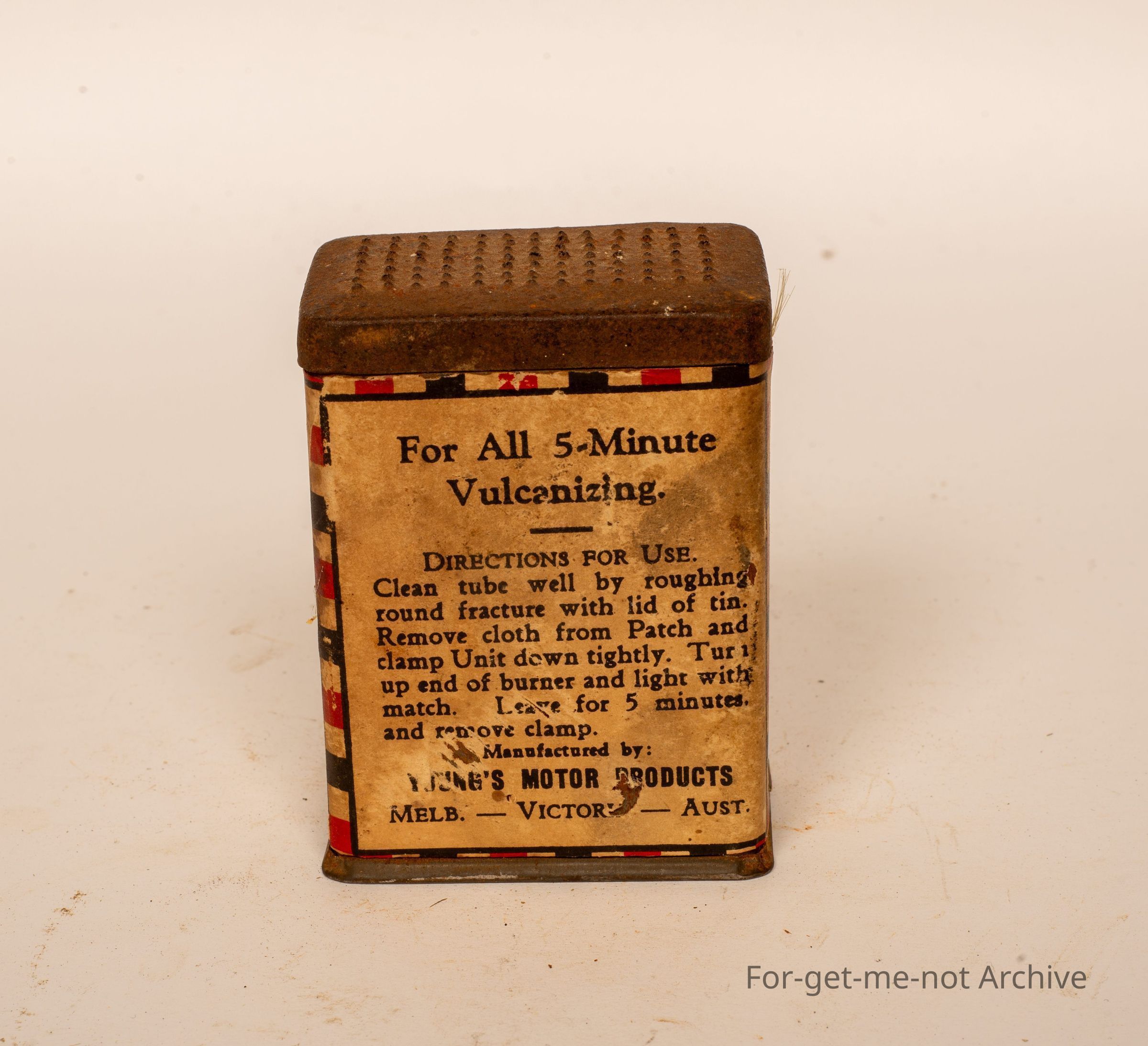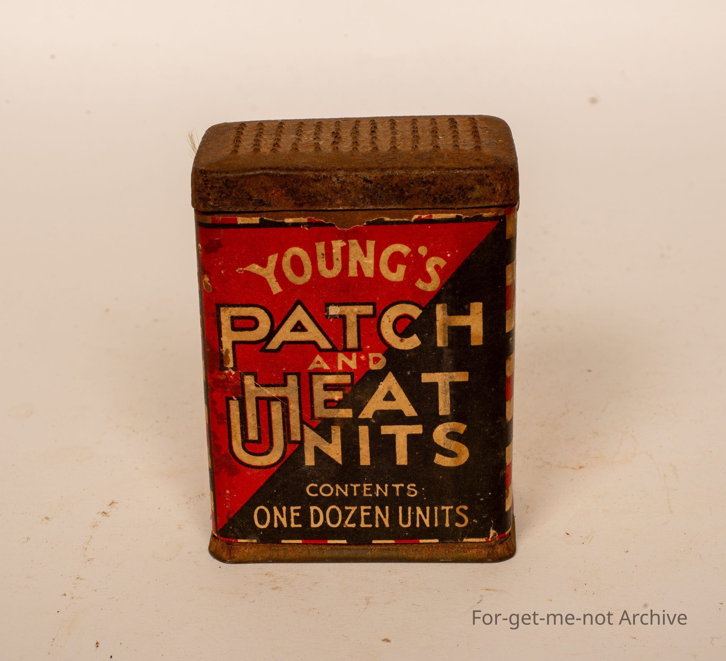 A tin of patch and heat units for repairing puncher outfits. this is from Young's Patch and Heat Units, 1 dozen units. This is Young's Motor Products, Melbourne, Victoria, Australia. Probably a rare tin, paper label, which would make it even harder to find one in this condition.Collection