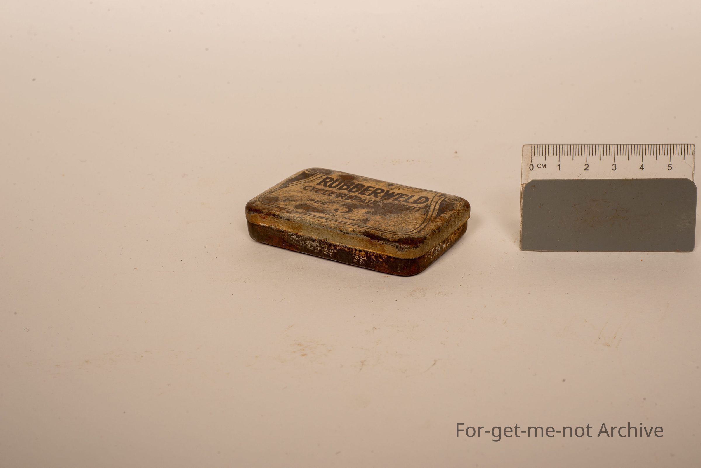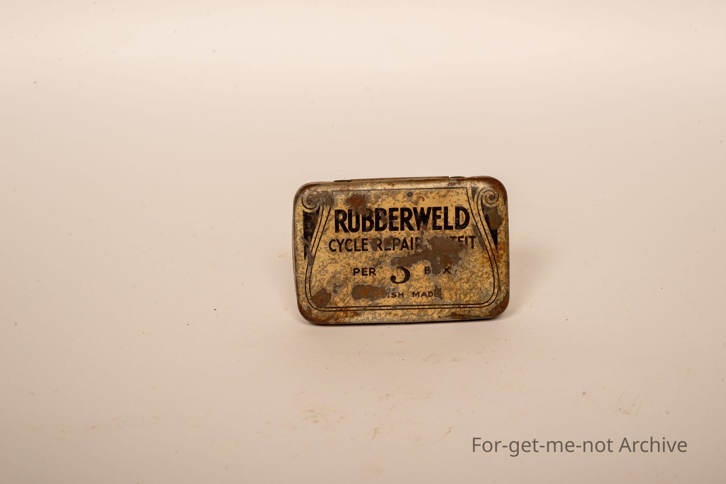 A tin, for the repair of punches. Down and condition again, This chin has been used for a puncture repair outfit, British made. The brand name is called Rubber Weld.