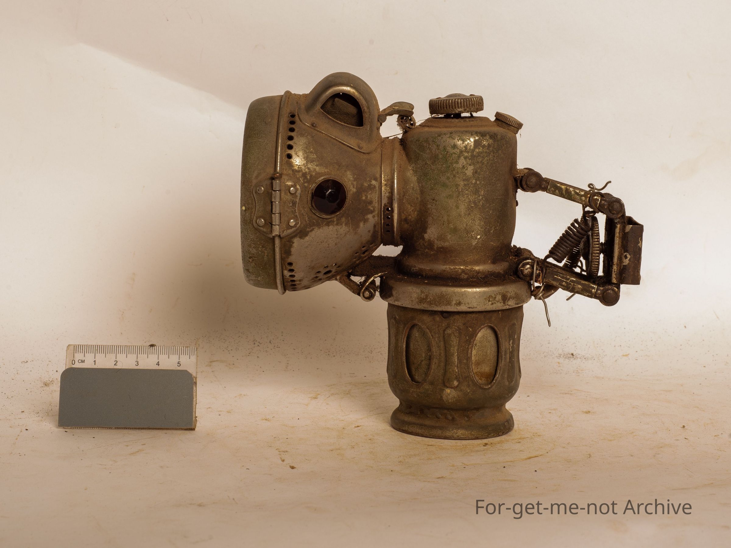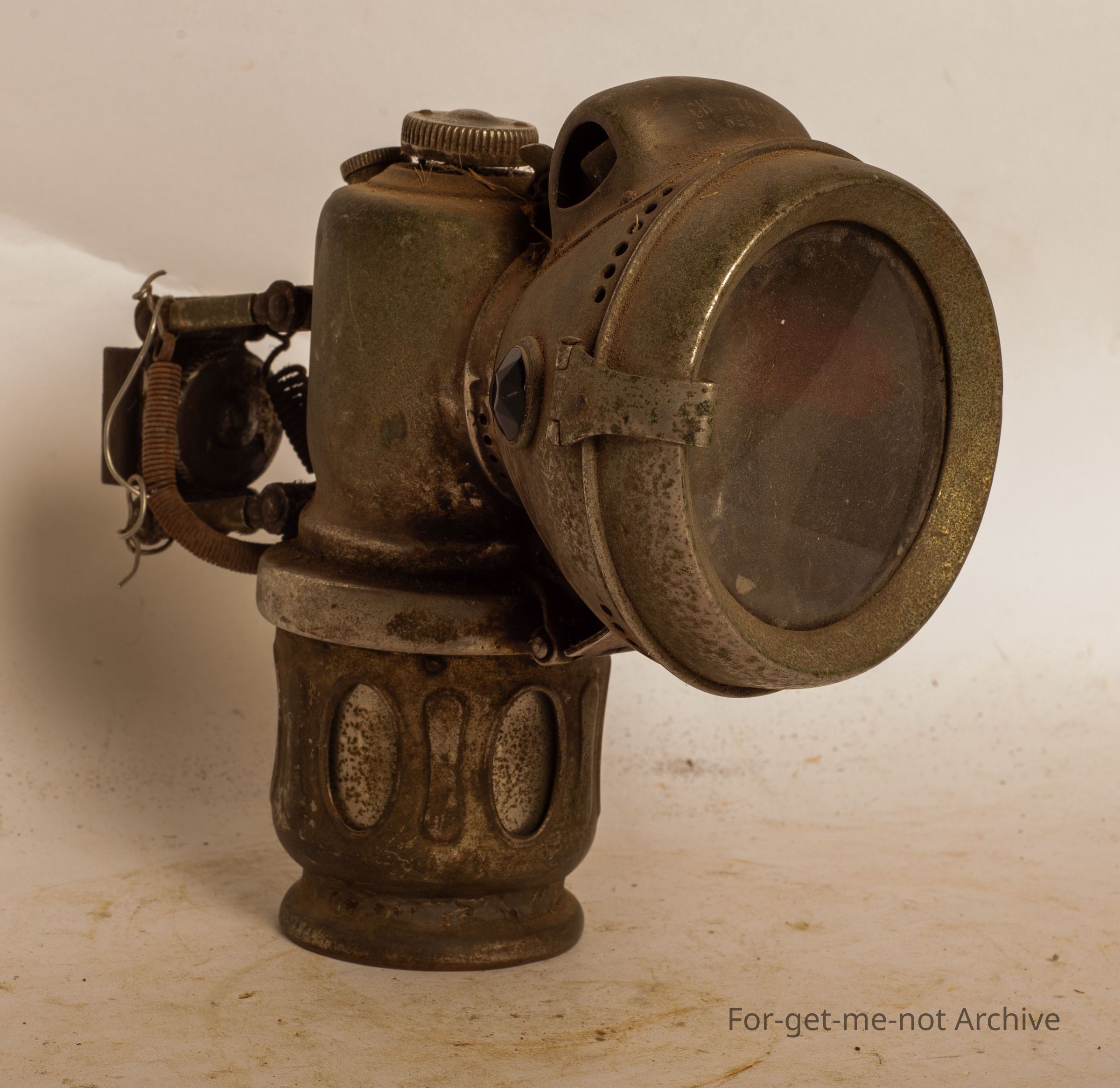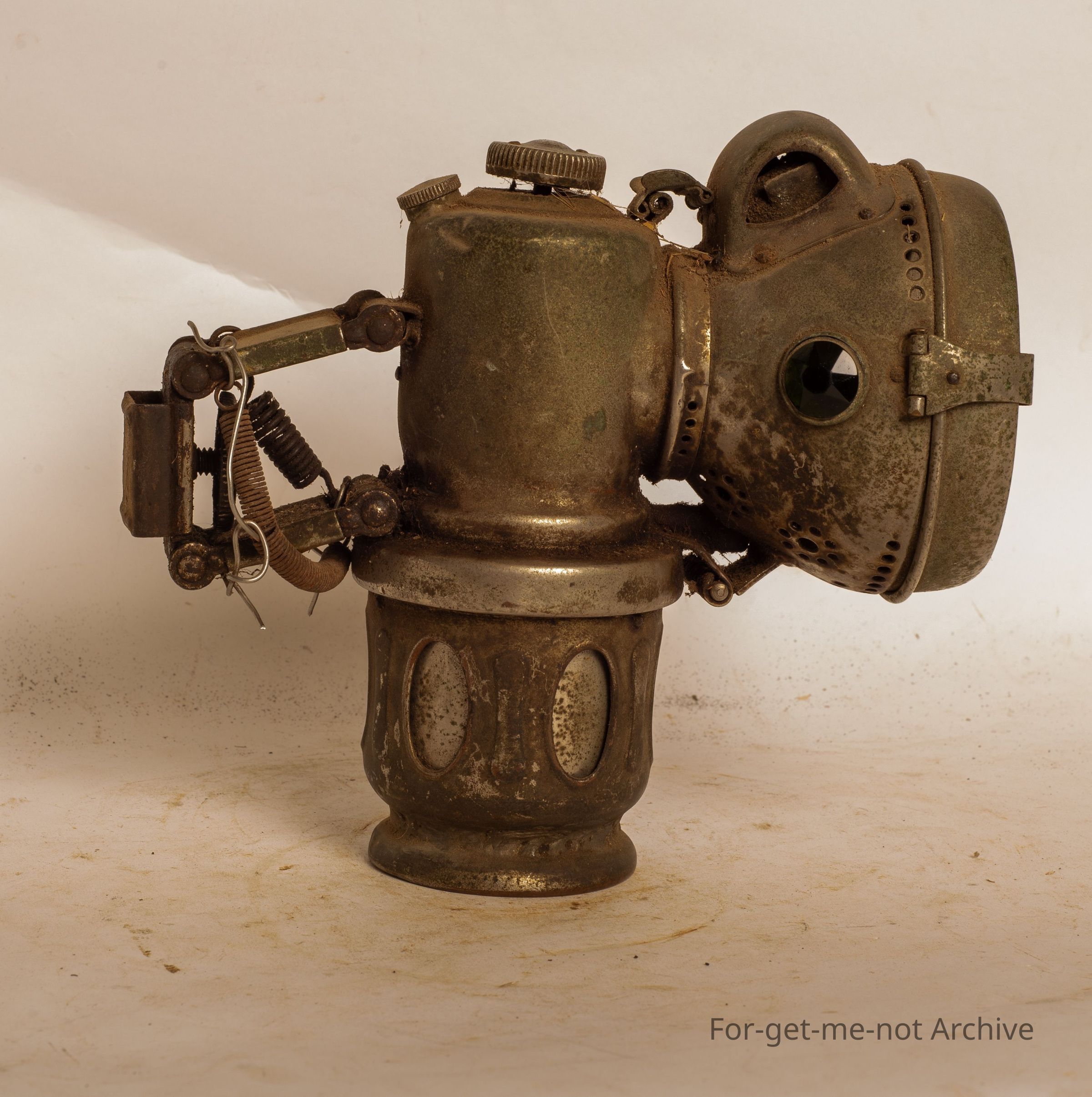 This is a push bike lamp, very early, made by Powell and Hammer, Birmingham, England. All complete, bicycle attachment on the back. This is a carbide light. Quite a wonderful thing.Collection