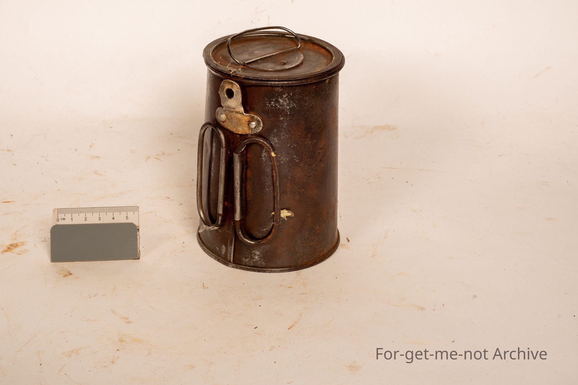 A tapered quart pot, origins Simpson South Australia. Missing its handle and one of the, handle catchers. This is a lighter one. It has an aluminium catcher on it.