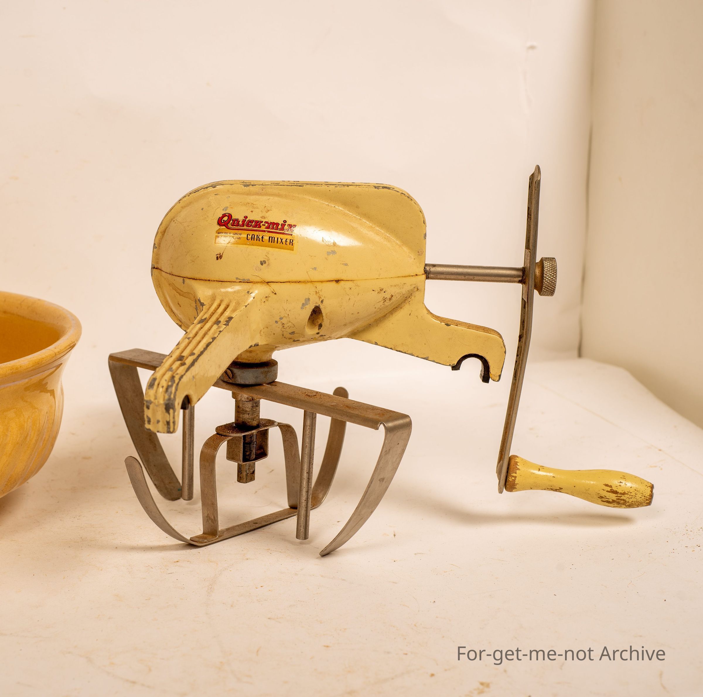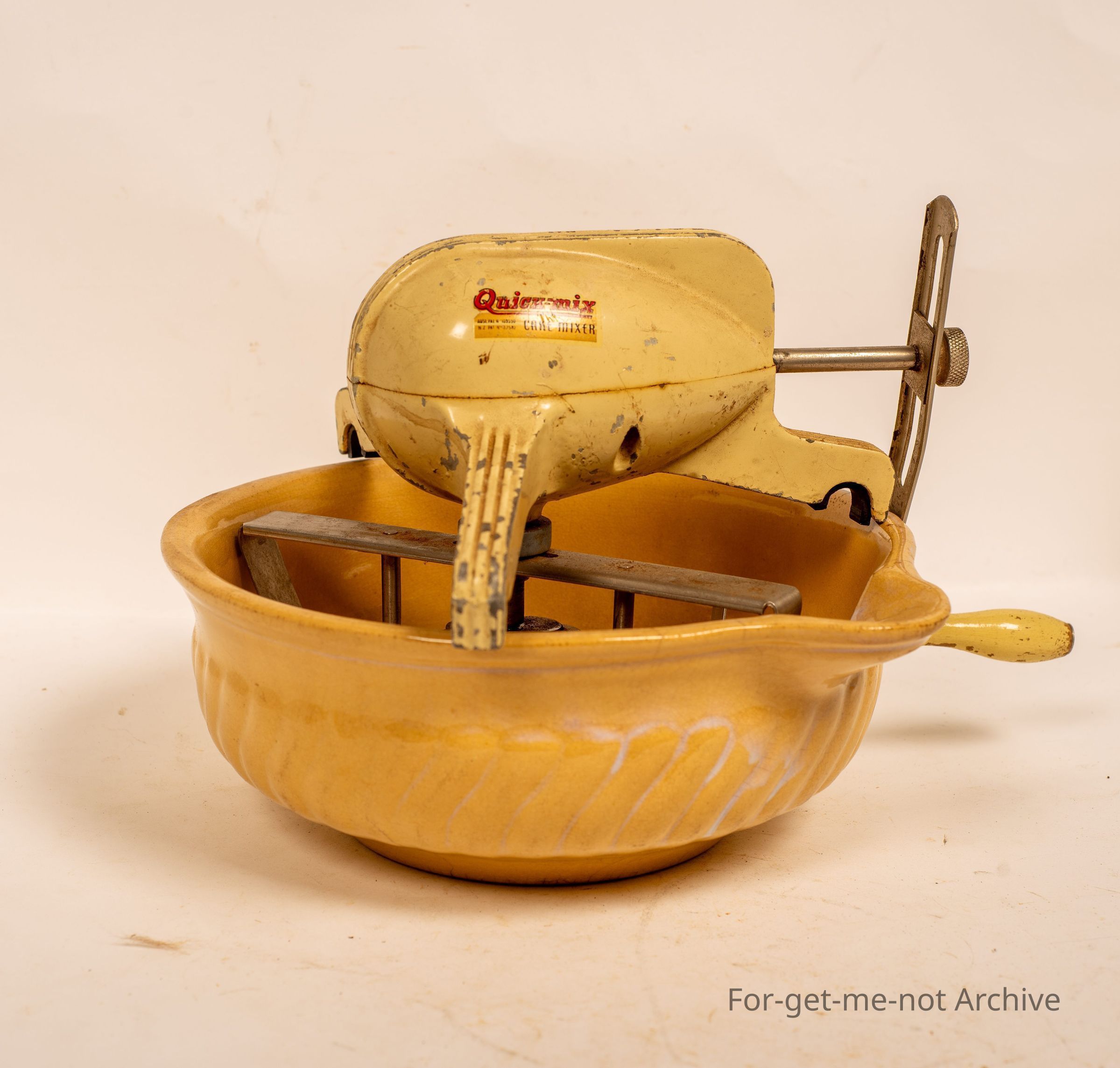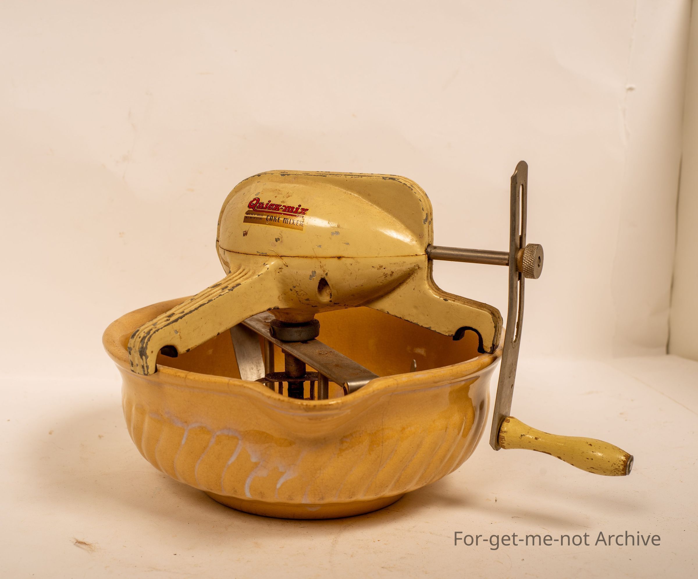 Hand operated with a handle to drive the gearbox, This works in a mixing bowl and rests on the side of the bowl. Pre electric- price includes mixture and the bowl