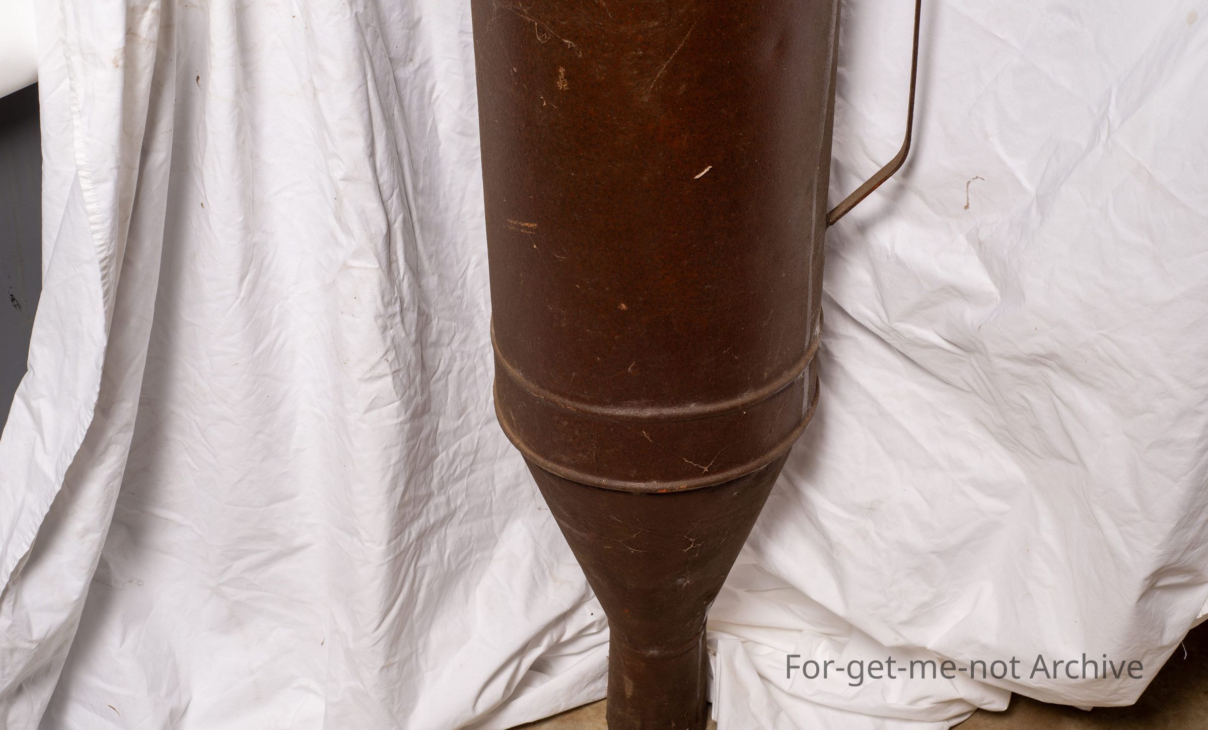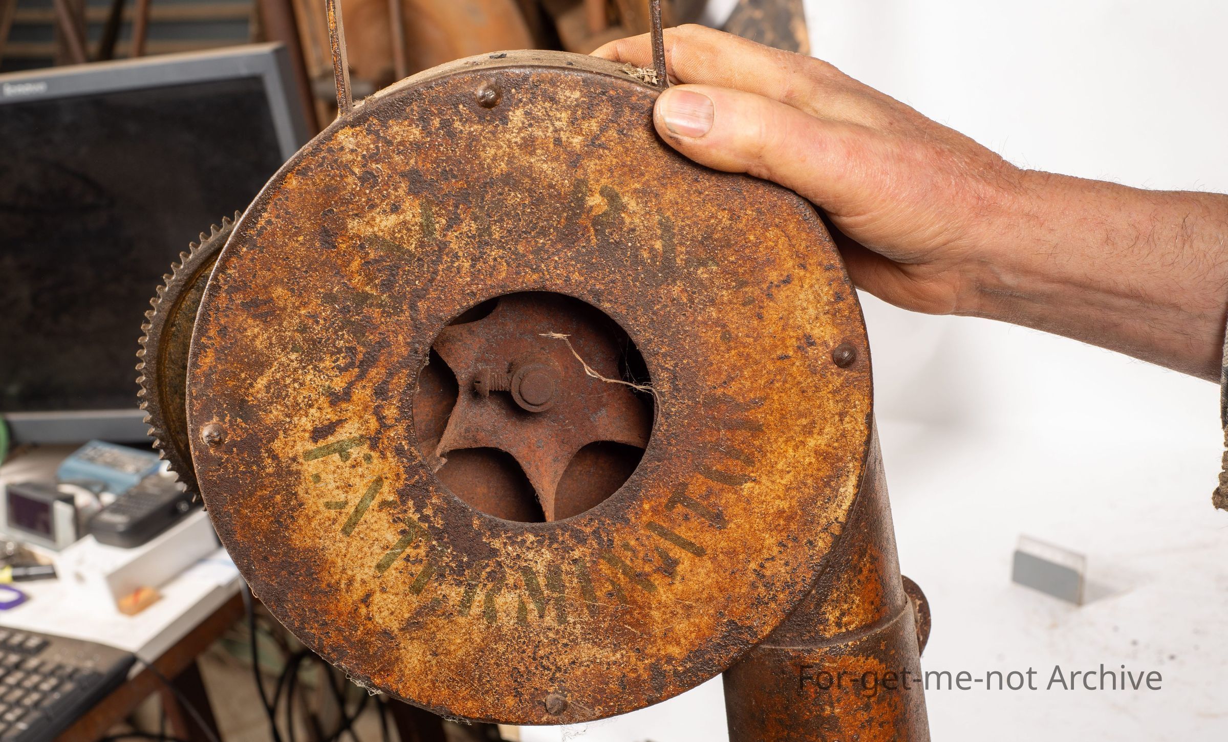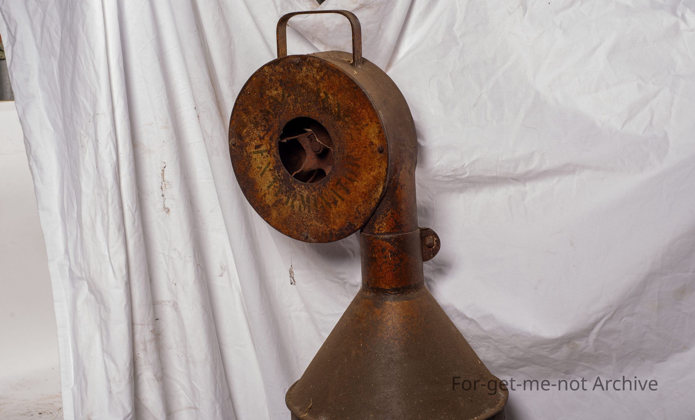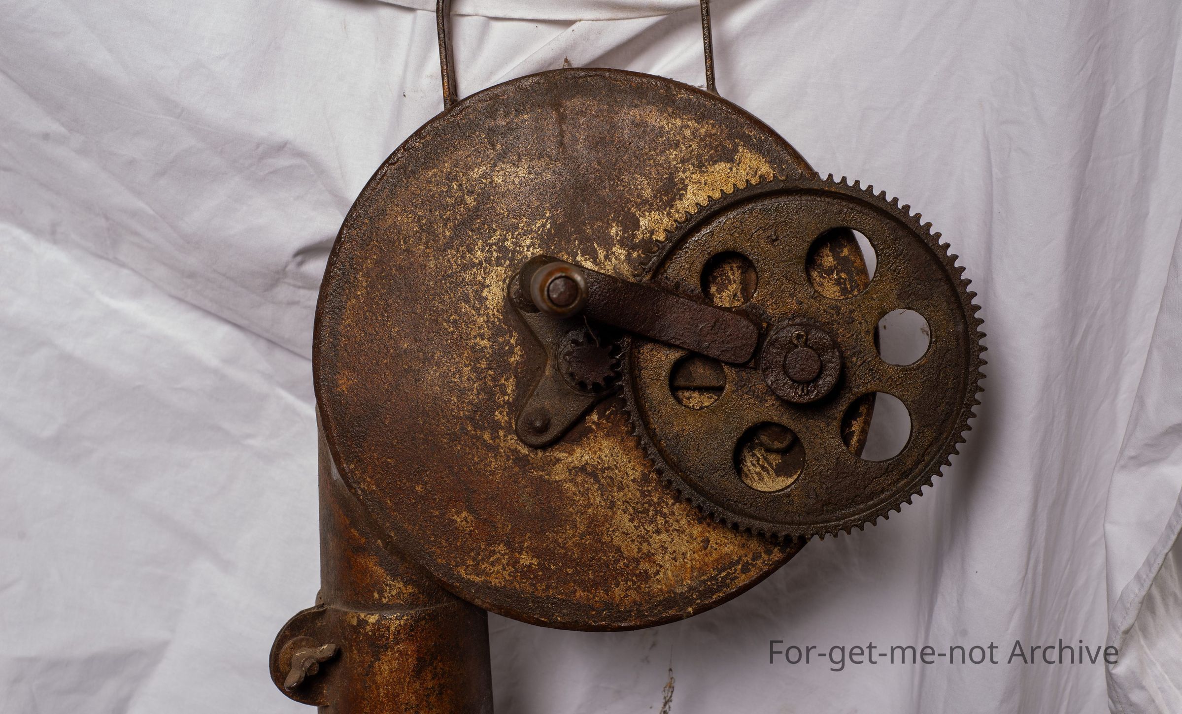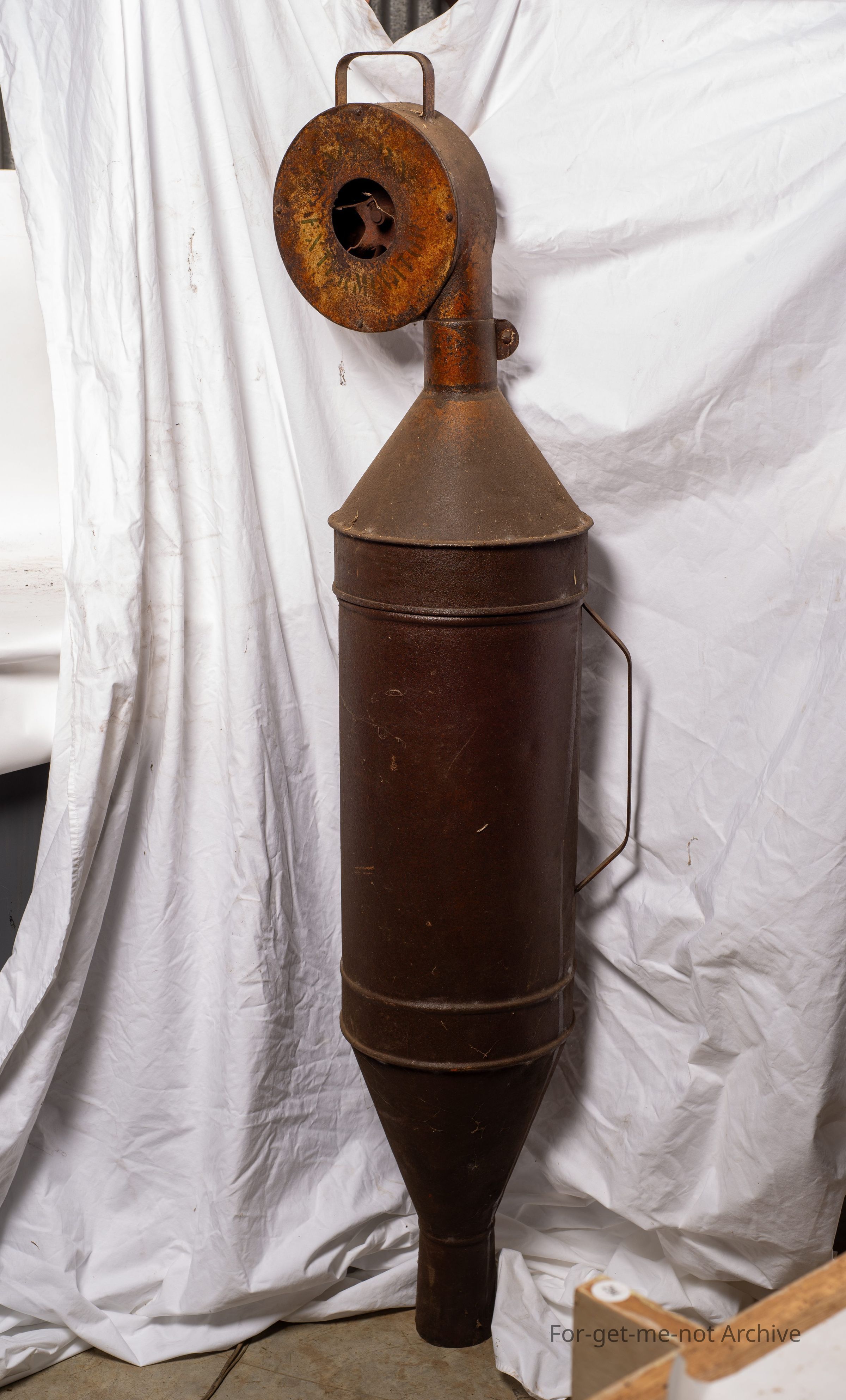 This is from the days of plague rabbits. This was a rabbit fumigator called the exterminator. The barrel was filled with, like, straw, pine needles, gum leaves. The idea was to light it, turn the handle at its speed where it only pushed the smoke out without igniting the fuel inside. It was mixed with cyanide powder to kill rabbits in burrows. Very rare to find one in working condition.Collection