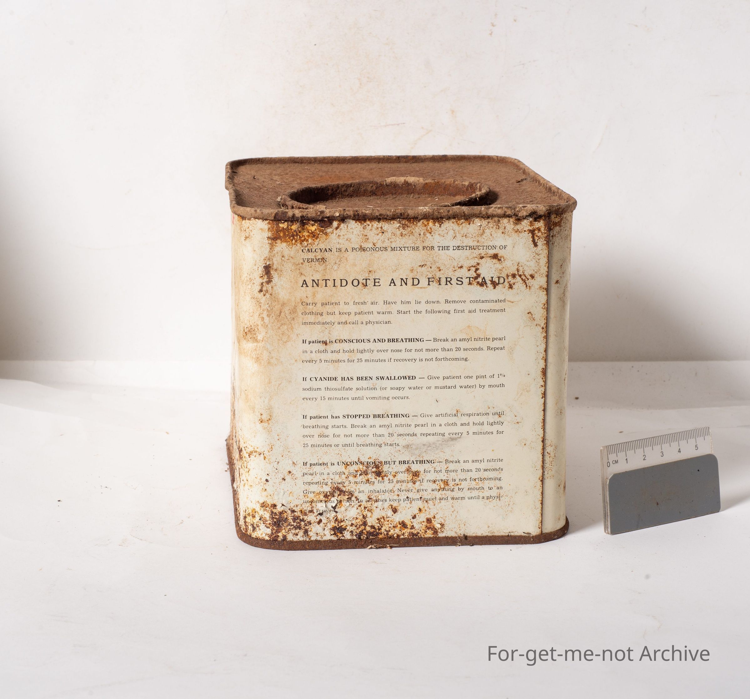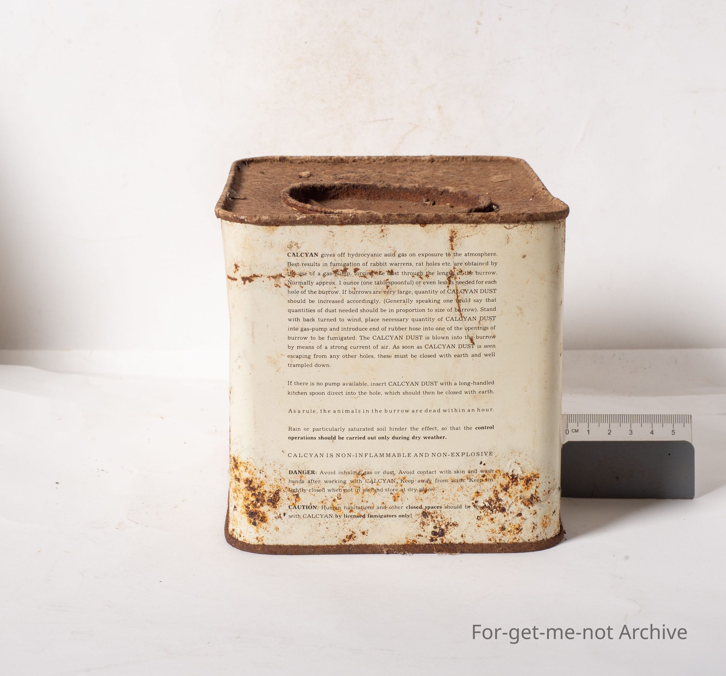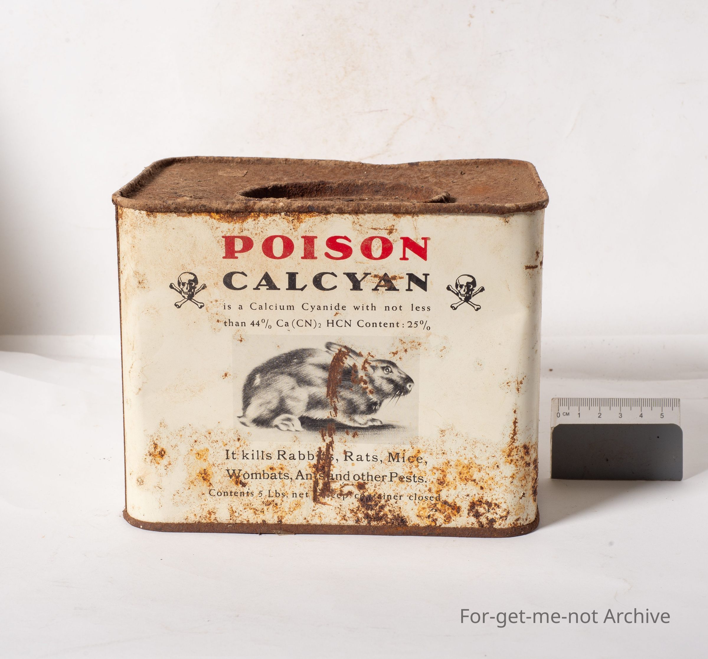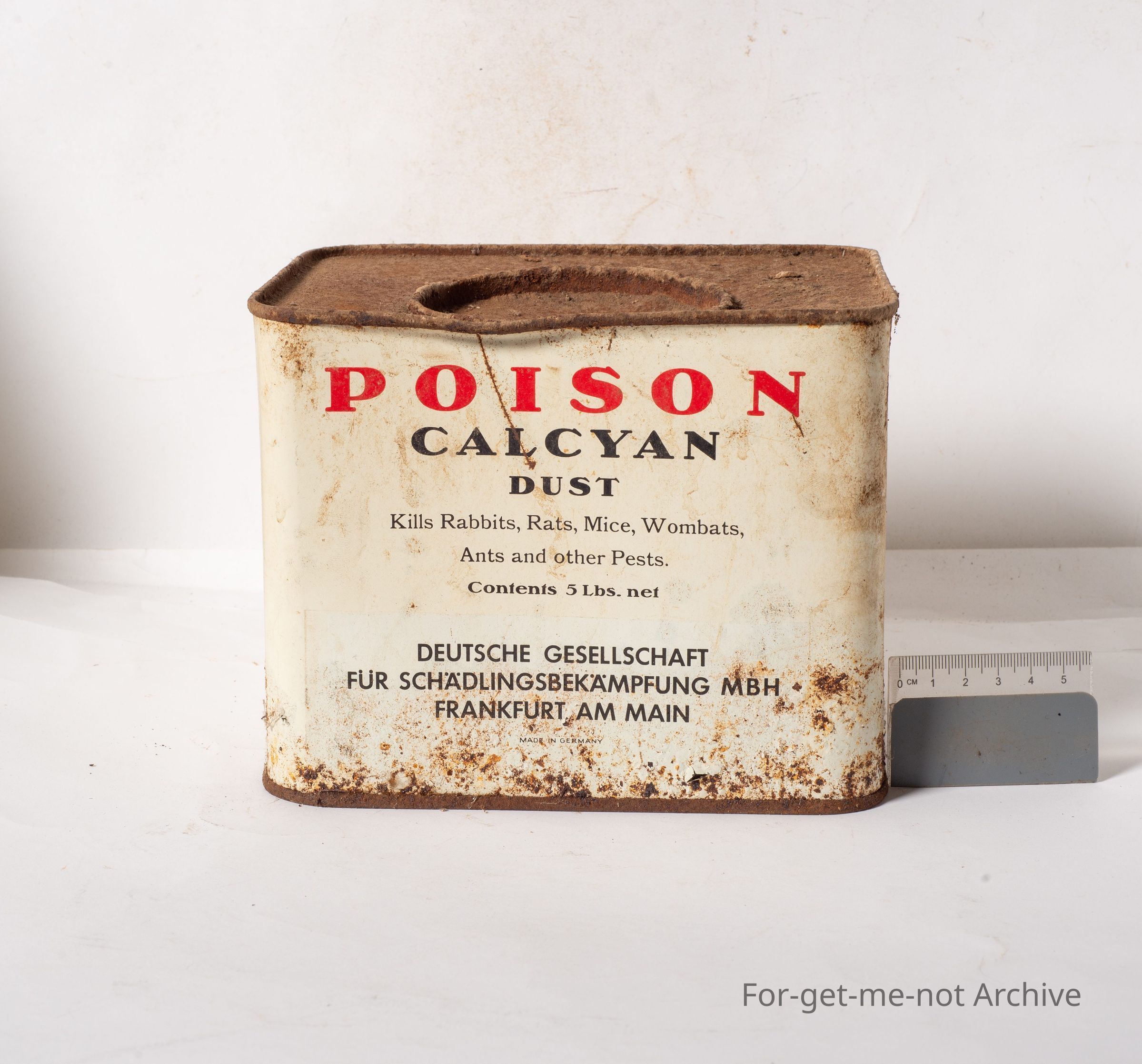 This is a tin of Calcium cyanide dust which was used for killing rabbits, rats, mice, wombats, ants, and anything else. Brand "Calcyan "Produced by Duchar, some European name, Frankfurt, Has the image of a rabbit on one side. Pretty hard tin to find, but, a dangerous one too. This poison was a powder that was loaded into a hand operated air blower that when pumped would blow the poison dust down the rabbit hole, after all entrances had been blocked with dirt. effective but super dangerous for the farmer. The tin even has instruction on how to revive the operator, options include if they are still breathing, on not, ... Also handy to have a vial of Amyl Nitrate pearl on hand as well ???Collection