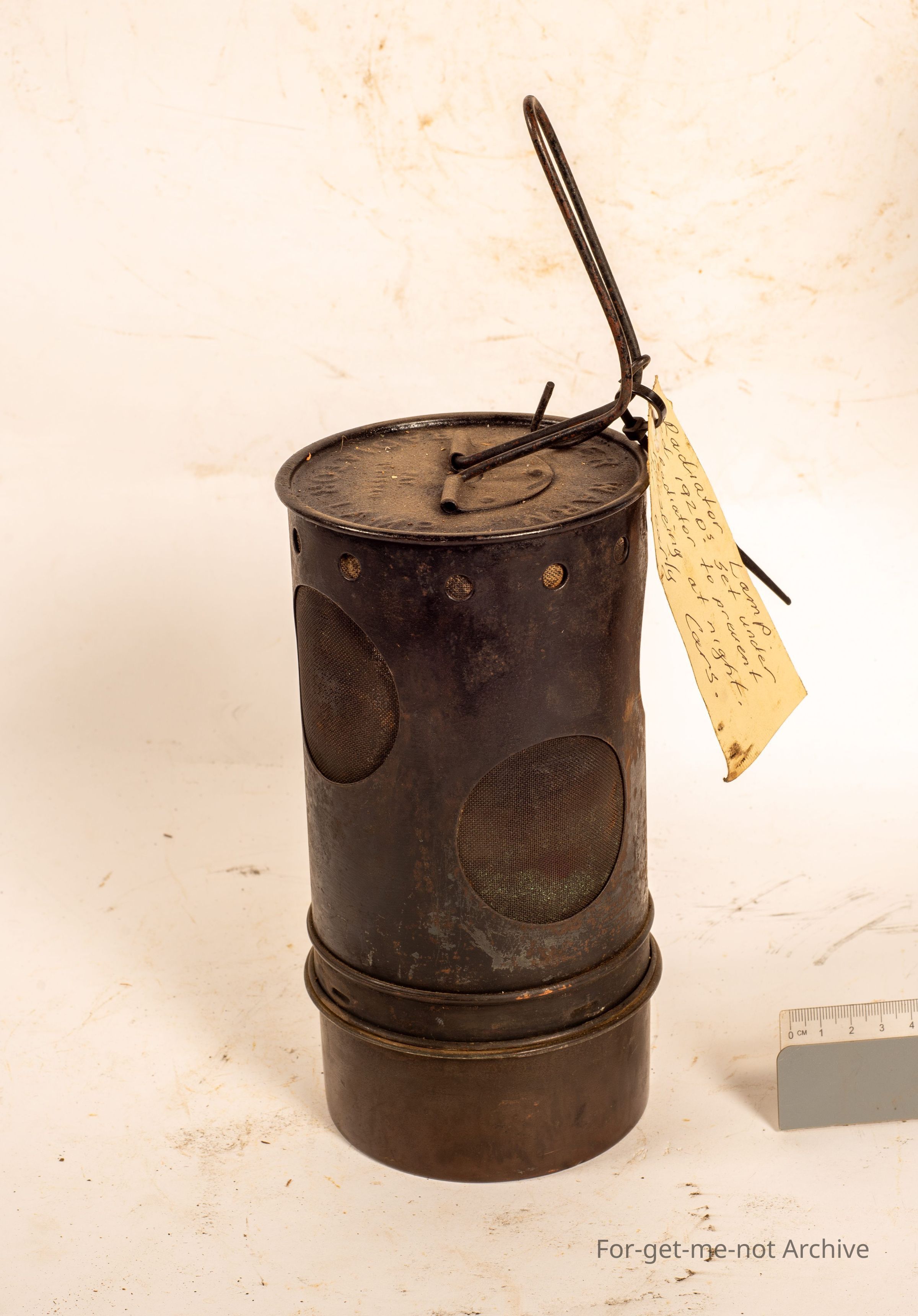 This is rather an unusual lamp. These are referred to as a radiator lamp. The reason for these were they were hung under the front end of very early cars before they decided to build garages. The heat radiated up from the lamp to the, either the radiator or the motor to stop cracks from freezing. Large oils, fuel tanks so they burnt for perhaps 12 hours. Very scarce piece to find.Collection