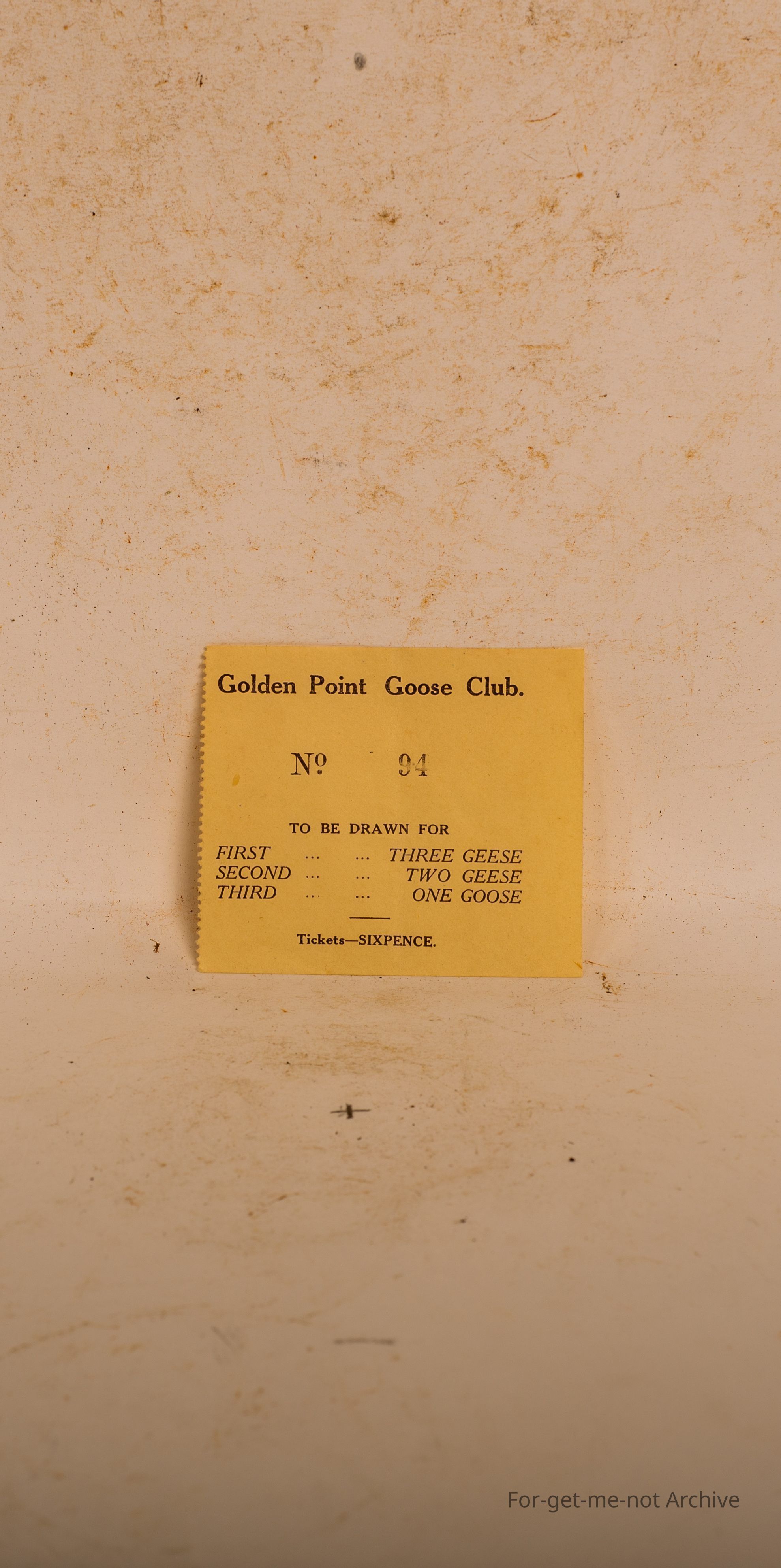 Possibly a raffle ticket for Golden Point Goose Club. Ticket number 24. 1st price, 3 Geese. 2nd price, 2Geese, 3rd price, 1 Goose. Rare item