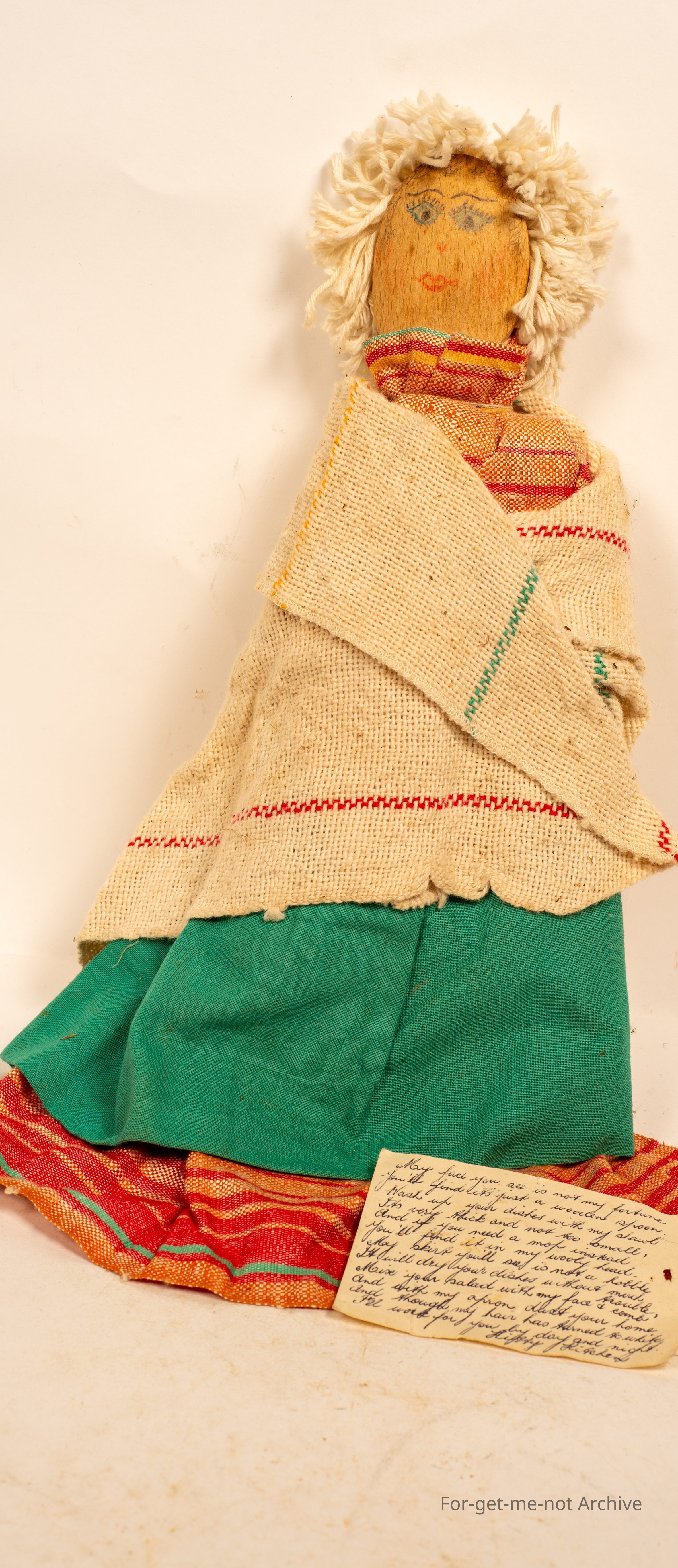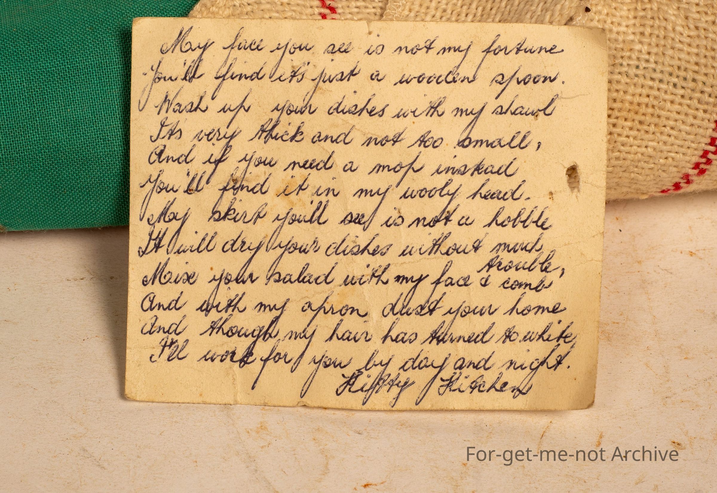 Is a doll that was in a competition to make a doll entirely from pieces used in the kitchen. So it consists of tea towel, dish cloth, wooden spoon, all made up to represent a doll with the story attached to Annie Lillian, love from Robin and Barbara. Now,Collection