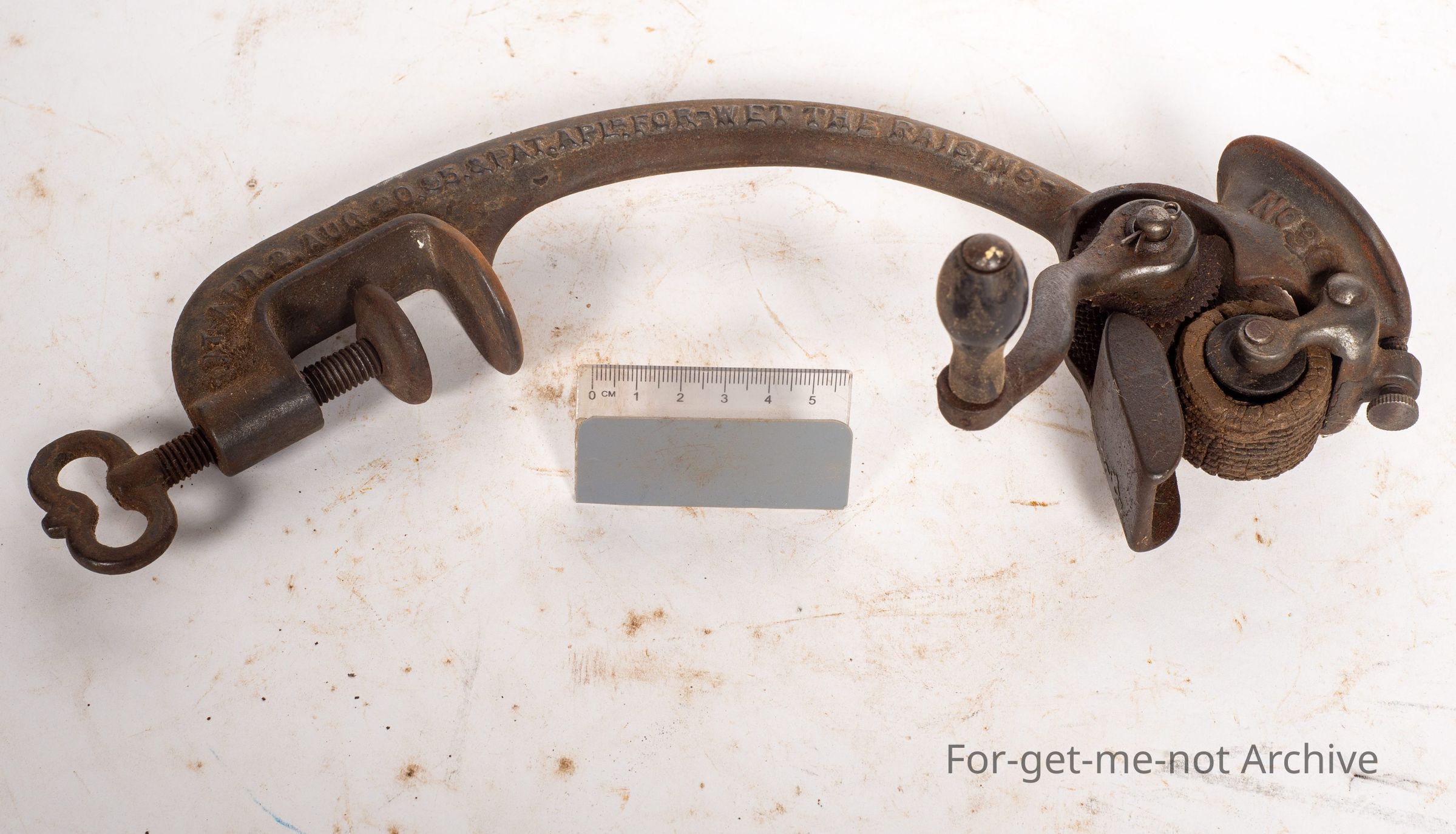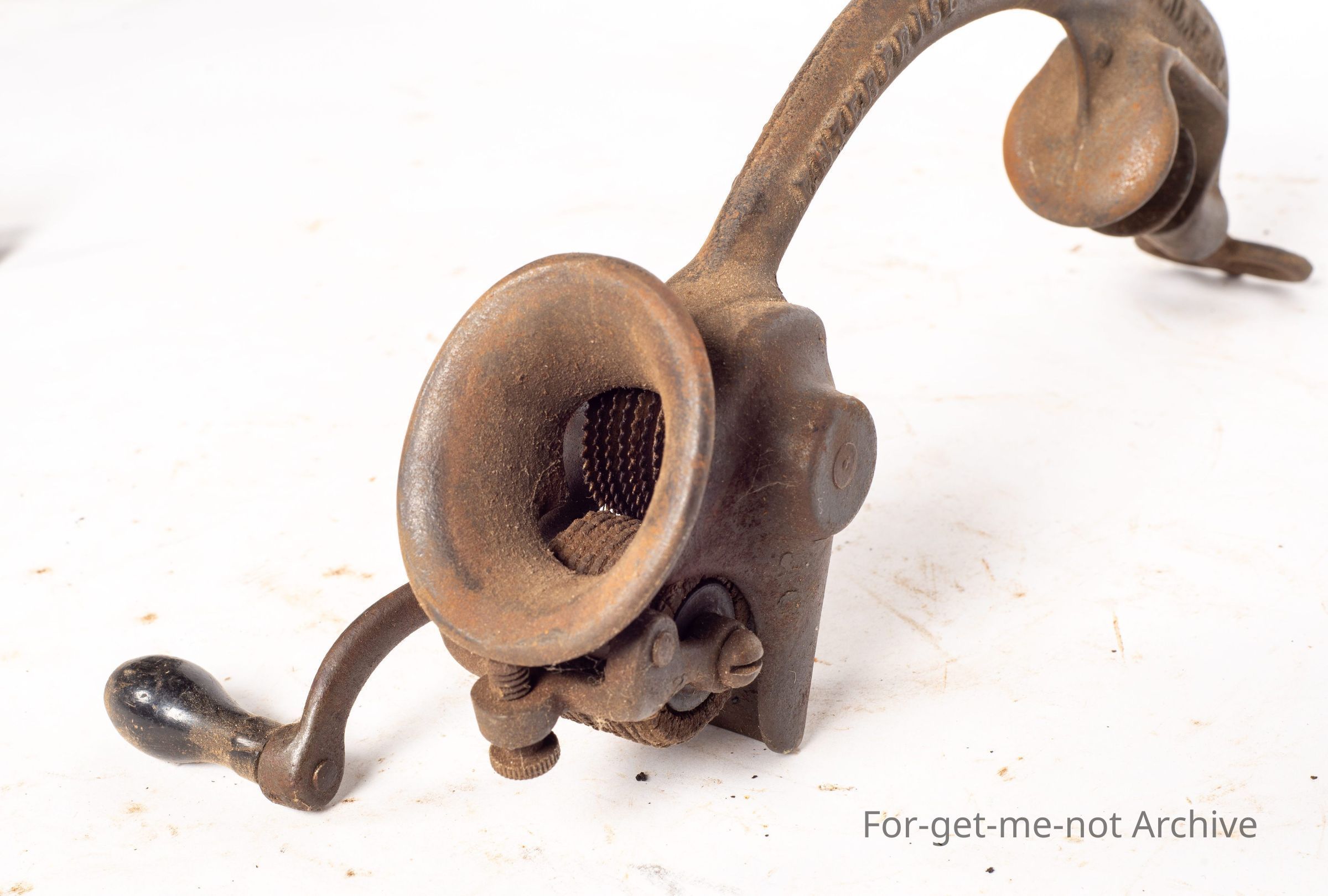 This is a cast iron, raisin cedar. Clamps onto the table. Small handle that rotates on a wooden knob, all intact.