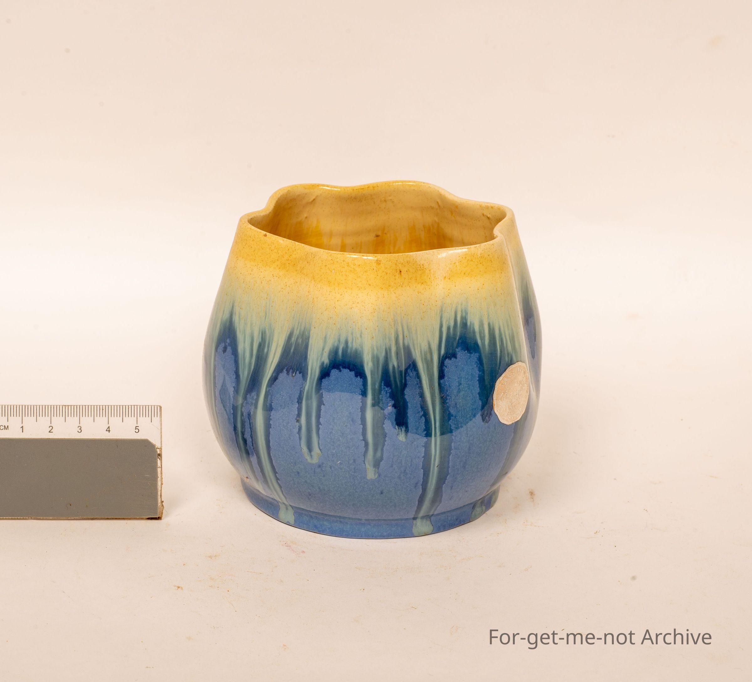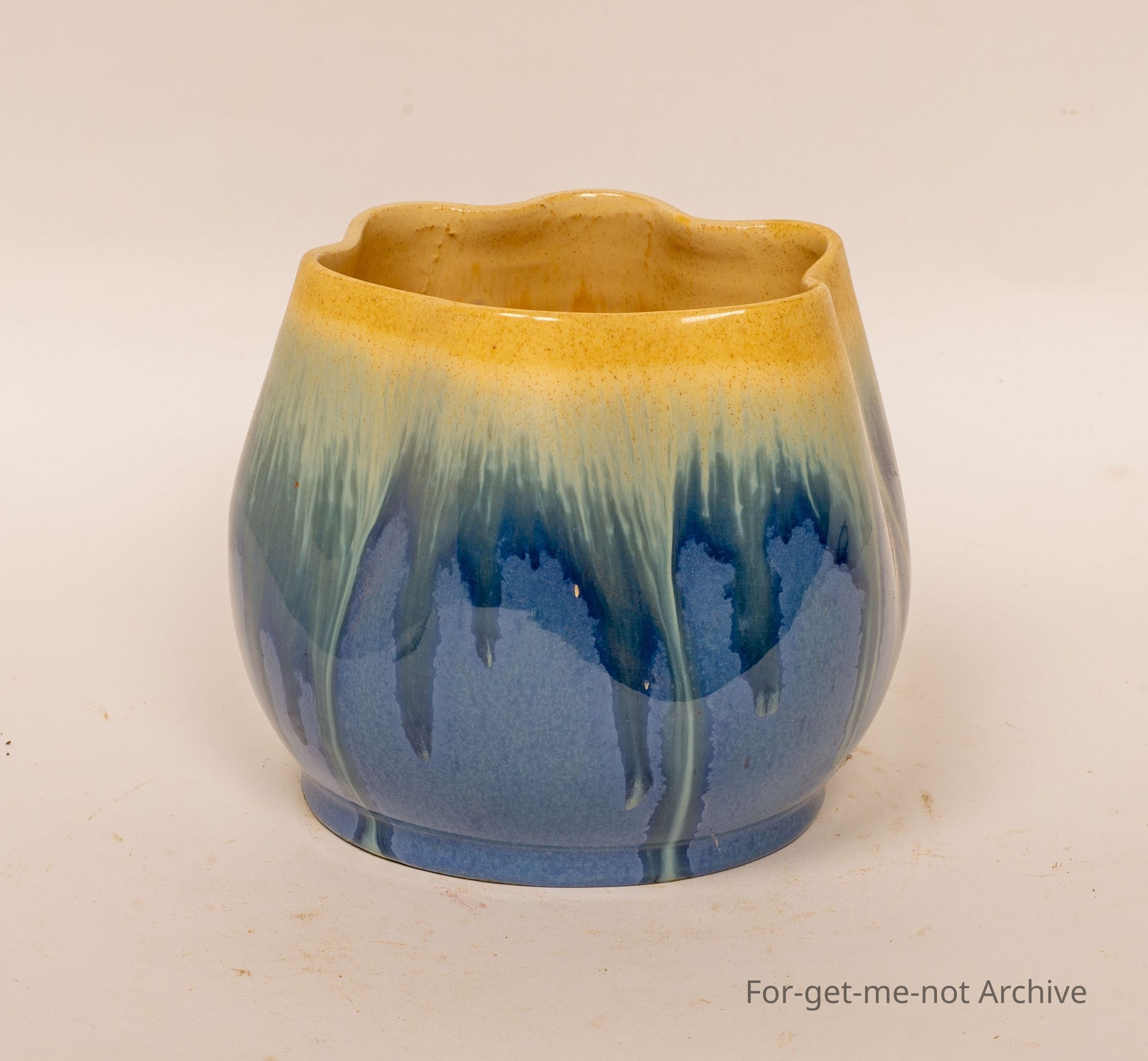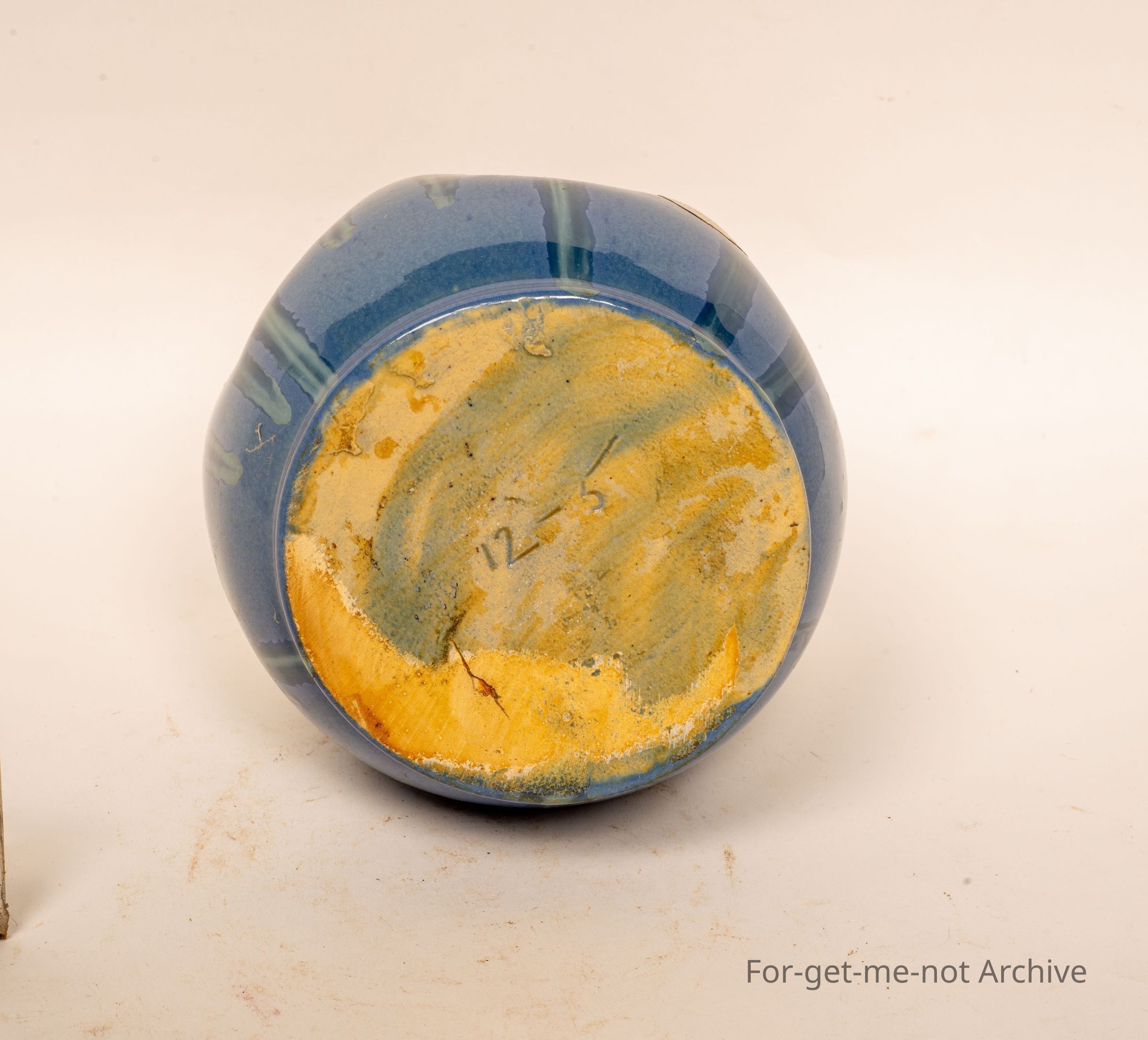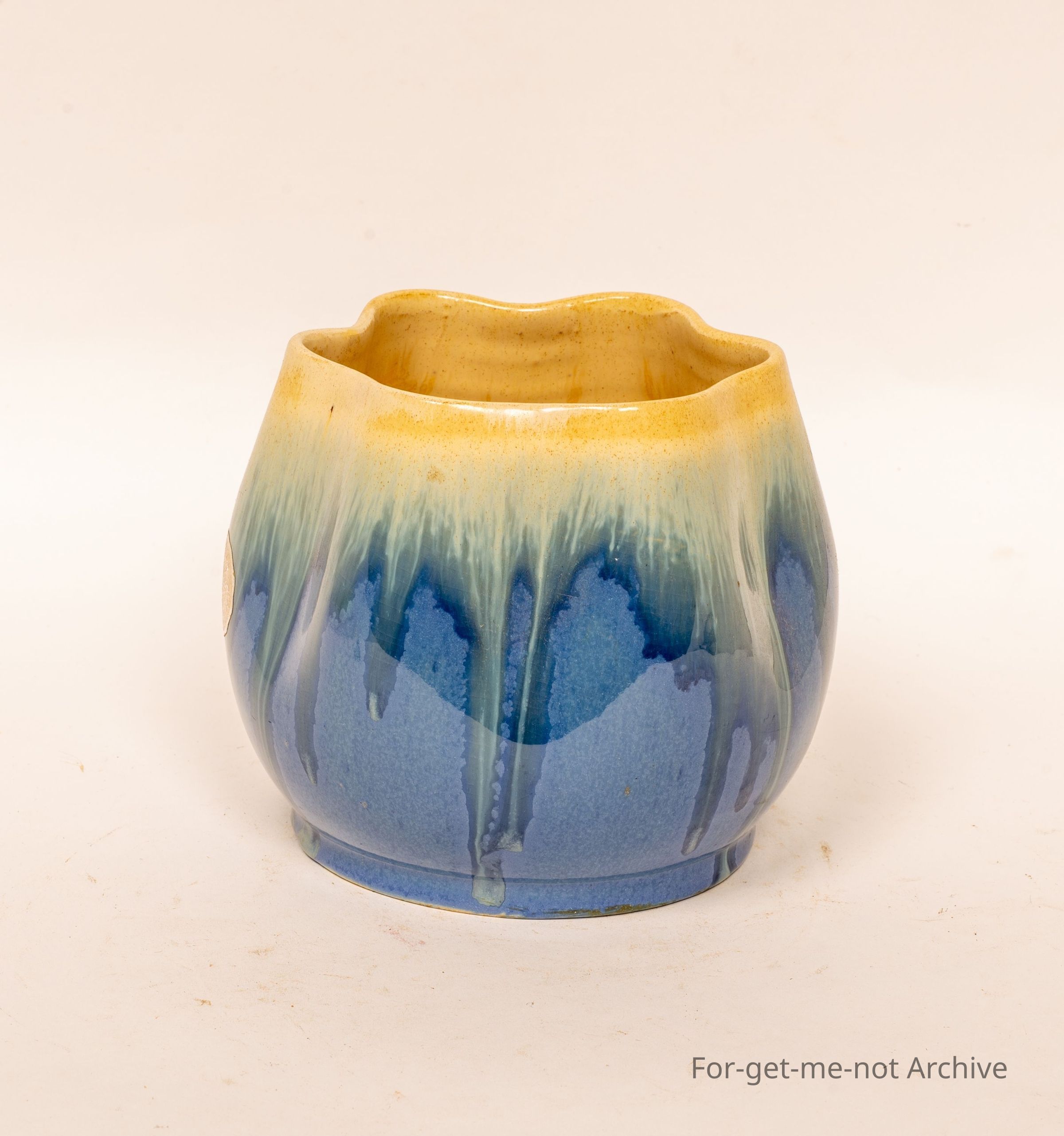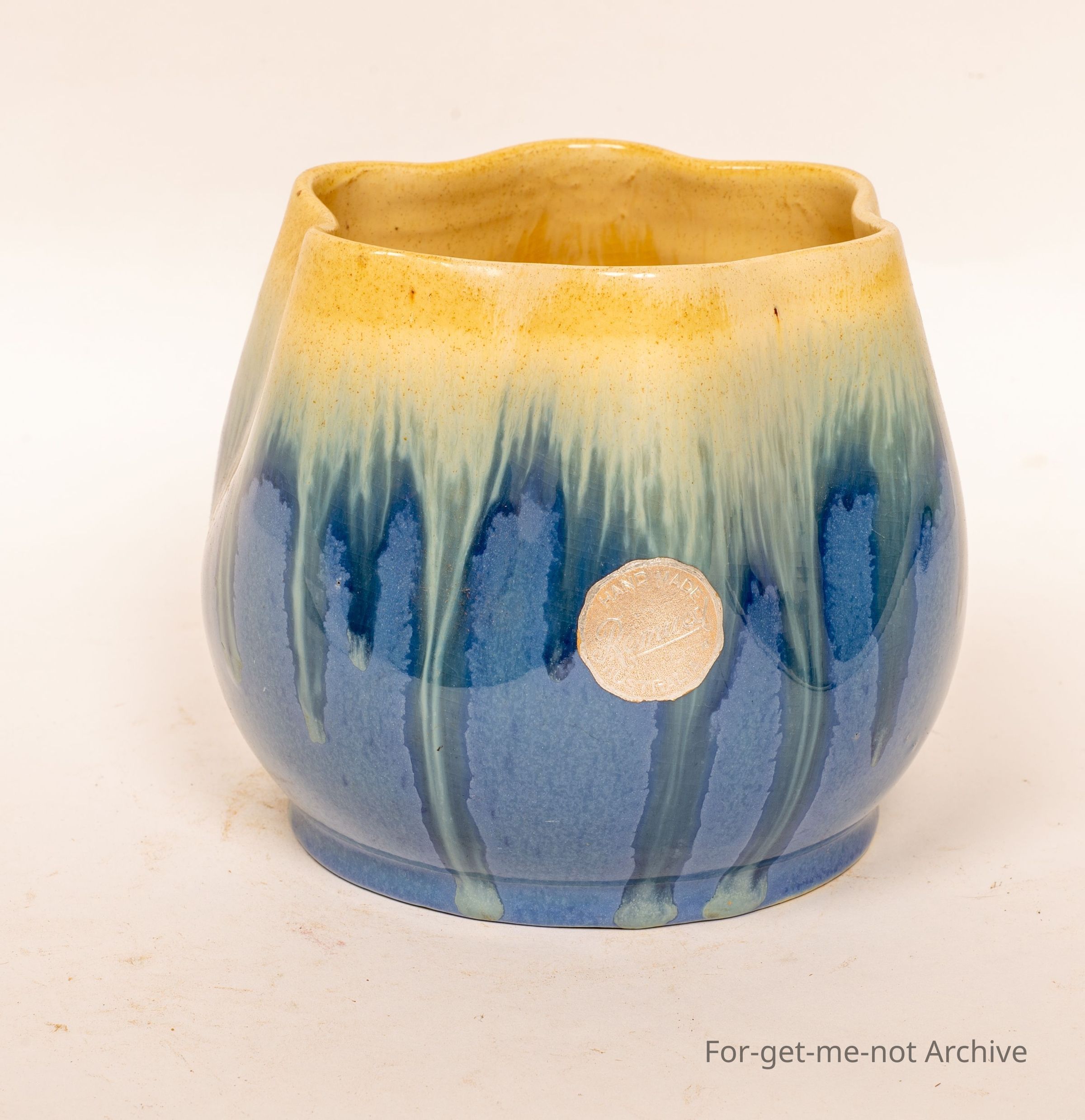 This is a lovely little blue vase, fluted top, glaze that runs from cream to blue. No signature on the bottom, but a silver foil stamp of Ramued.