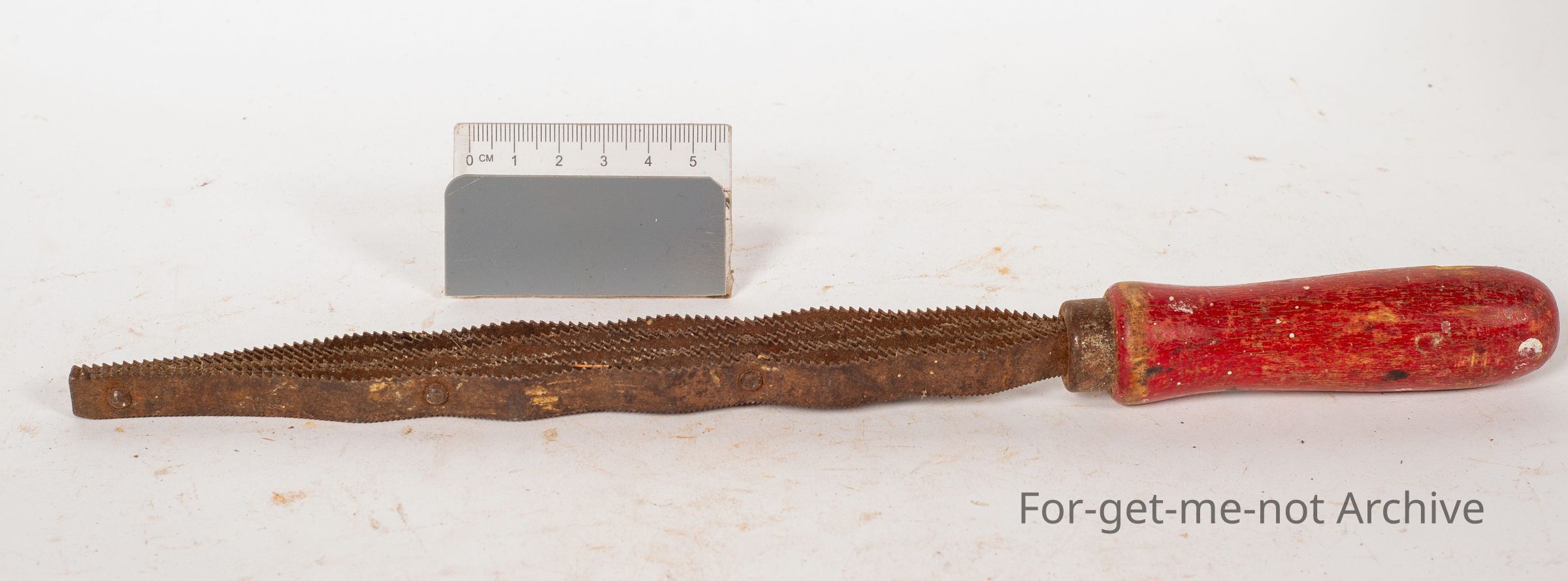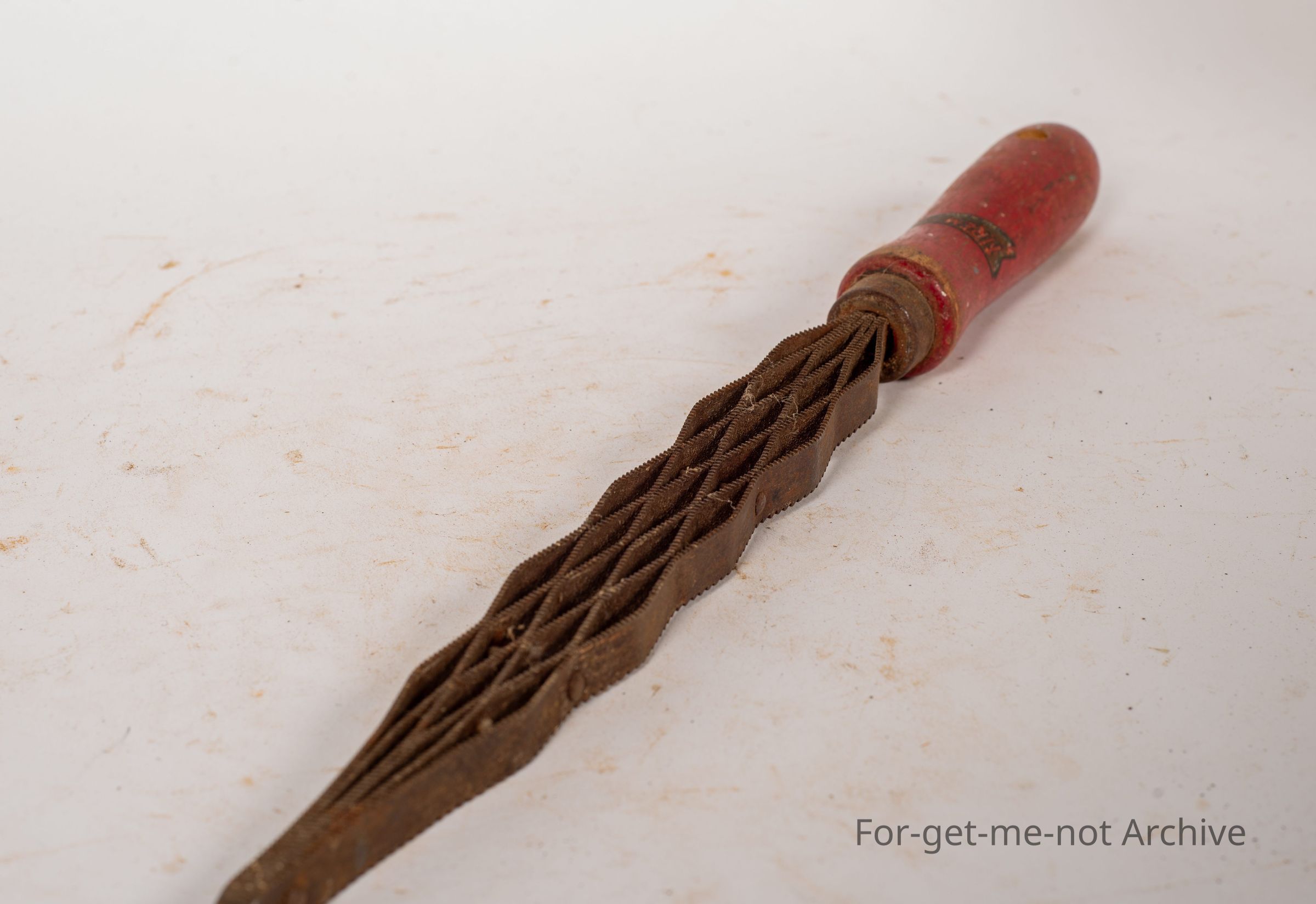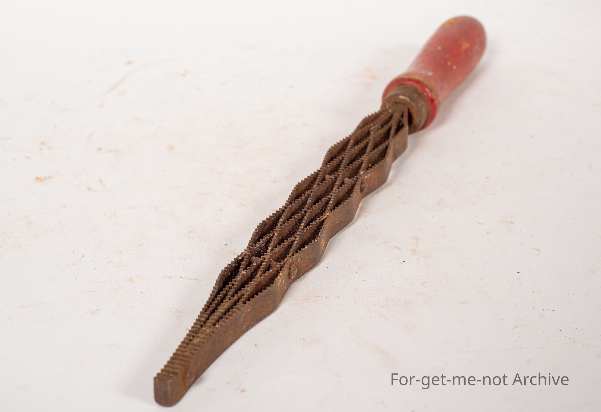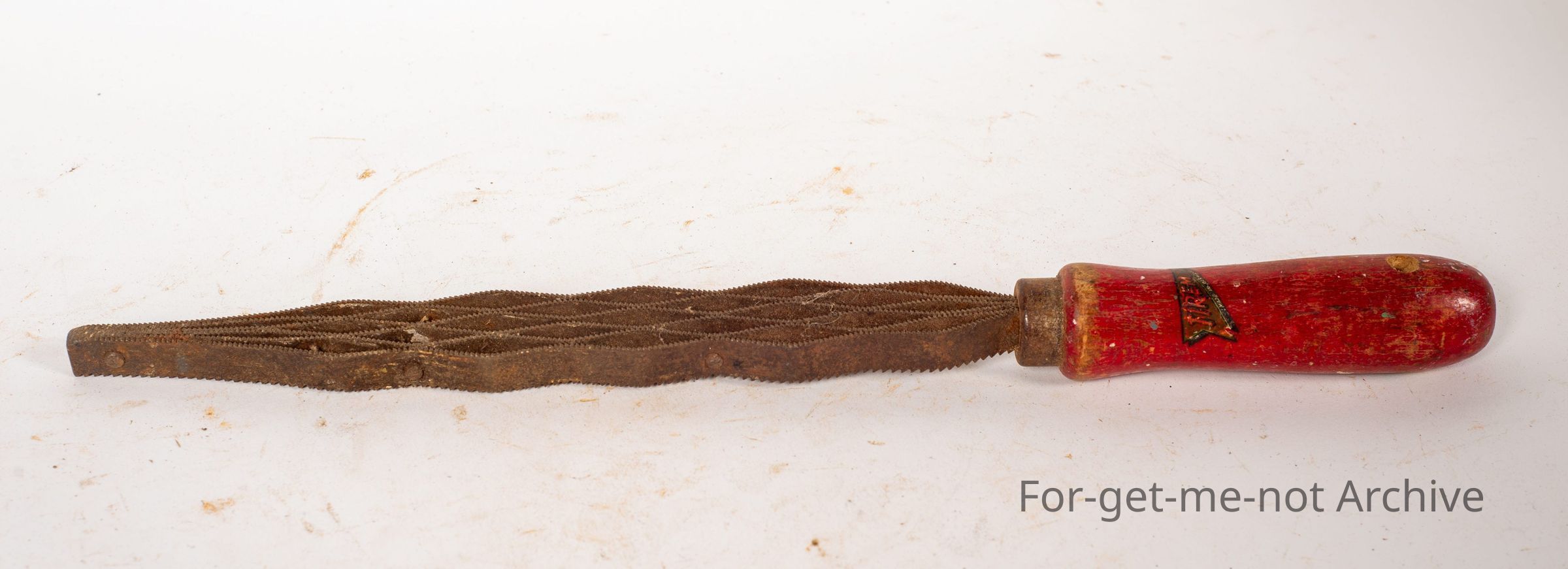 This is a wooden handled, apparatus that would work as a rasp. It has 6 woven blades separated by pieces of metal, all, riveted together at the end. All the blades have different, blade settings or abrasive pieces. An interesting file has a small brand, Irem, made in GermanyCollection