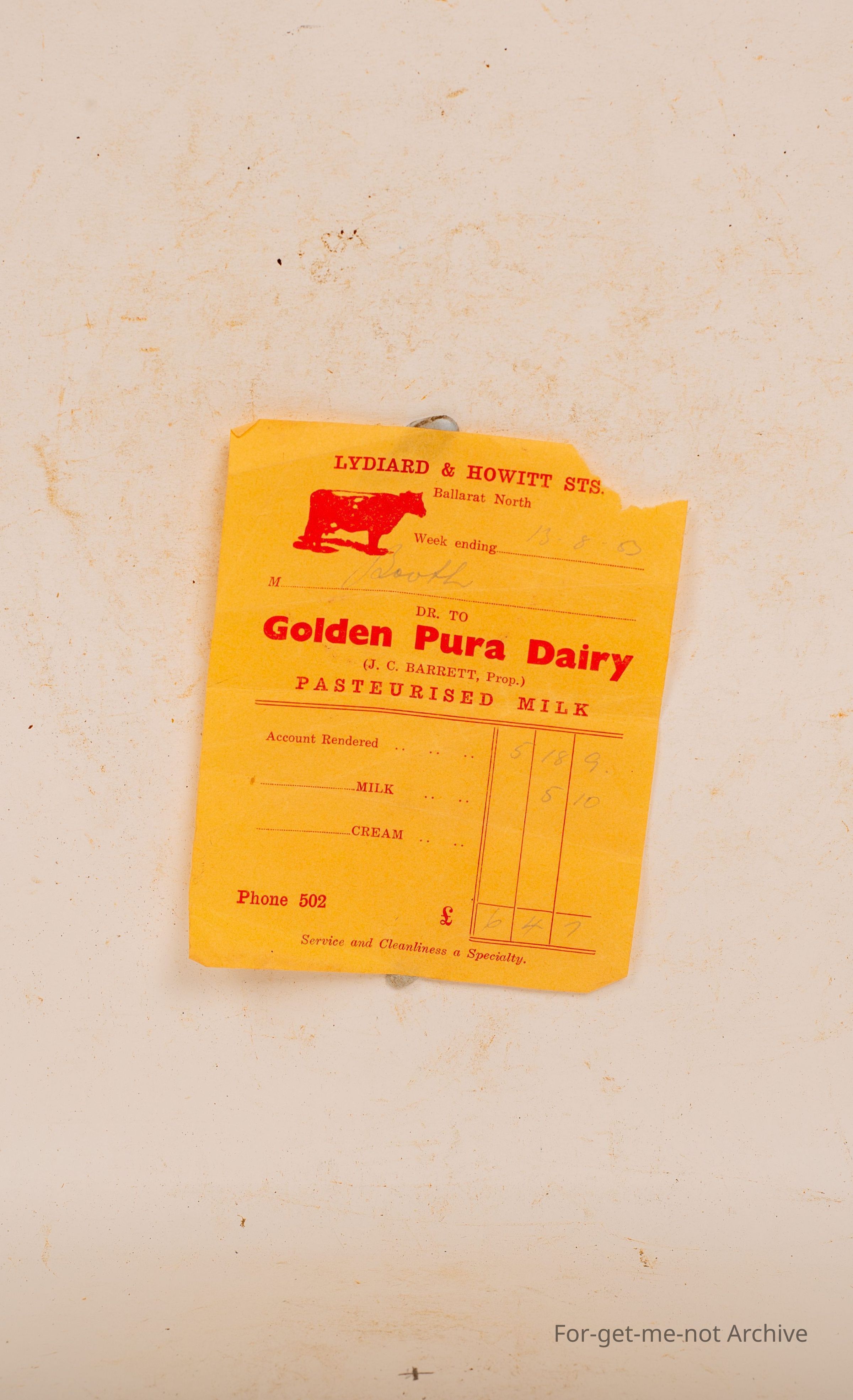 A receipt from Golden Pure Dairy, image of a cow, over situated Lydiard st and Howard Street, Ballarat
