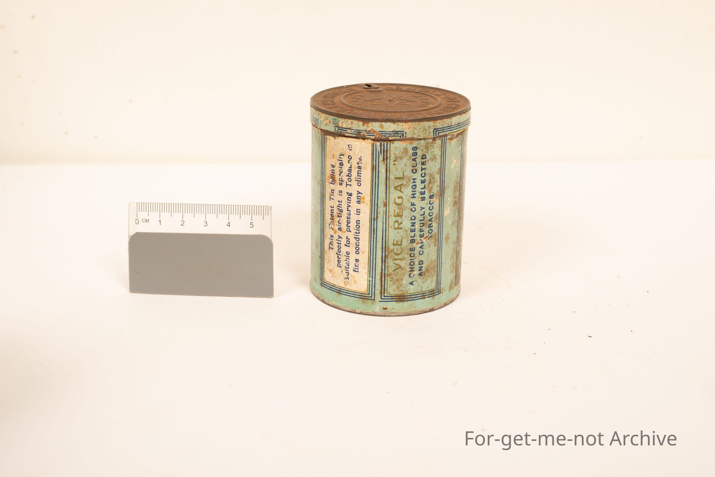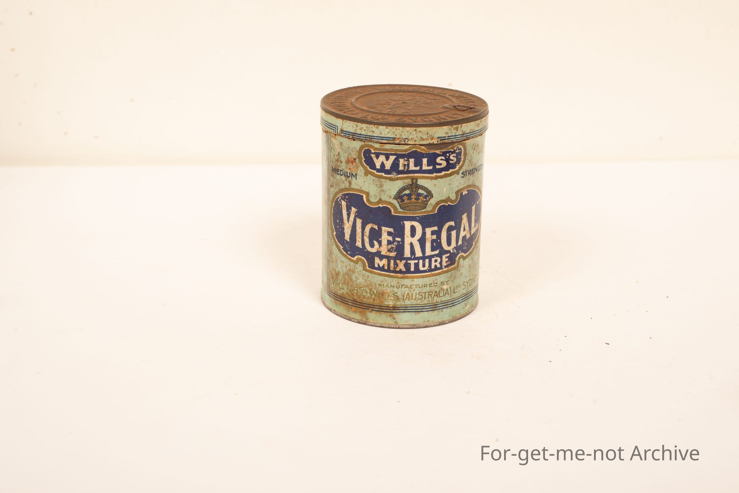 Wills Vice Regal Mixture, cylindrical can, 4 ounce net weight, down a bit in condition, Australasian again, Sydney, w d and h o wool Sydney,