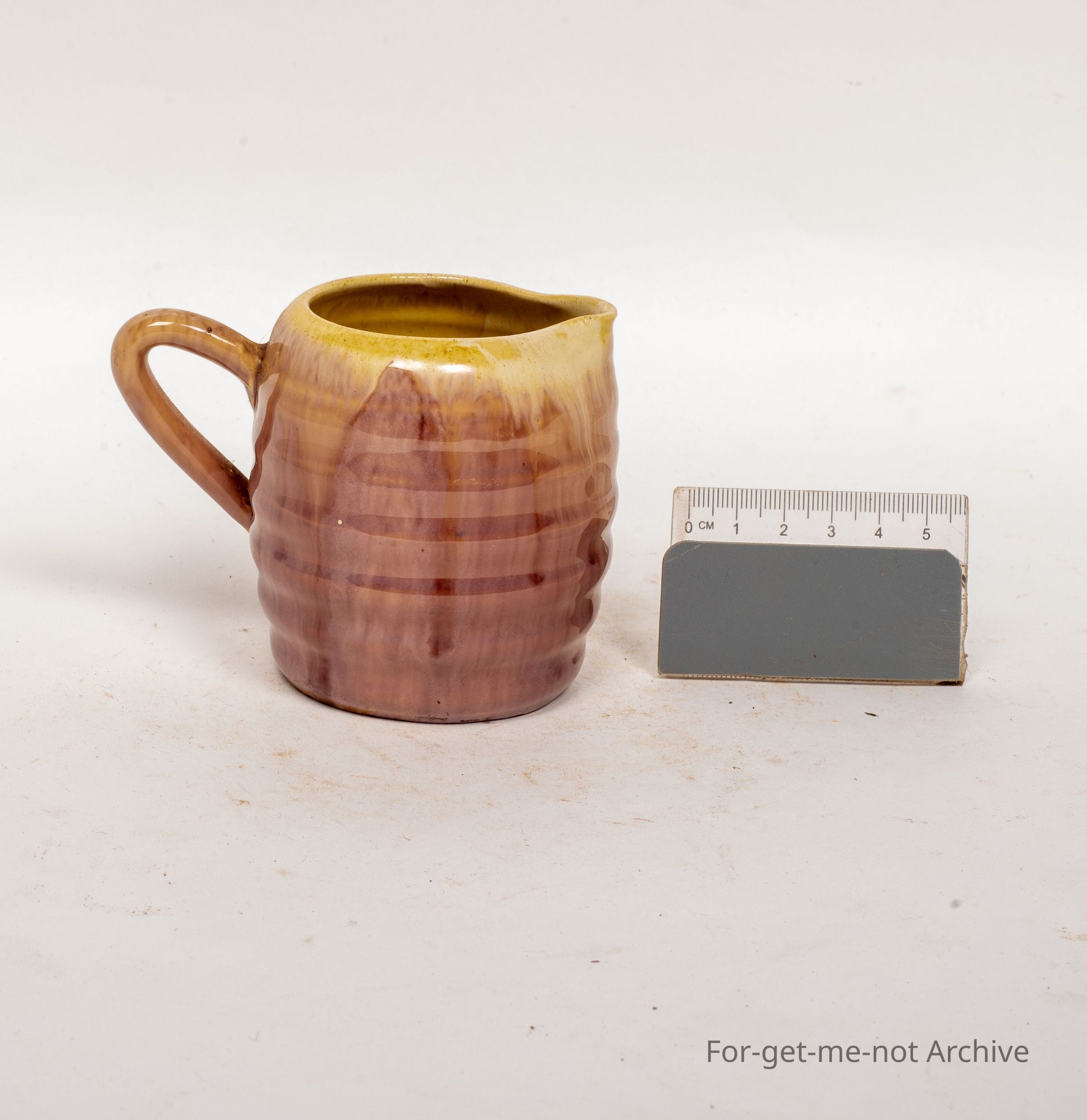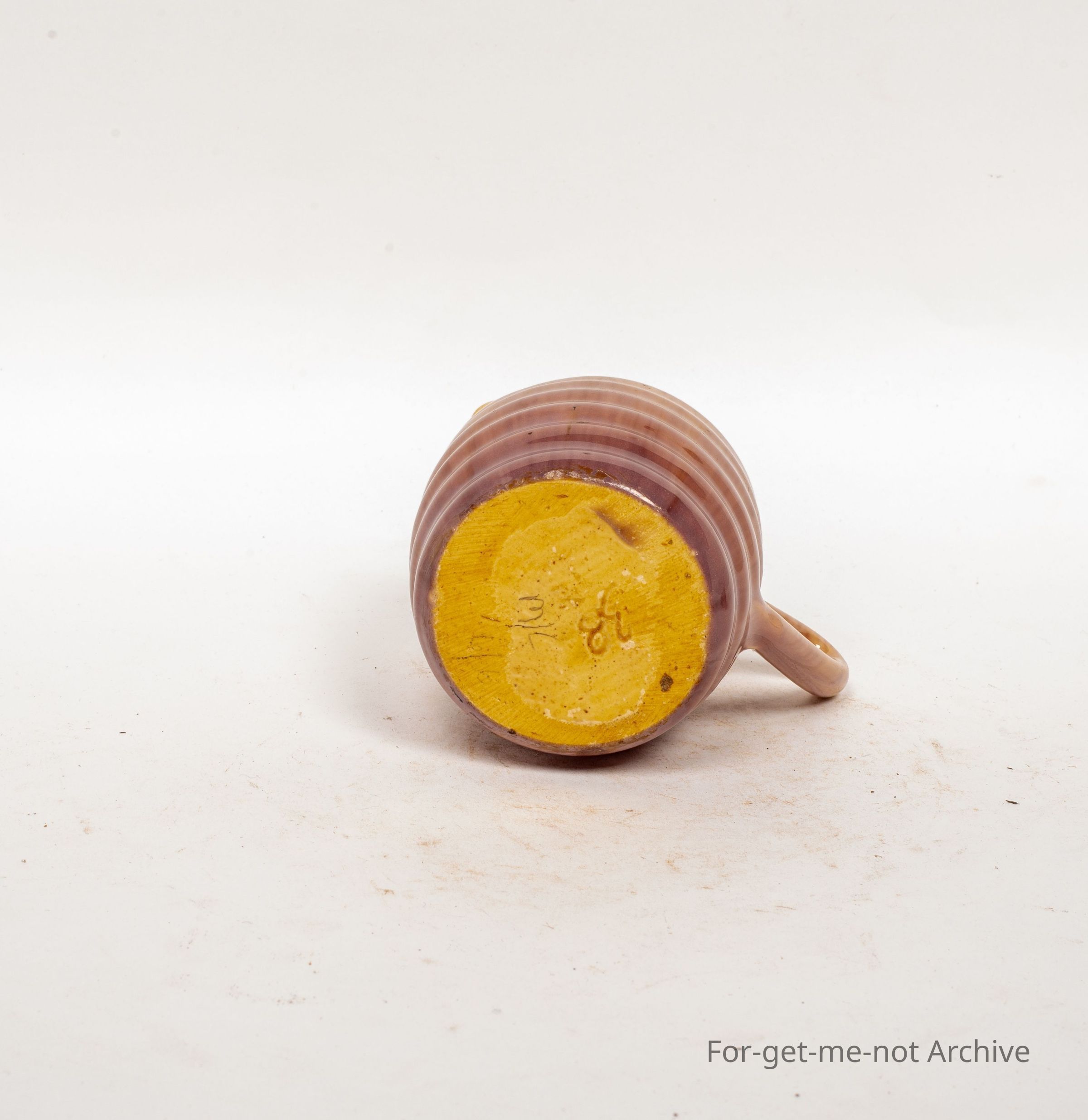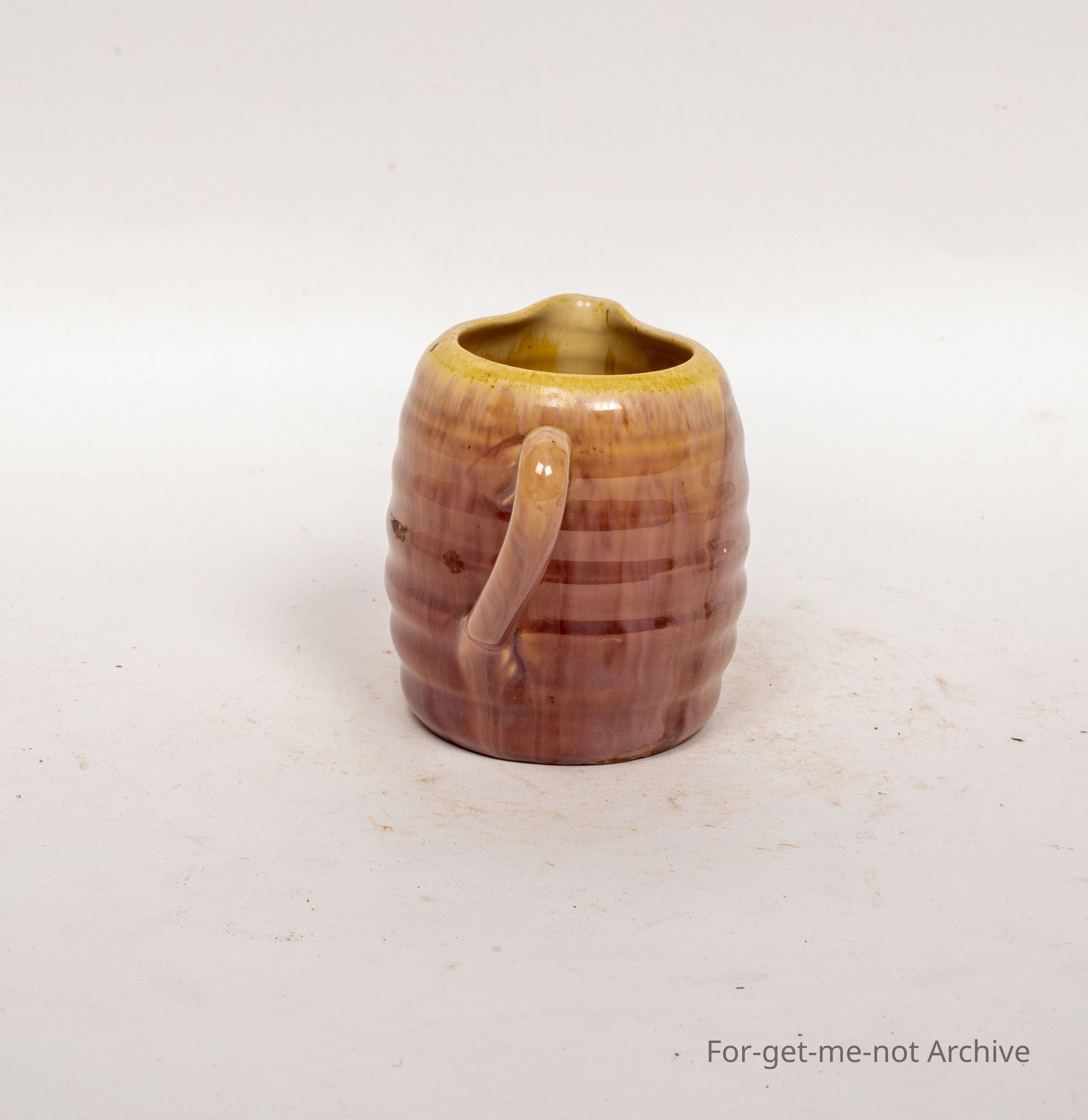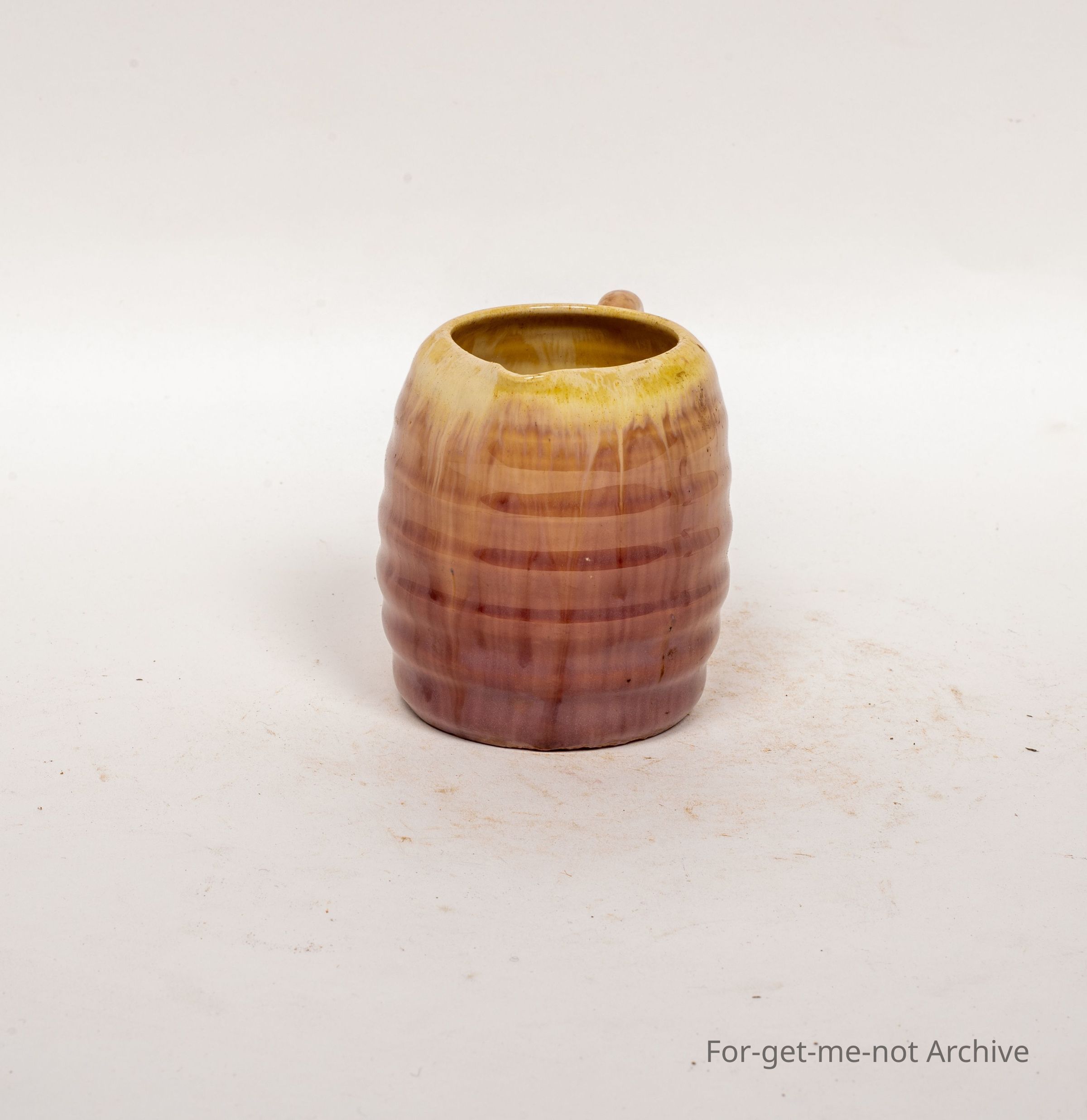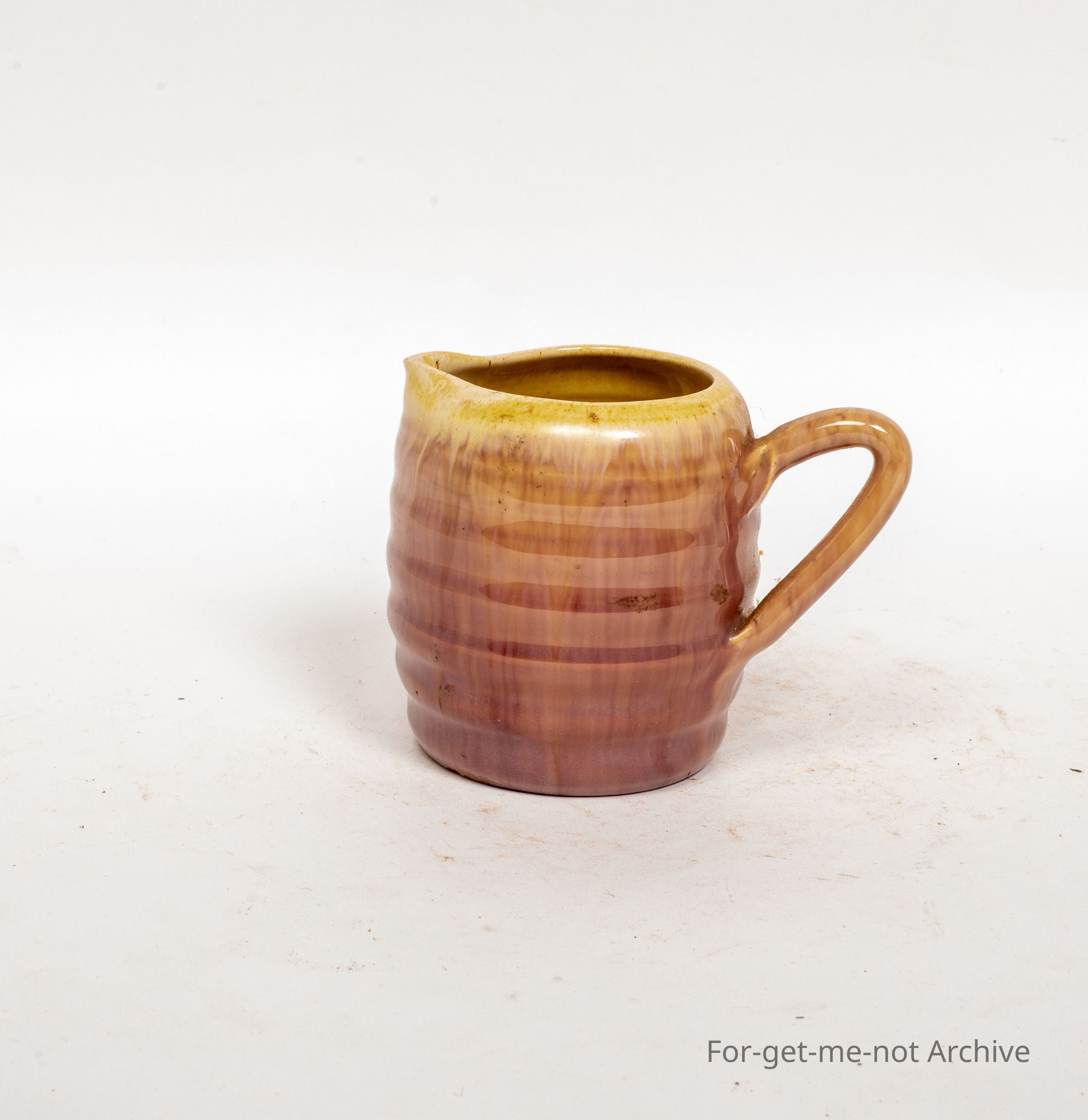 This is a small, like a milk jug, an offset bent handle, heavily ribbed around the outside, a lovely pinky coloured to cream glaze. Possibly Remued