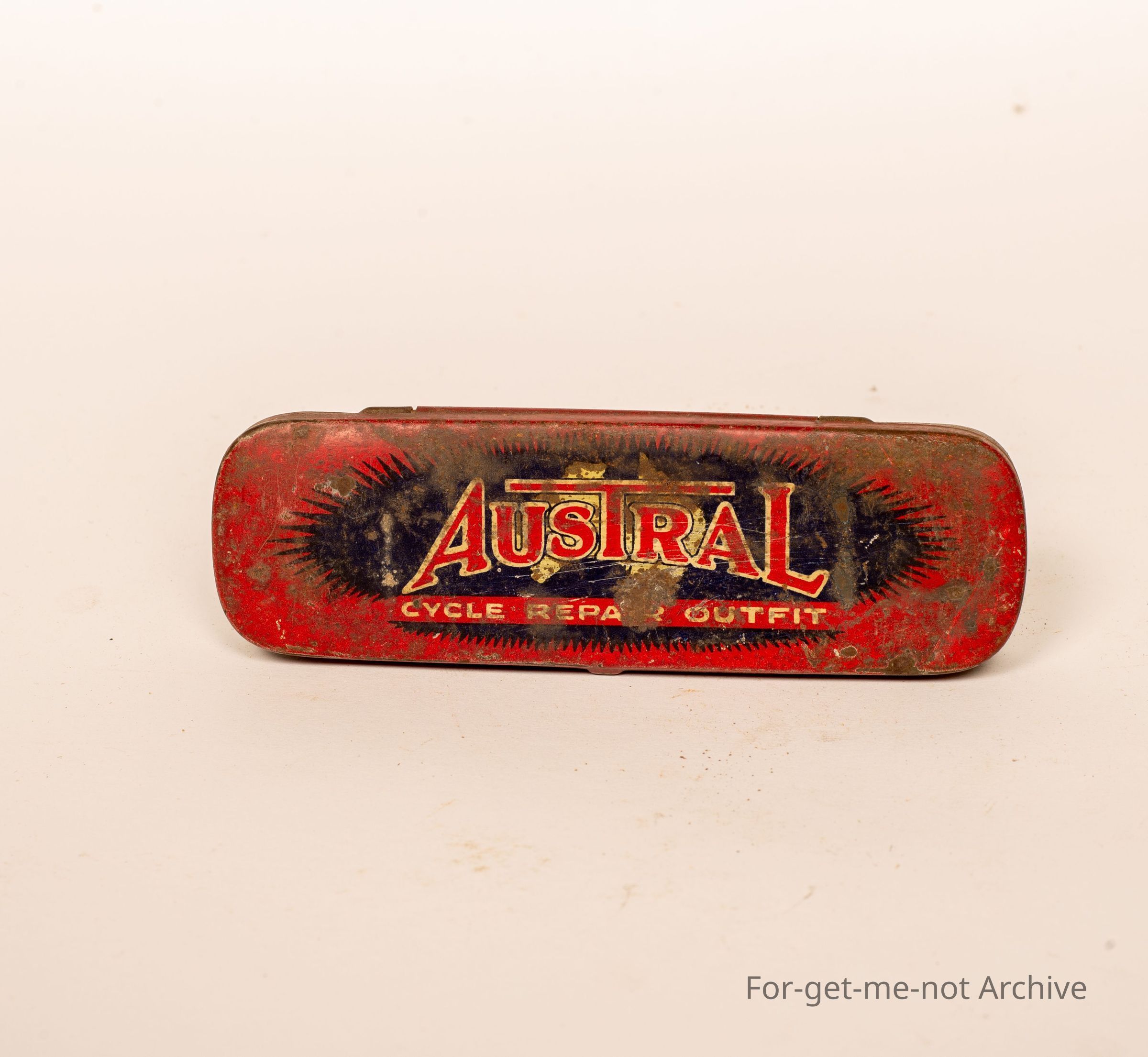A tin for cycle repair punches. this is, a tin put out by Austral who were bicycle manufacturers. This is the Austral Cycle Repair Outfit. Not in good condition, but a hard tin to find.Collection