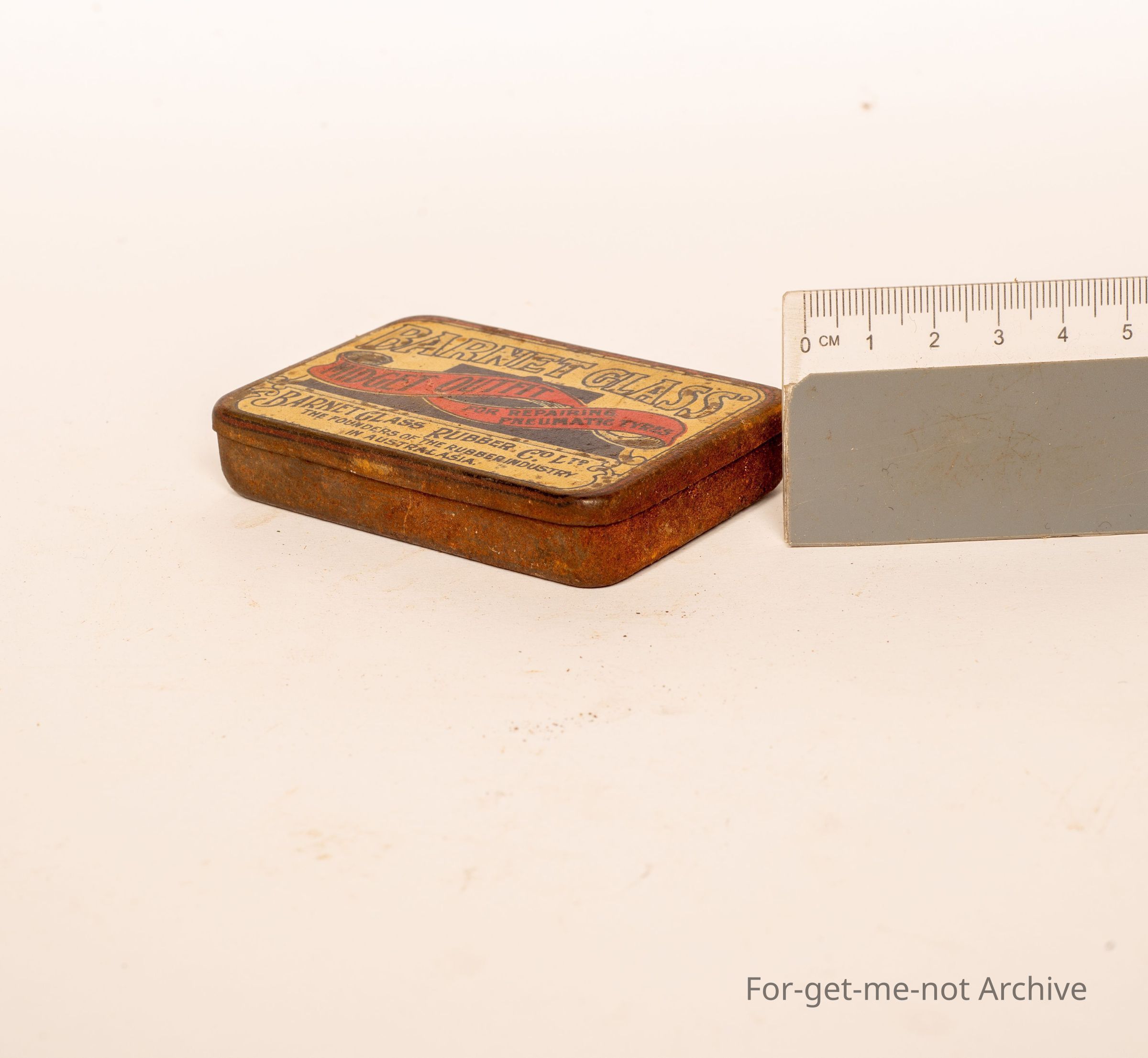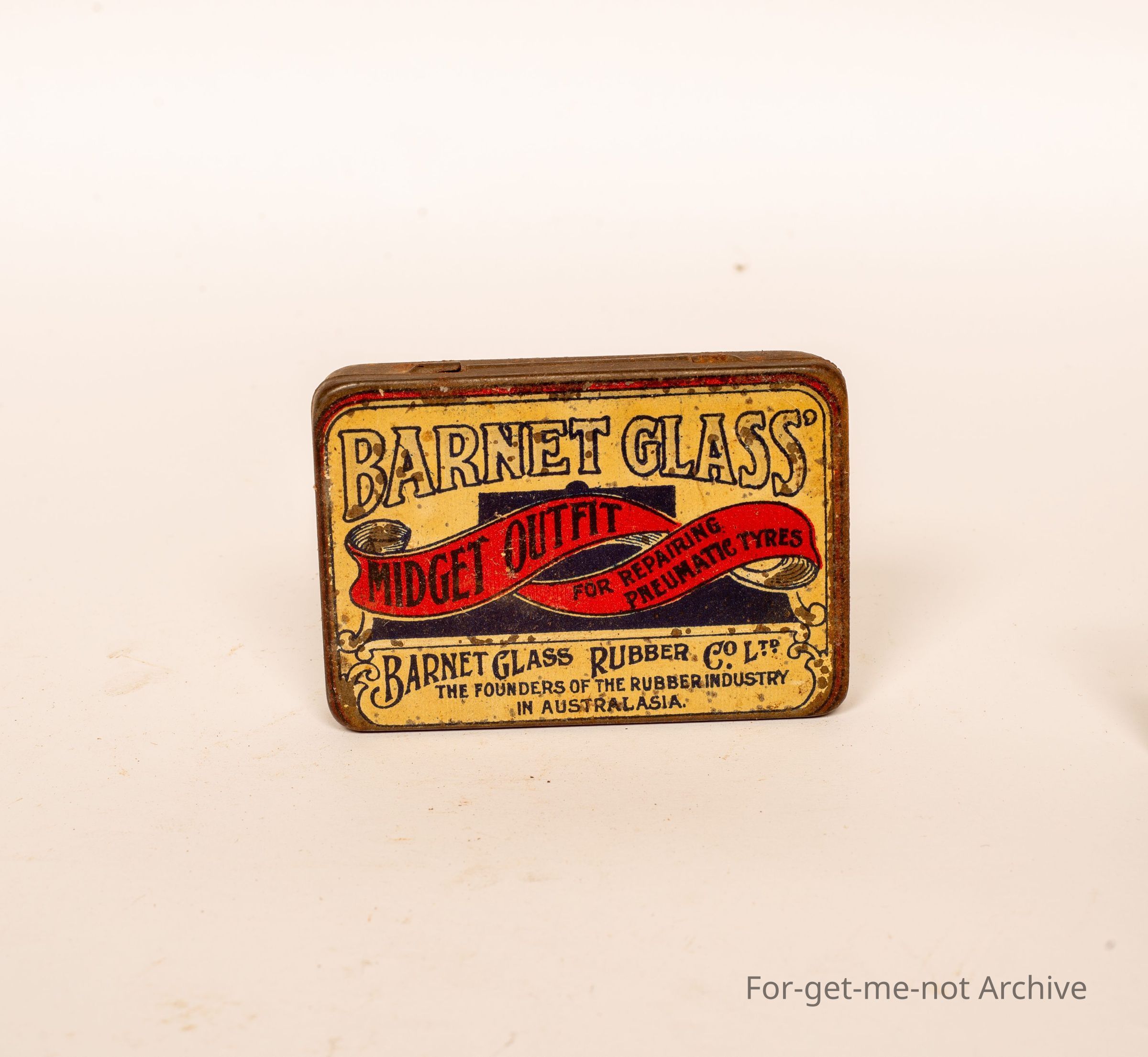 A Cycle repair tin, this tin is from Barnet Glass, reportedly the first rubber company in Australia. This tin is in reasonable condition for its age. Says on the tin founders of the rubber industry in Australasia.Collection