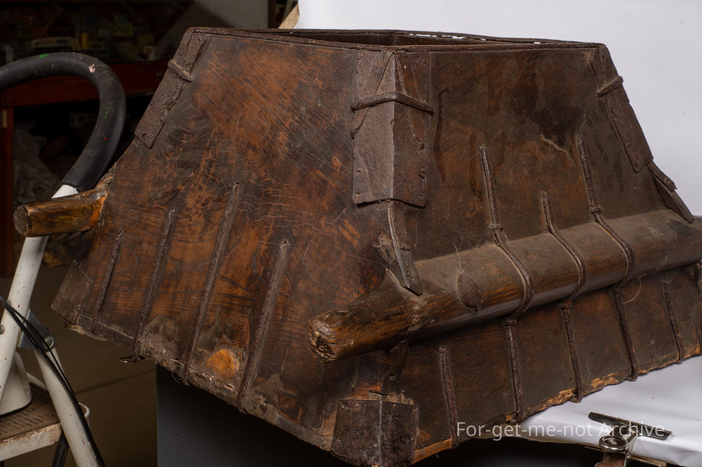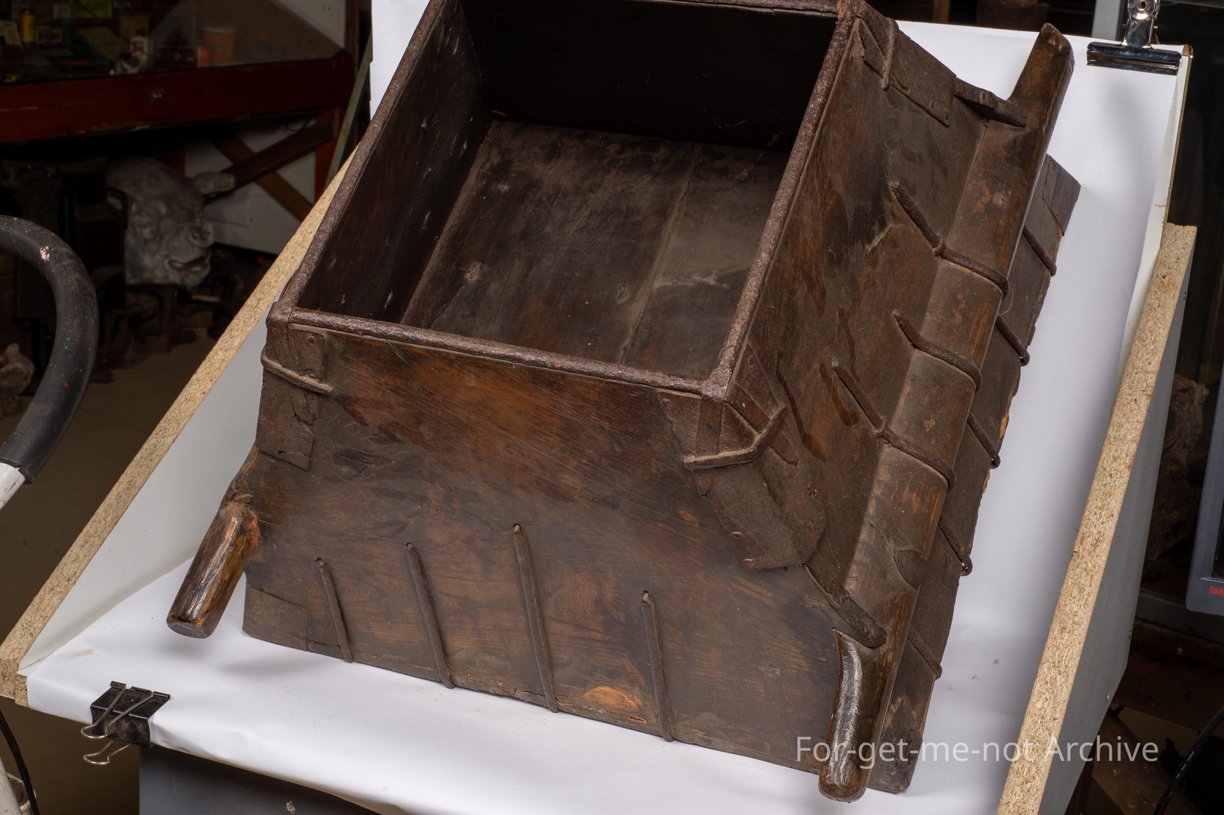This is from the Chinese collection. this is a Chinese RICE measurer. This is described as a merchant's measure. Quite a large piece, handle either side. 2 people would have carried this. It is braced with, strips of metal on the corners and on the handles right across the base to strengthen. Quite an interesting piece.Collection
