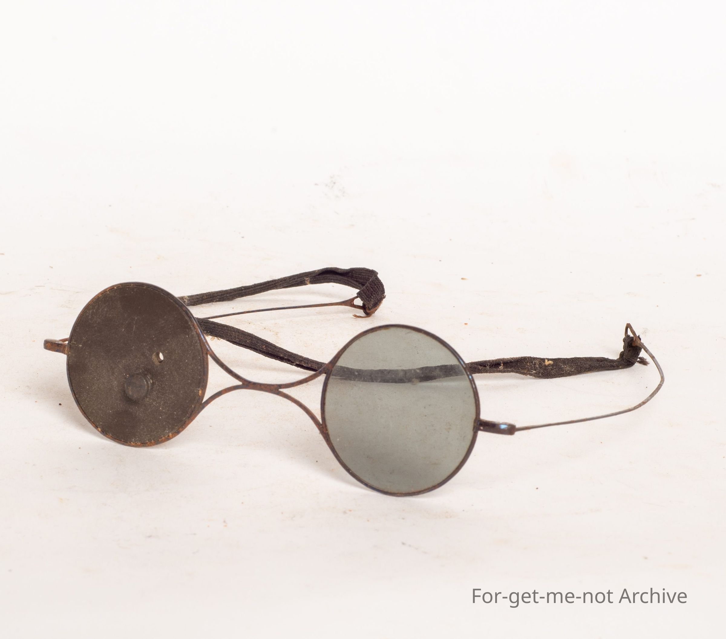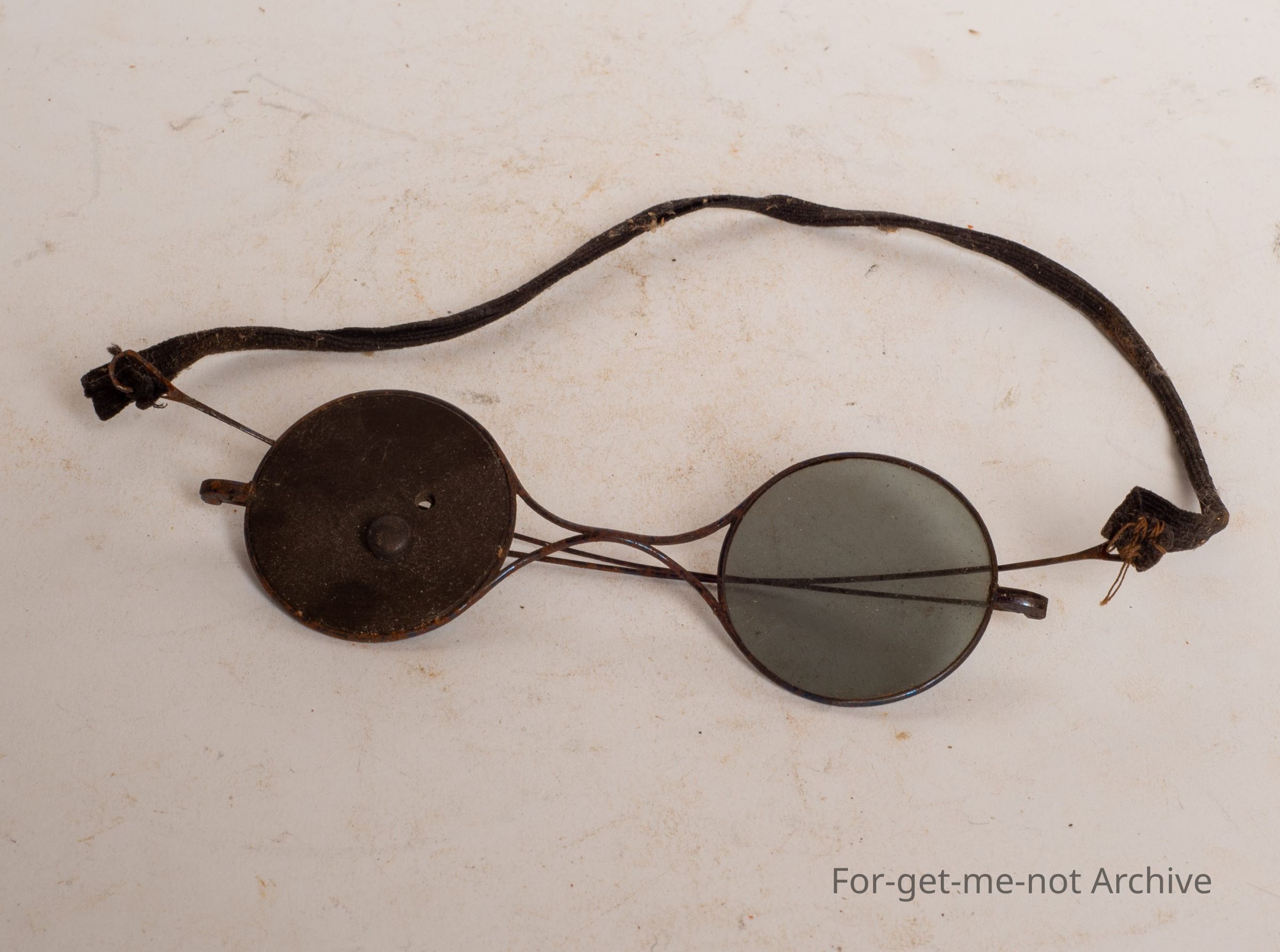 This is a pair of rifle shooters glasses. Plenty of a lens in one side. In the other side, there is a metal plate that turns around with a peephole so that you're only looking at a specific spot, delicately made, quite rare. The peephole varies as to the distance over which you're shooting.Collection