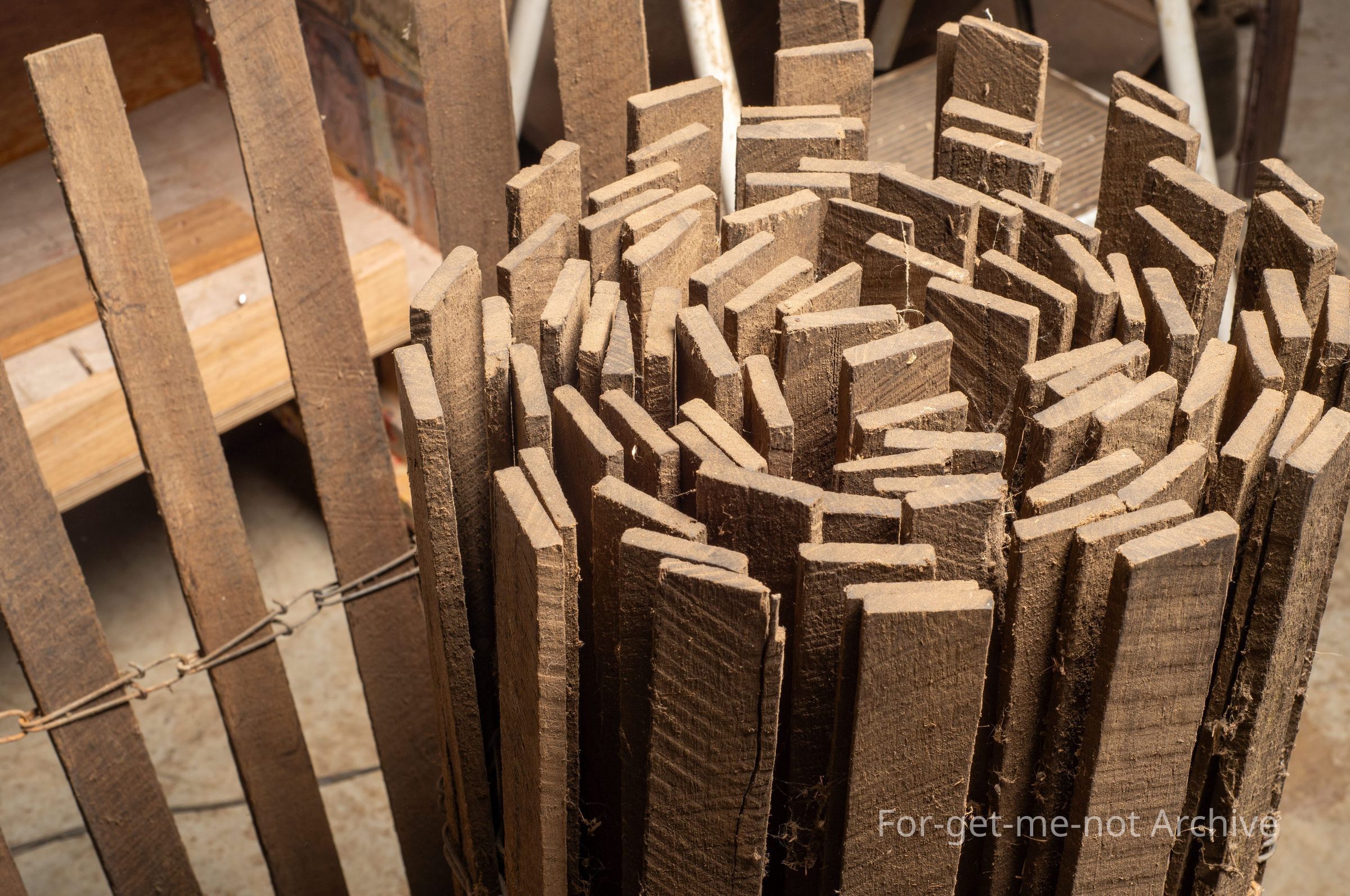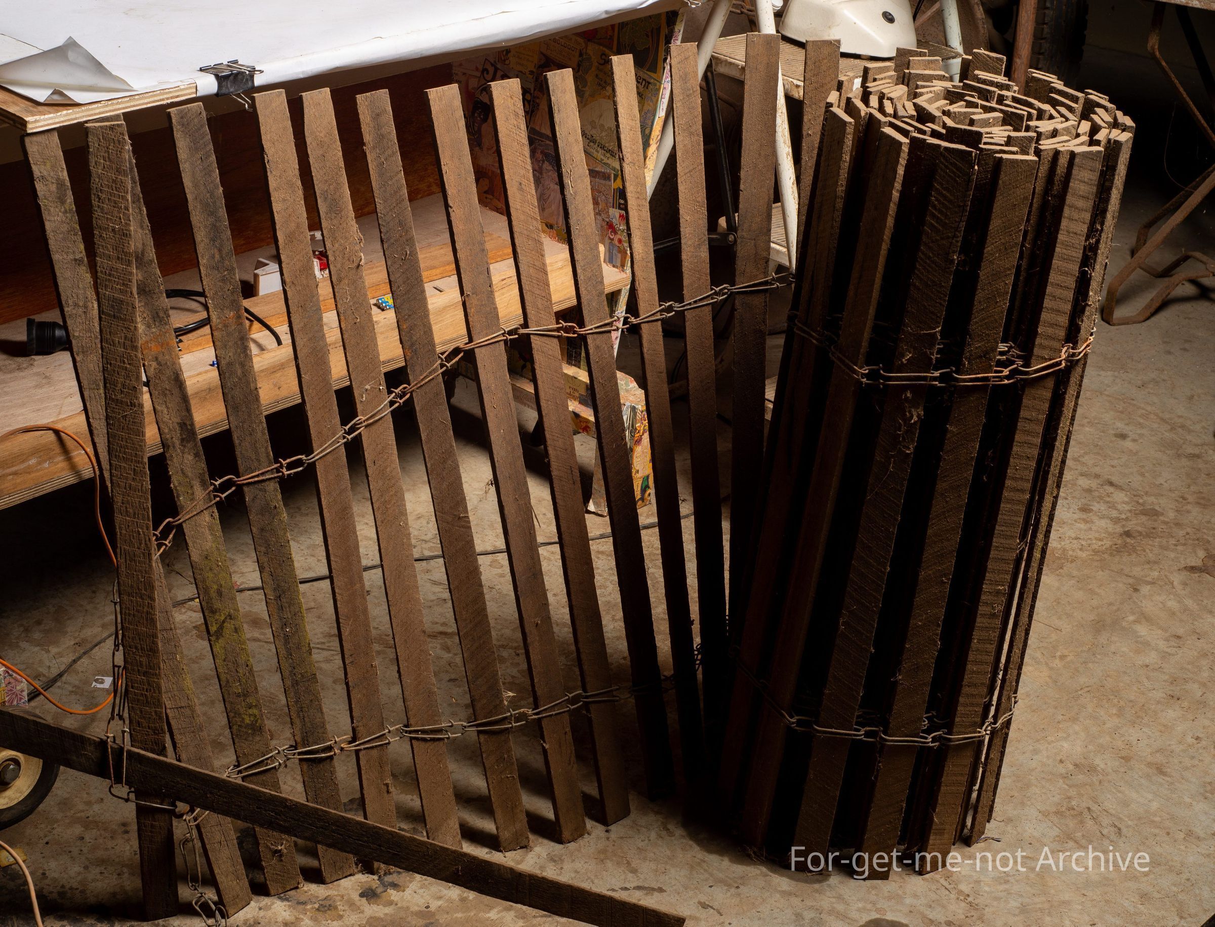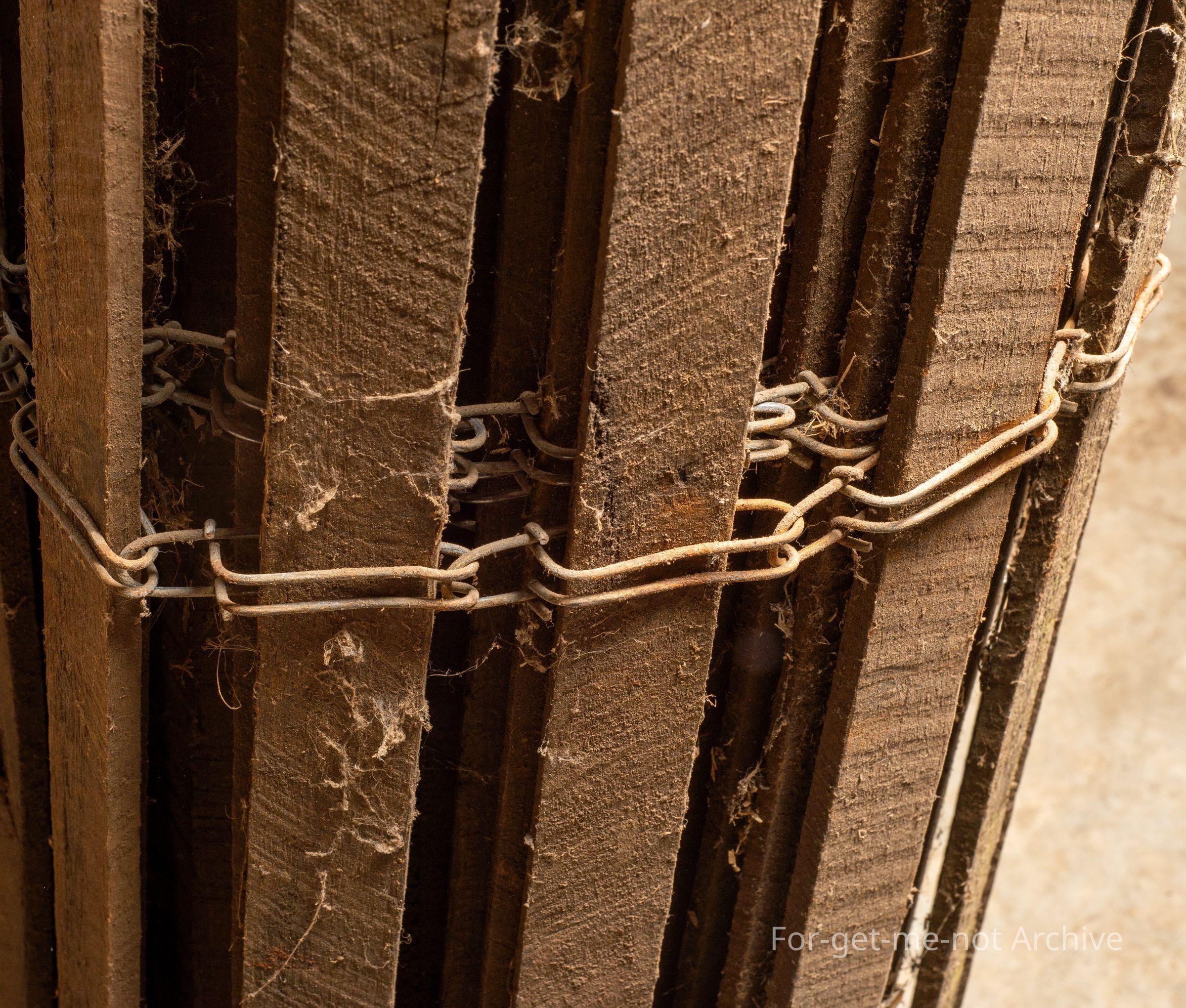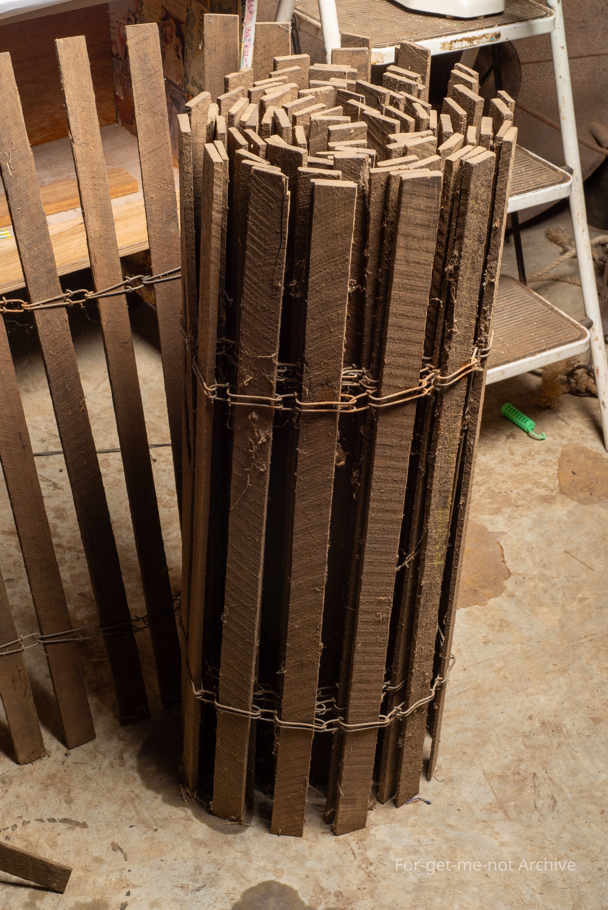 This is a set a roll of sheep hurdle made of slats through large wire links at the top and the bottom. These were commonly used by drovers to keep the sheep contained at night. Also, quite often used by, landholders to, supplement, downtrodden sheep yards as a quick fix barrier.Collection