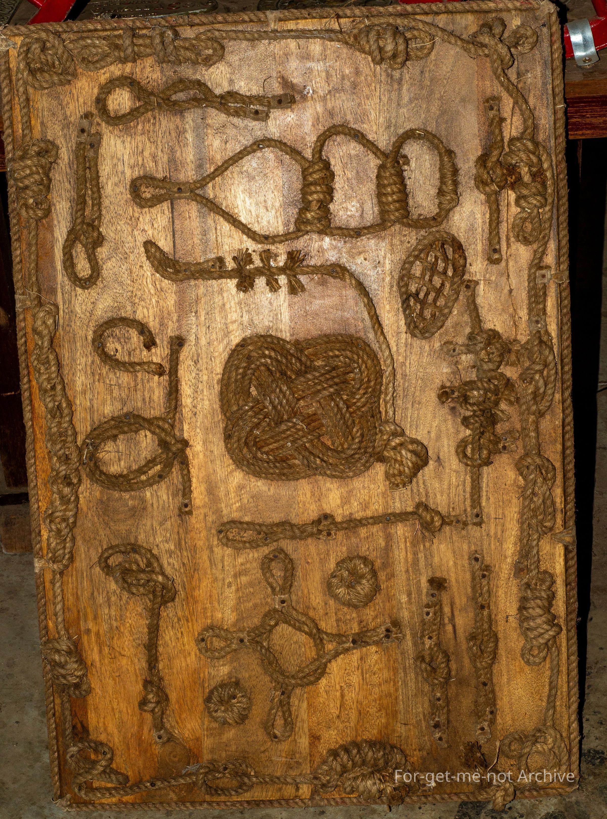 This is a board, with all the different knots used in marine, for boats, etcetera. Once upon a time, this would have been part of a sailor's training to learn all these respective knots. This is quite an interesting board of the knot making technique.Collection