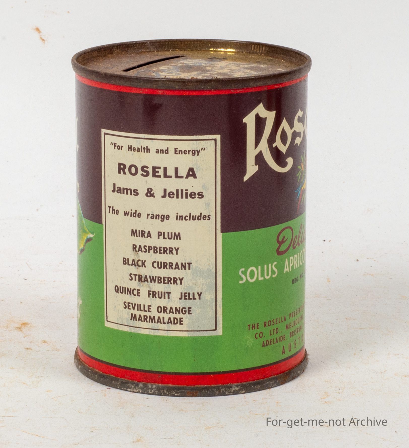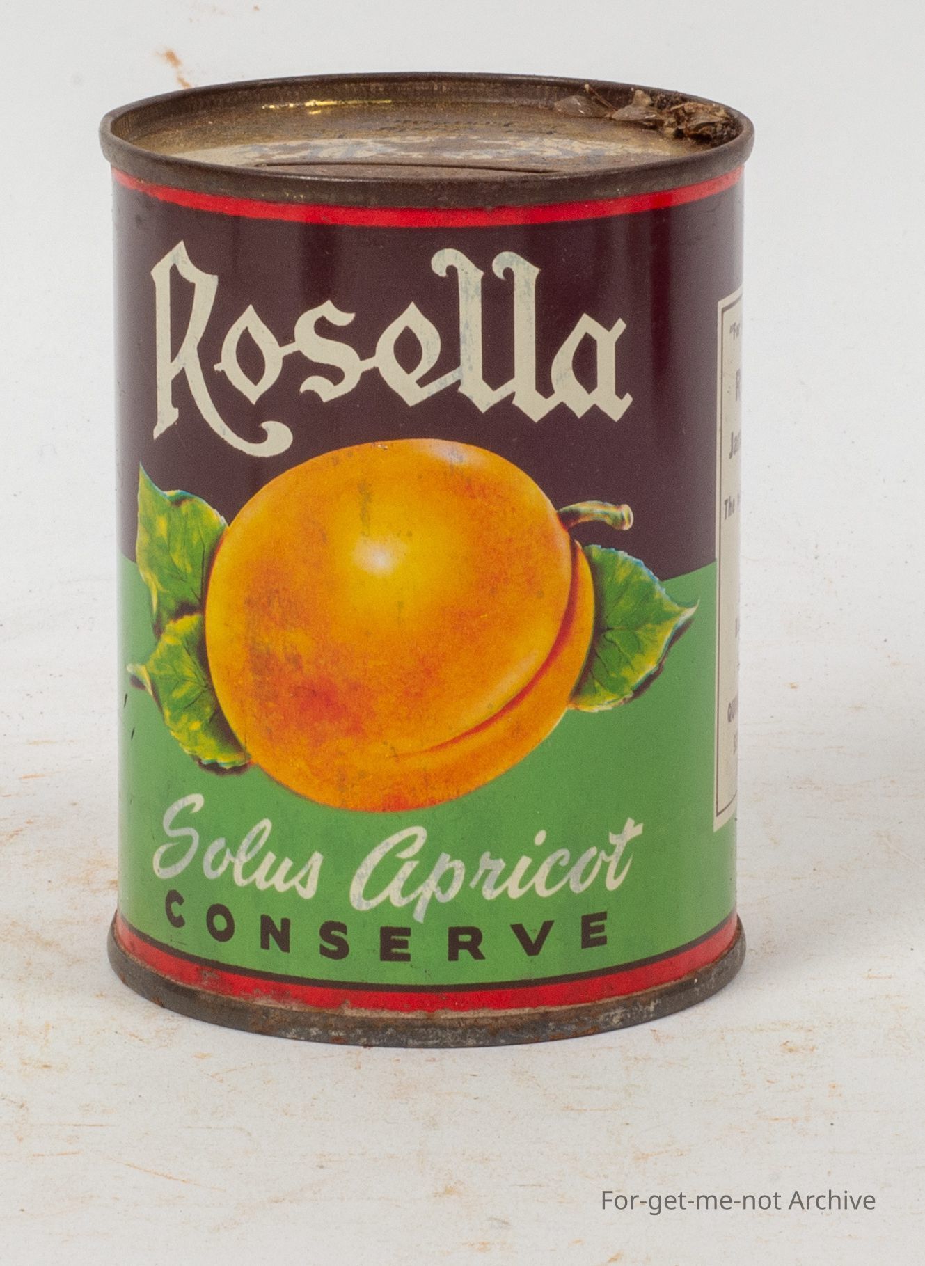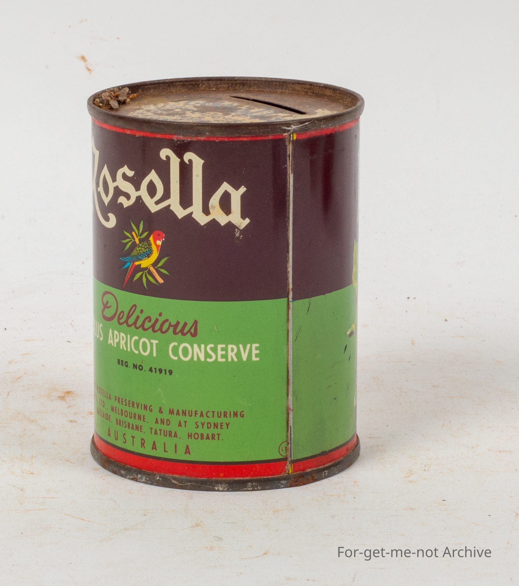 Turned into money box, says Bank of Rosella Products, AUstrlia, very good order, image of apricot on front