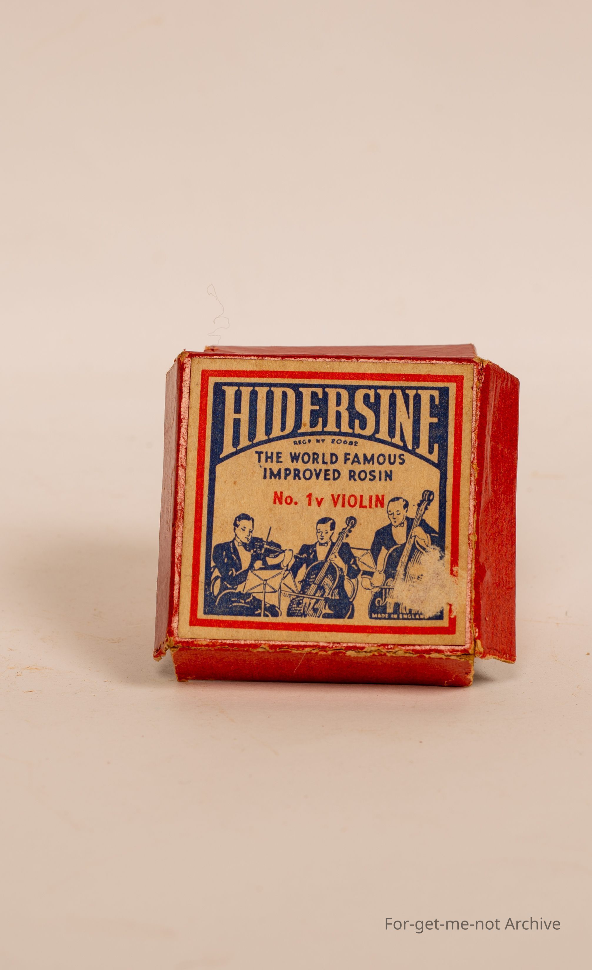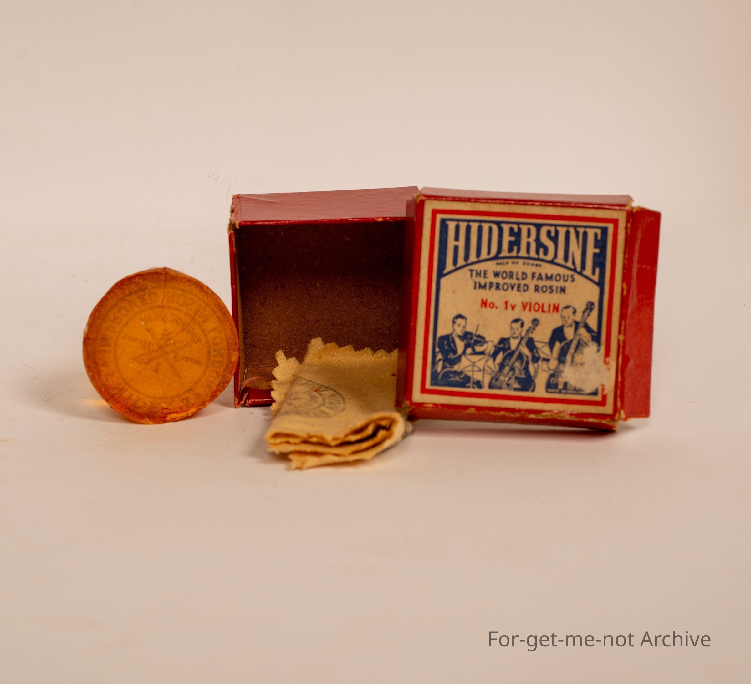 A box of Hindersine, the world famous improved rosin for number 1 violin with the cake of rosin and a cloth in the box