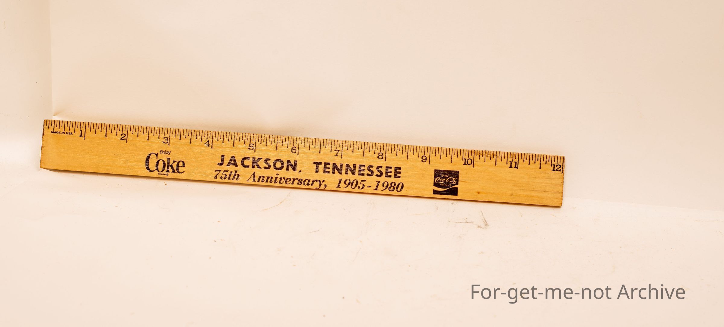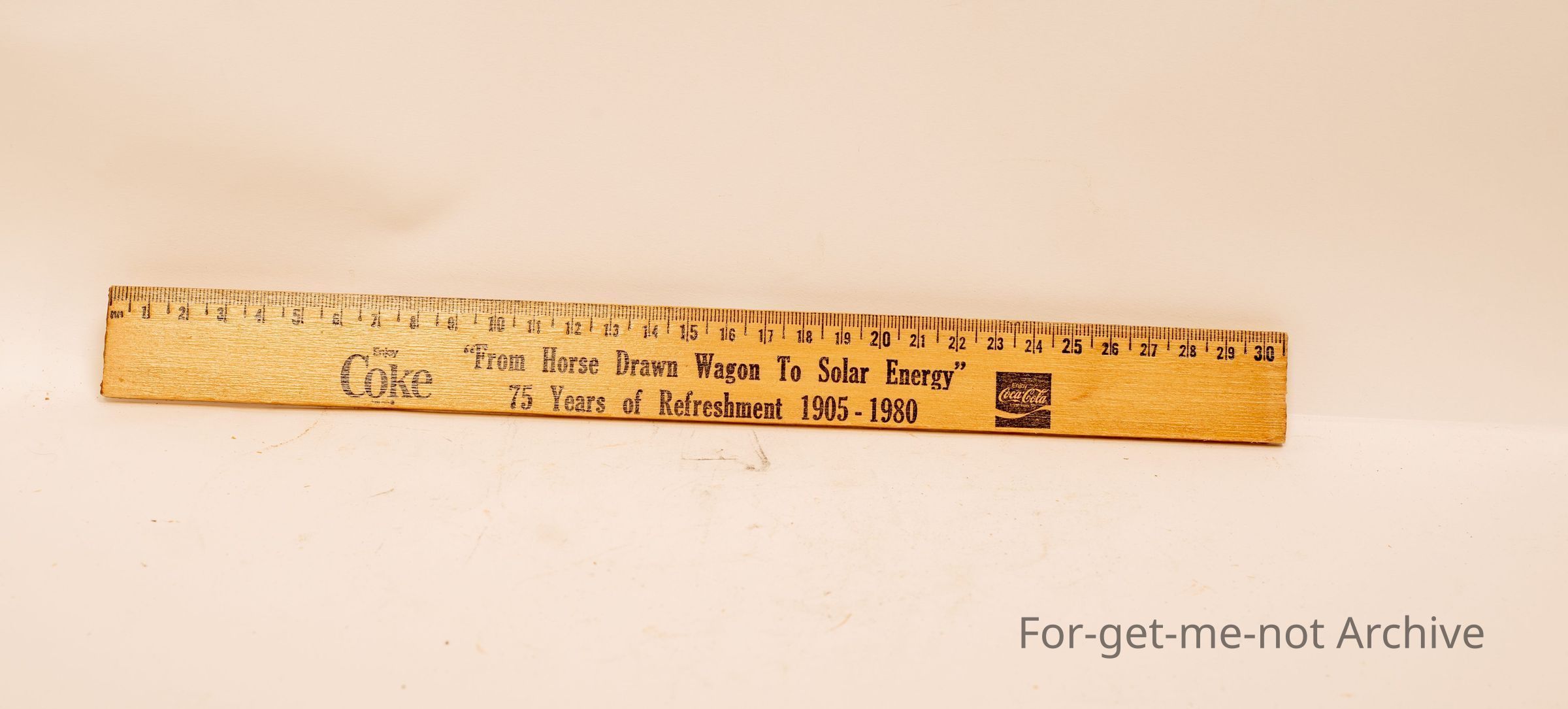 Wooden advertising ruler, "Coca Cola from horse drawn wagon to solar energy", 1905 to 1980"