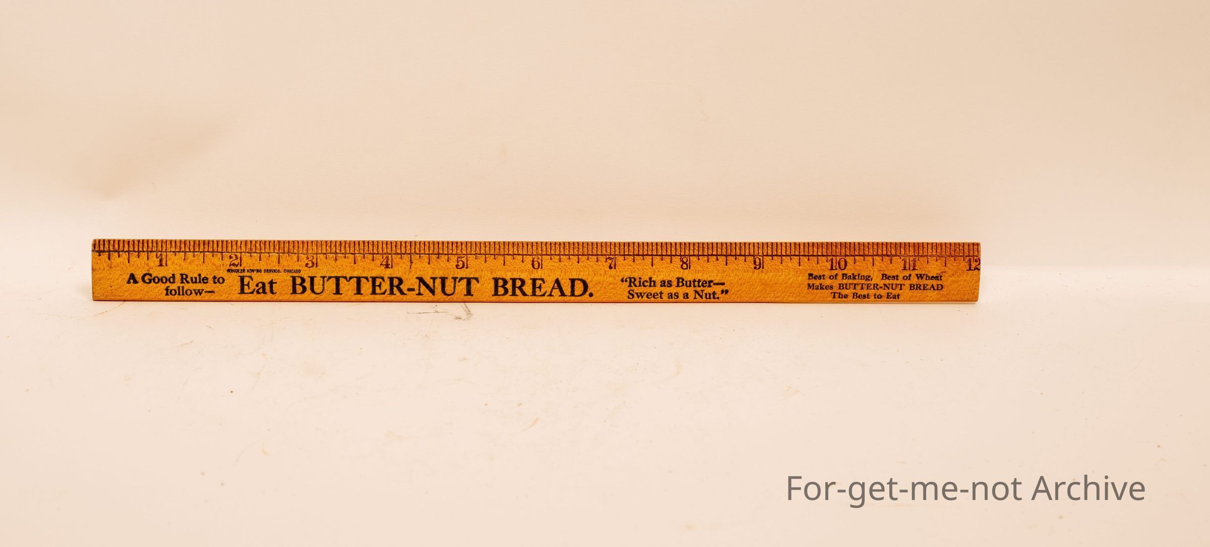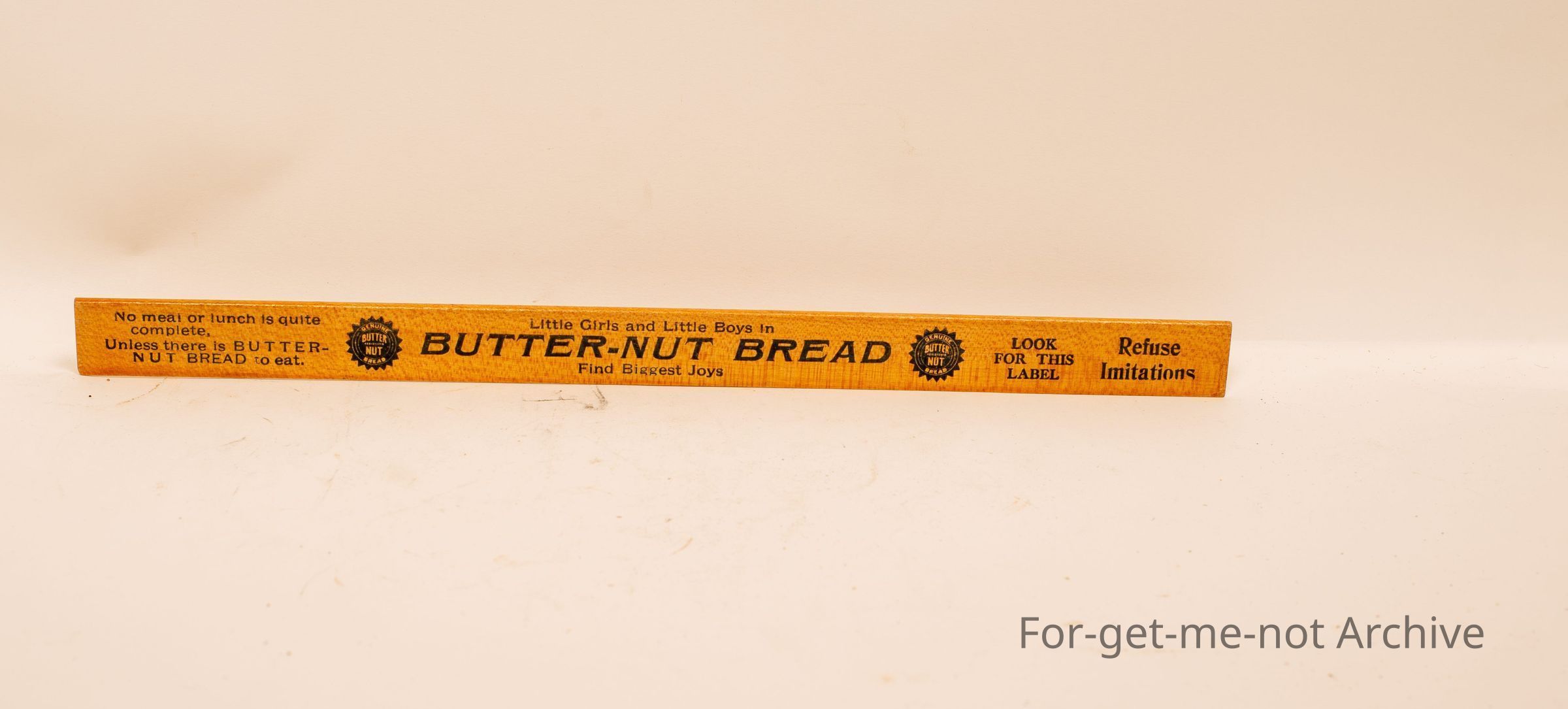 wooden ruler, advertising, "Butter-nut Bread. Look for this label, refuse imitations."