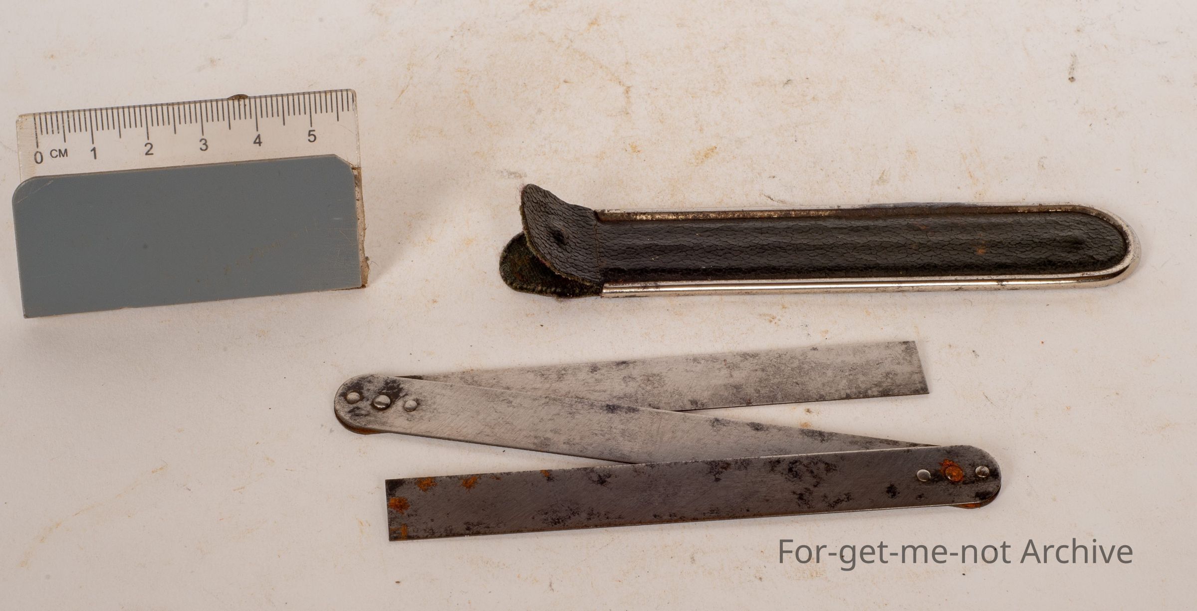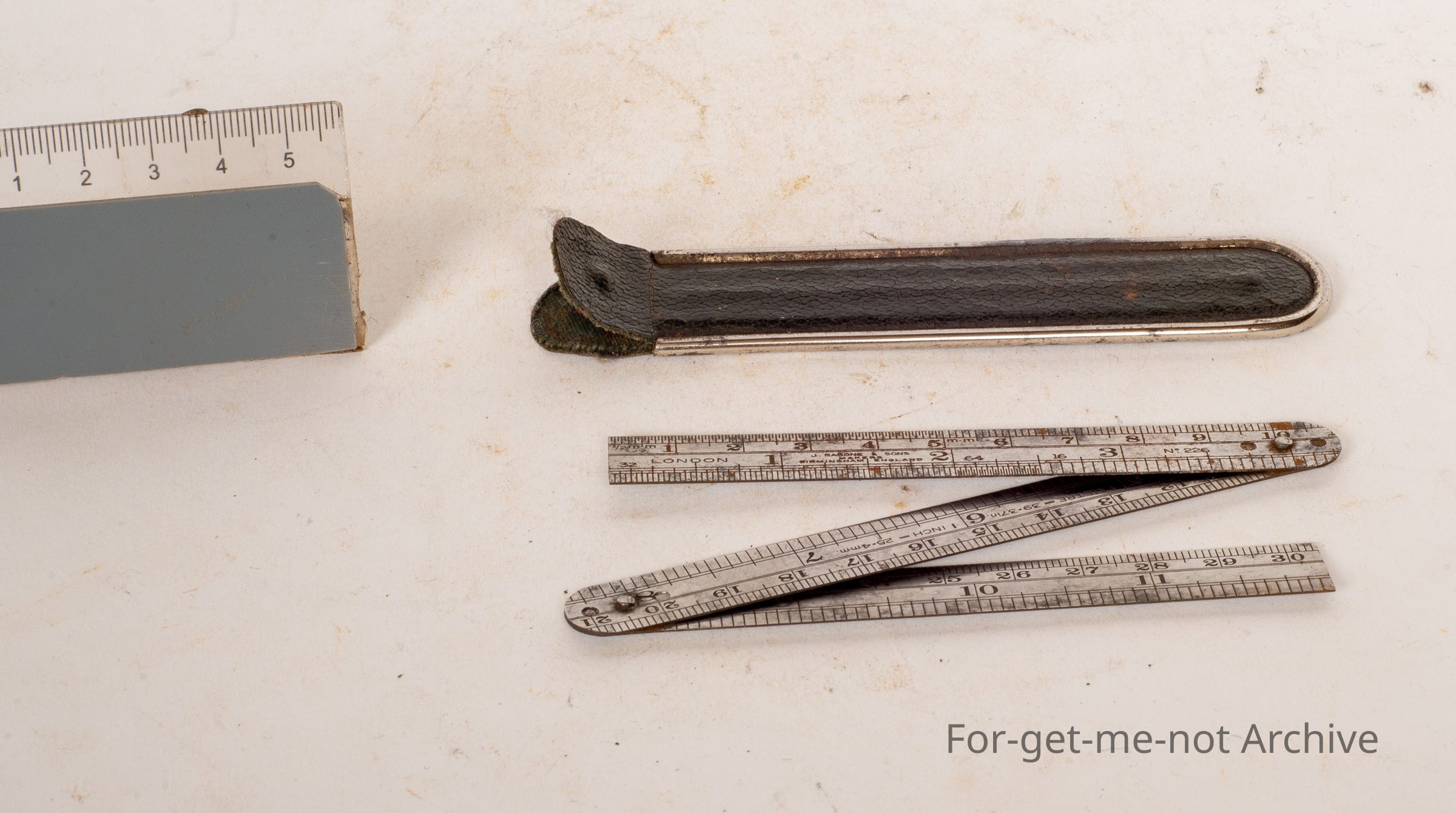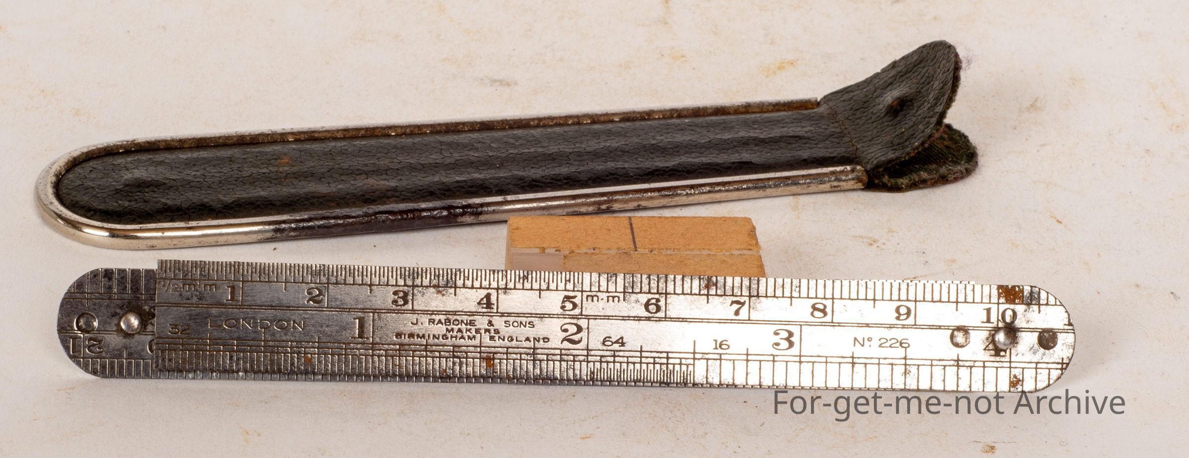 This is a beautiful little Rabone, metric and imperial measure. A ruler folds out into 4 sections, stamped Rabone and a sun Birmingham, a little leather sleeve that even has a metal, surround on it. Beautifully made.Collection