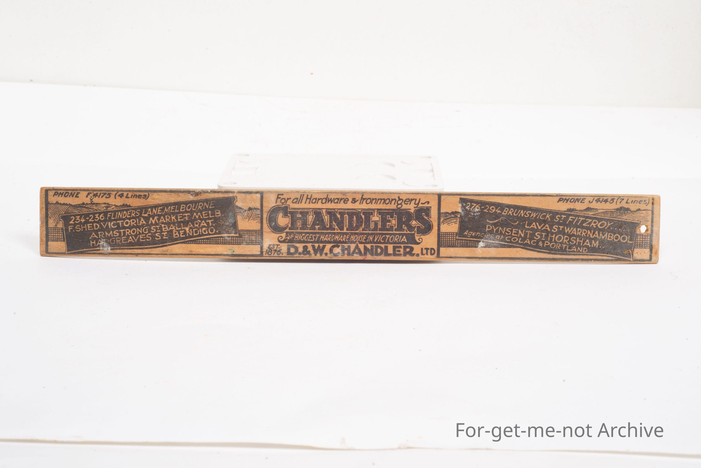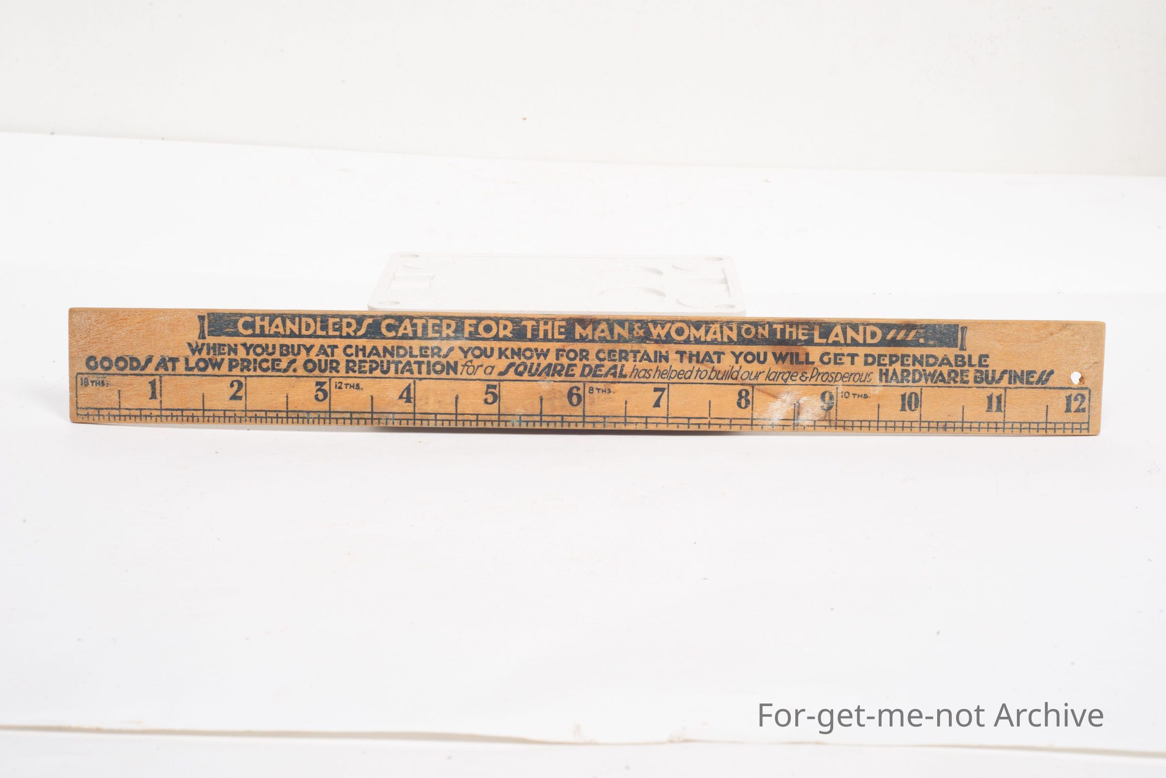 Another wooden ruler. This time advertising Chandlers for the man and woman on the land. Twelve inch ruler, from DW Chandler,